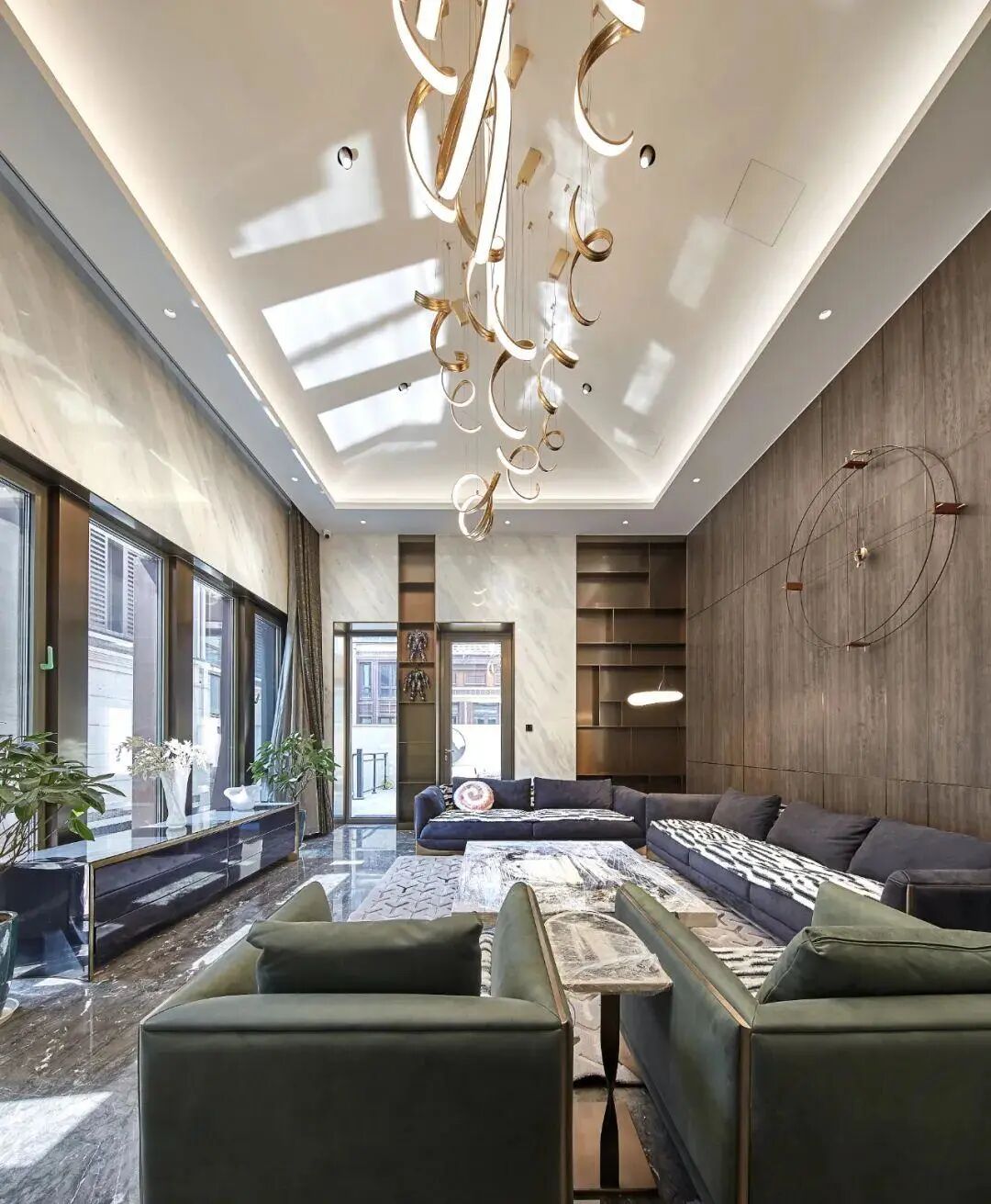 客厅色调整体以木饰面与石材搭配点缀金属。颜色与颜色之间的过渡,空间划分松弛有序,错落有致,既有艺术的发散,也有秩序的严谨,既是各自表现,又是和谐统一。