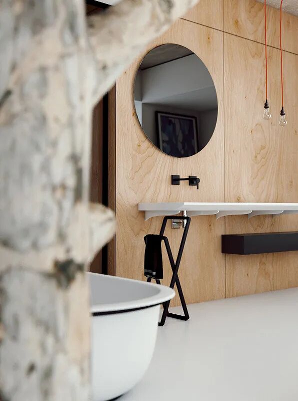 Ell台盆下是Agape的“X”毛巾架,由深色橡木制作而成,透过简单的线性设计,达成稳定的支撑结构,方便拿取。Ell台盆和“X”毛巾架相互协调,错落有致,合理地利用了空间布局。整体搭配平衡且有呼吸感,让人们对洗漱空间有了深刻的记忆点。