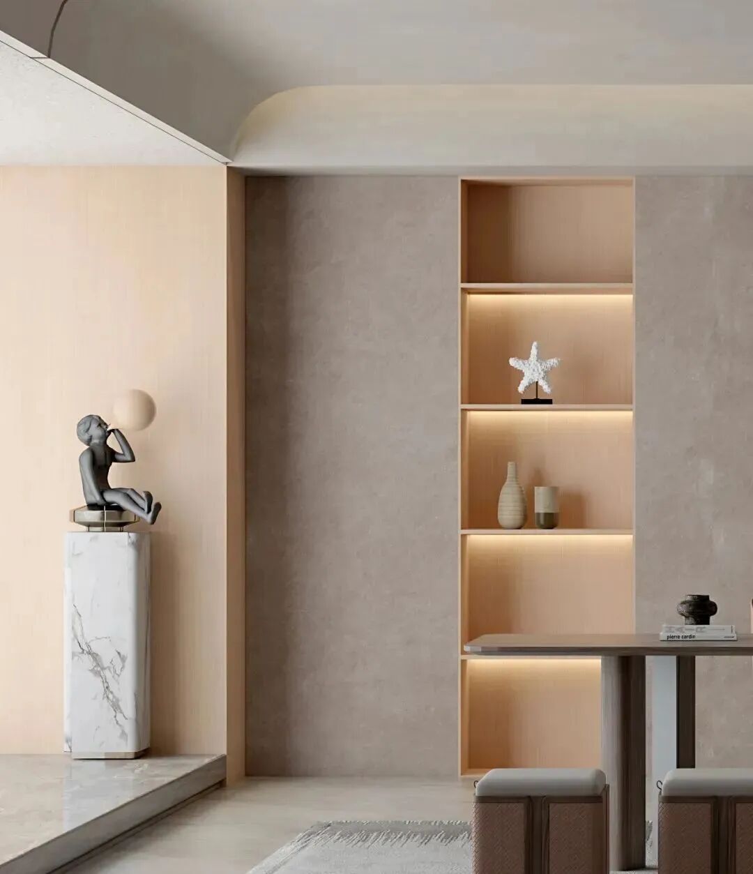 易施工:石材壁纸产品厚度不超过1mm,柔韧性强、可弯曲,易于异形(如圆柱、弧形等)施工并节省成本及人工费用。