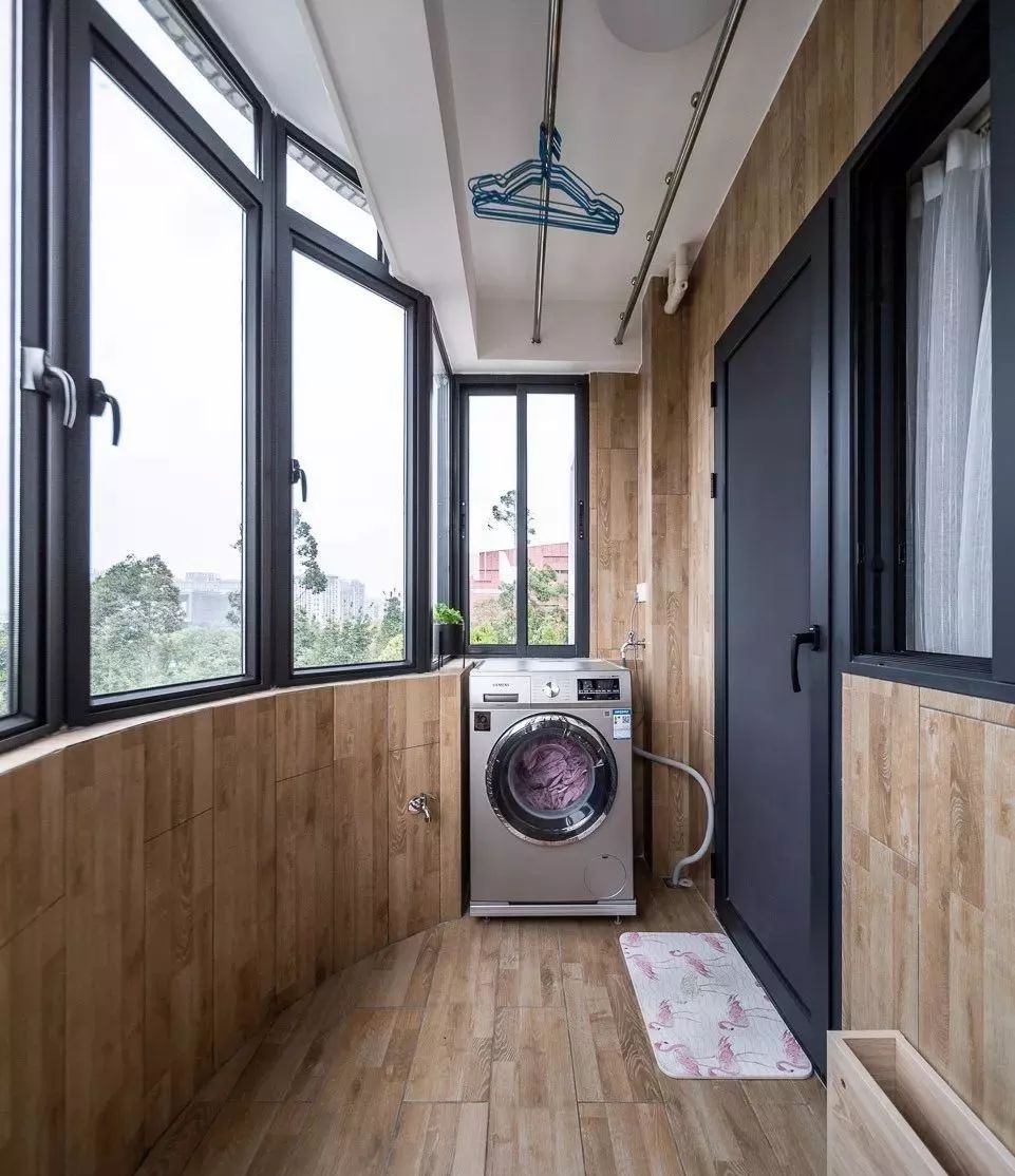 阳台木纹瓷砖从地面一直延伸到墙面,古朴自然。洗衣、晾晒功能齐全。