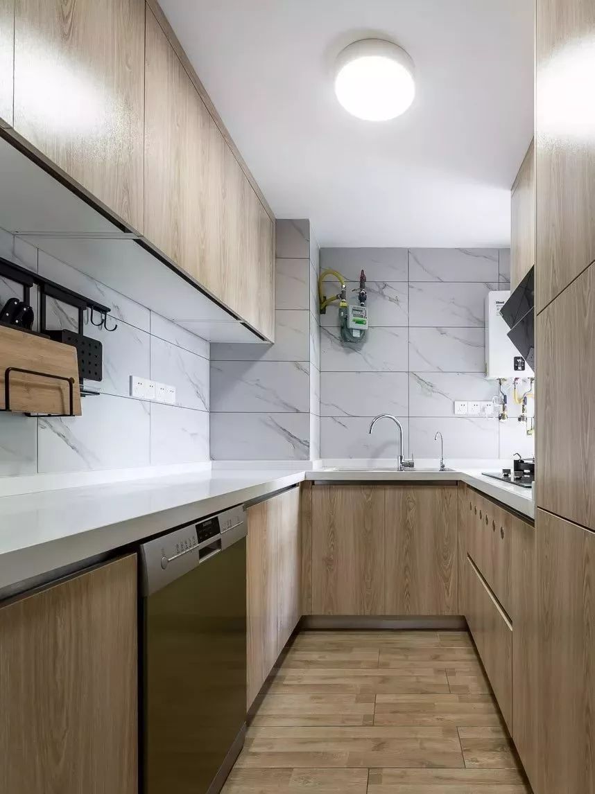 清新自然的北欧日式风厨房空间,U型橱柜设计,大大增加了操作面以及收纳空间。
