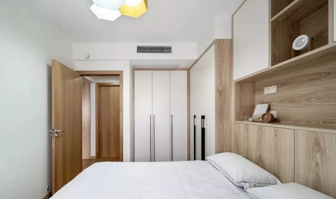 主卧仍是以白色原木色为主色,为避免空间的单调性,选择了黄色和蓝色搭配的窗帘,自然清新的卧室空间,更加有利于营造舒适的睡眠环境。