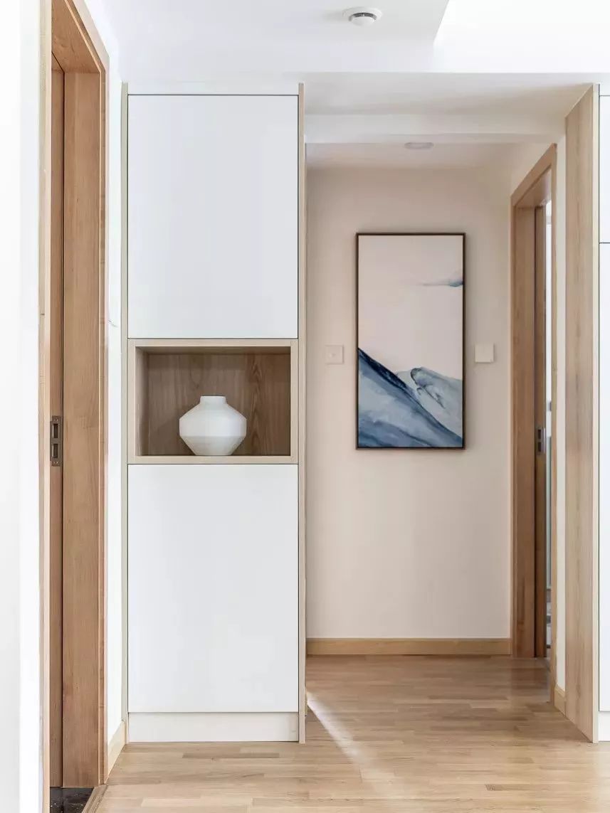 通入卧室的过道,收纳柜的设立,避免了卫生间正对卧室的尴尬,同时还增加了空间的收纳功能。
