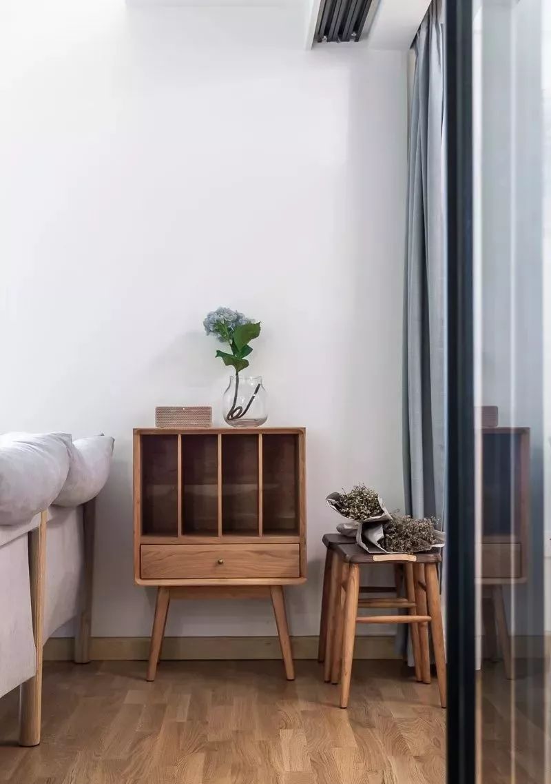 客厅与书房开放式设计,视野很开阔。白色墙面柜体搭配原木家具、地板,格外的自然清爽。