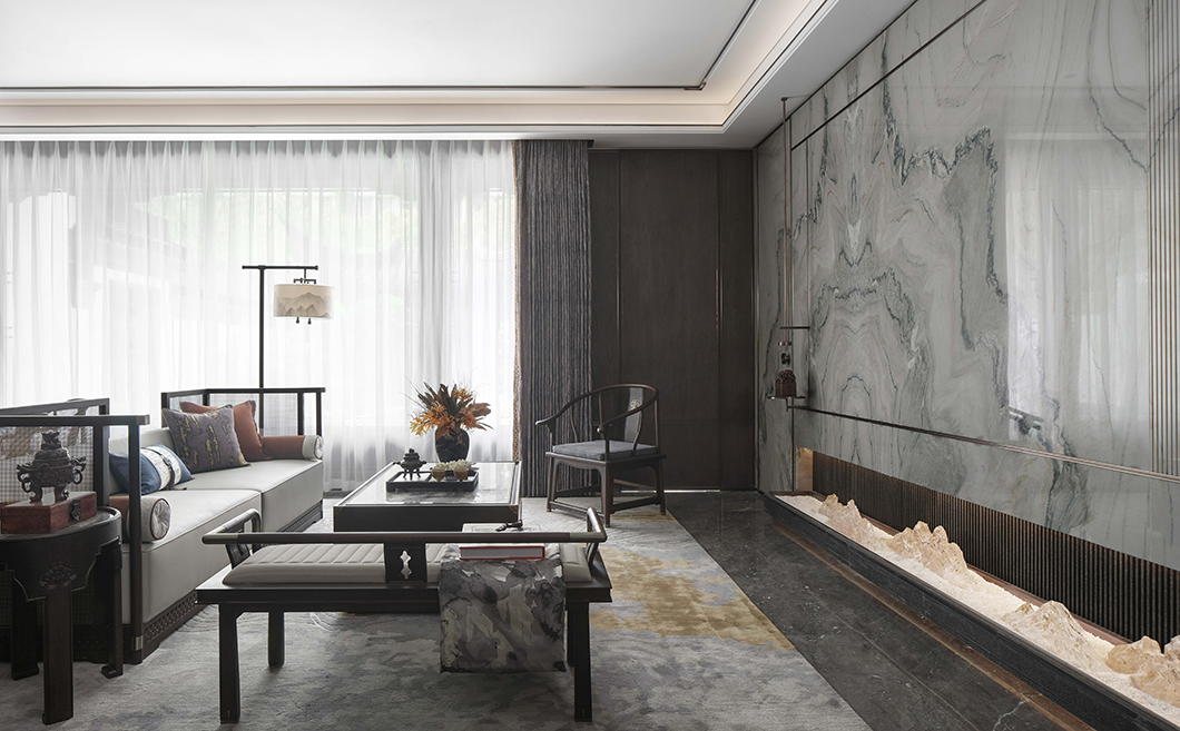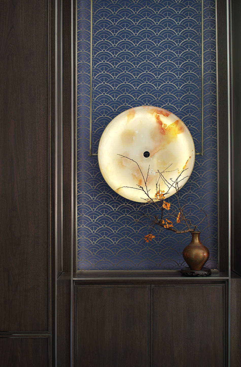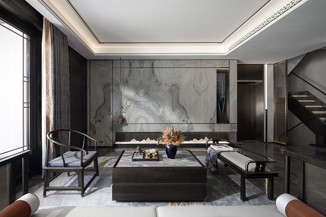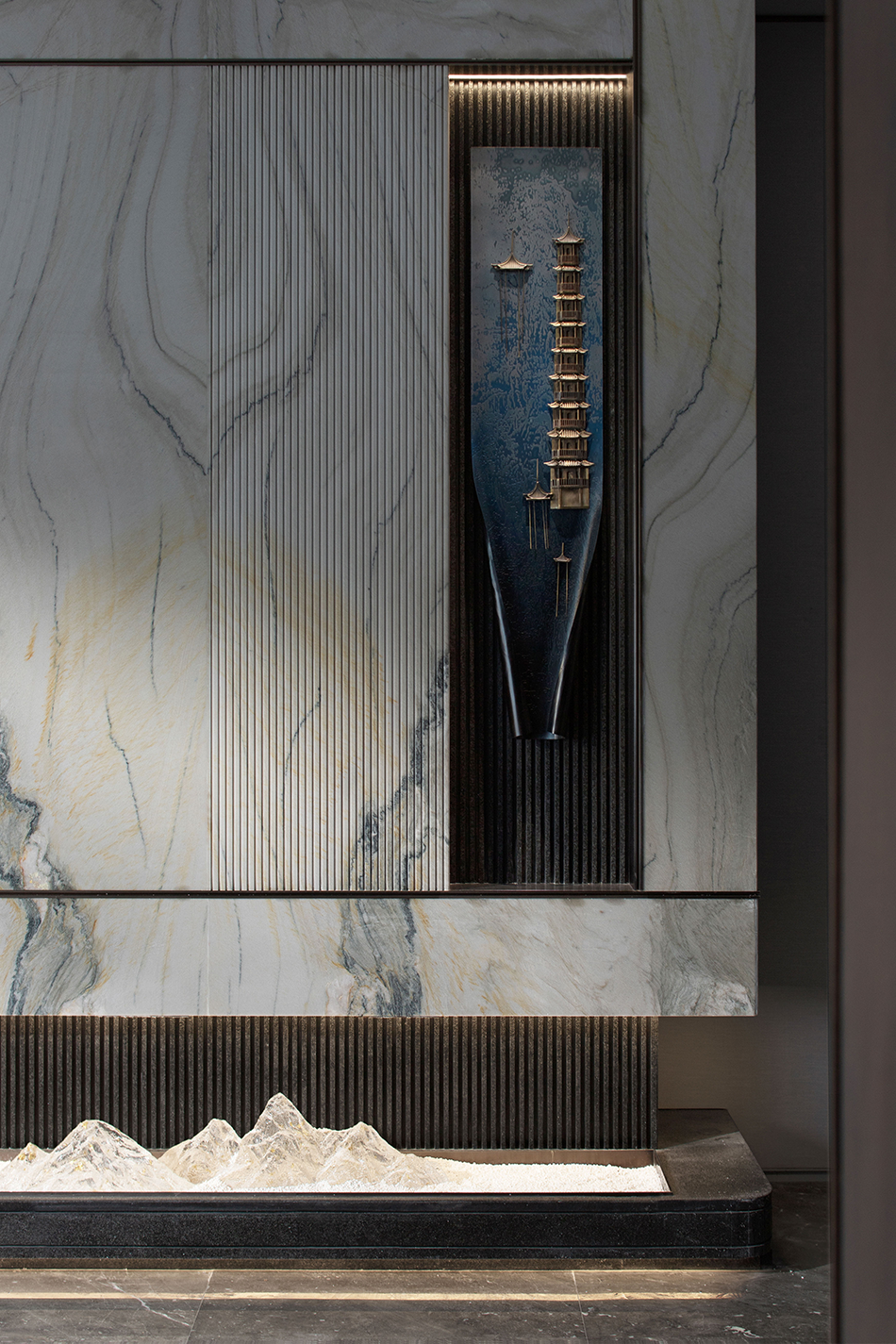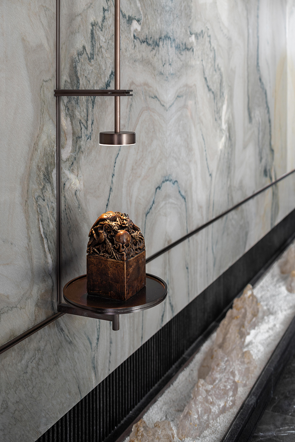 大理石挑板上枯山水绵延起伏,层次叠序;盘龙纽立铜盘,壁龛凹位嵌陈艺术装置——自然同人文底蕴相和,灵韵逸趣浑成。