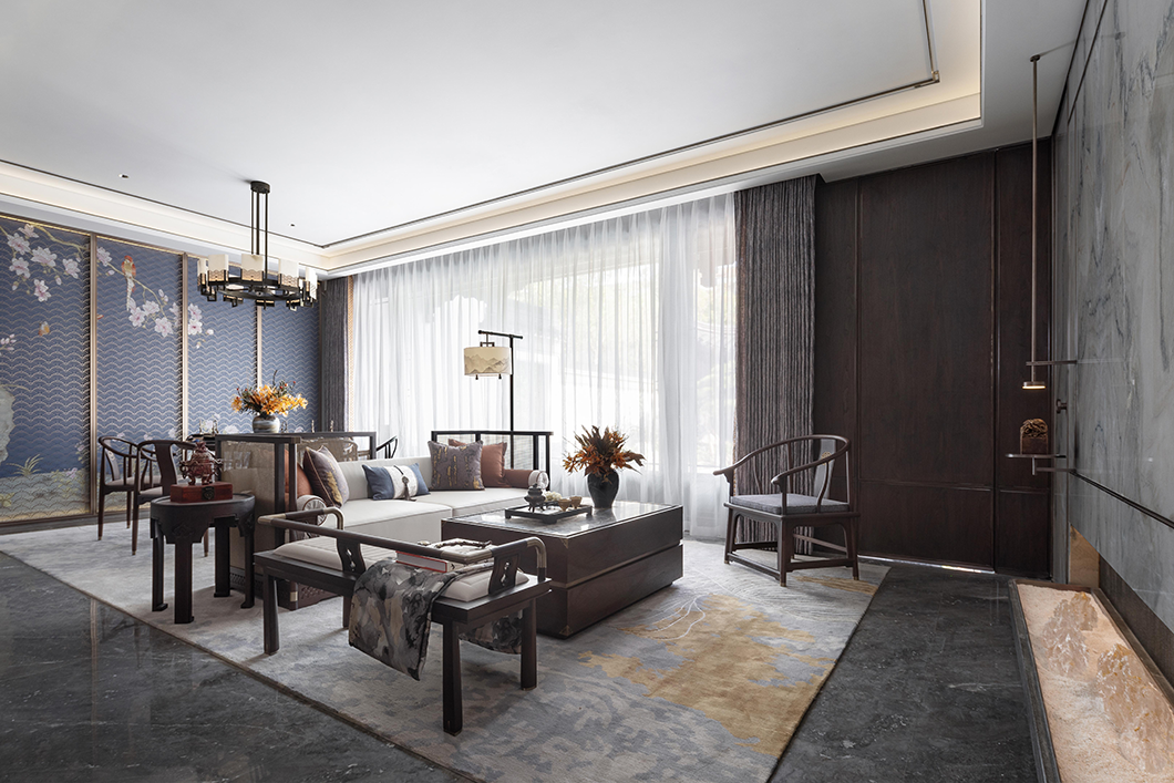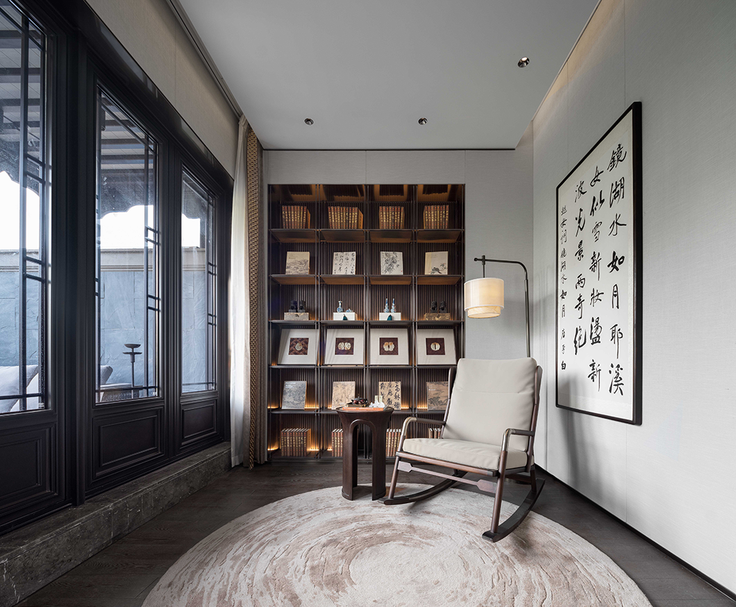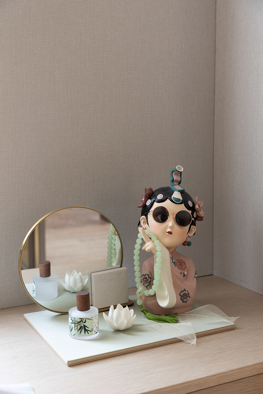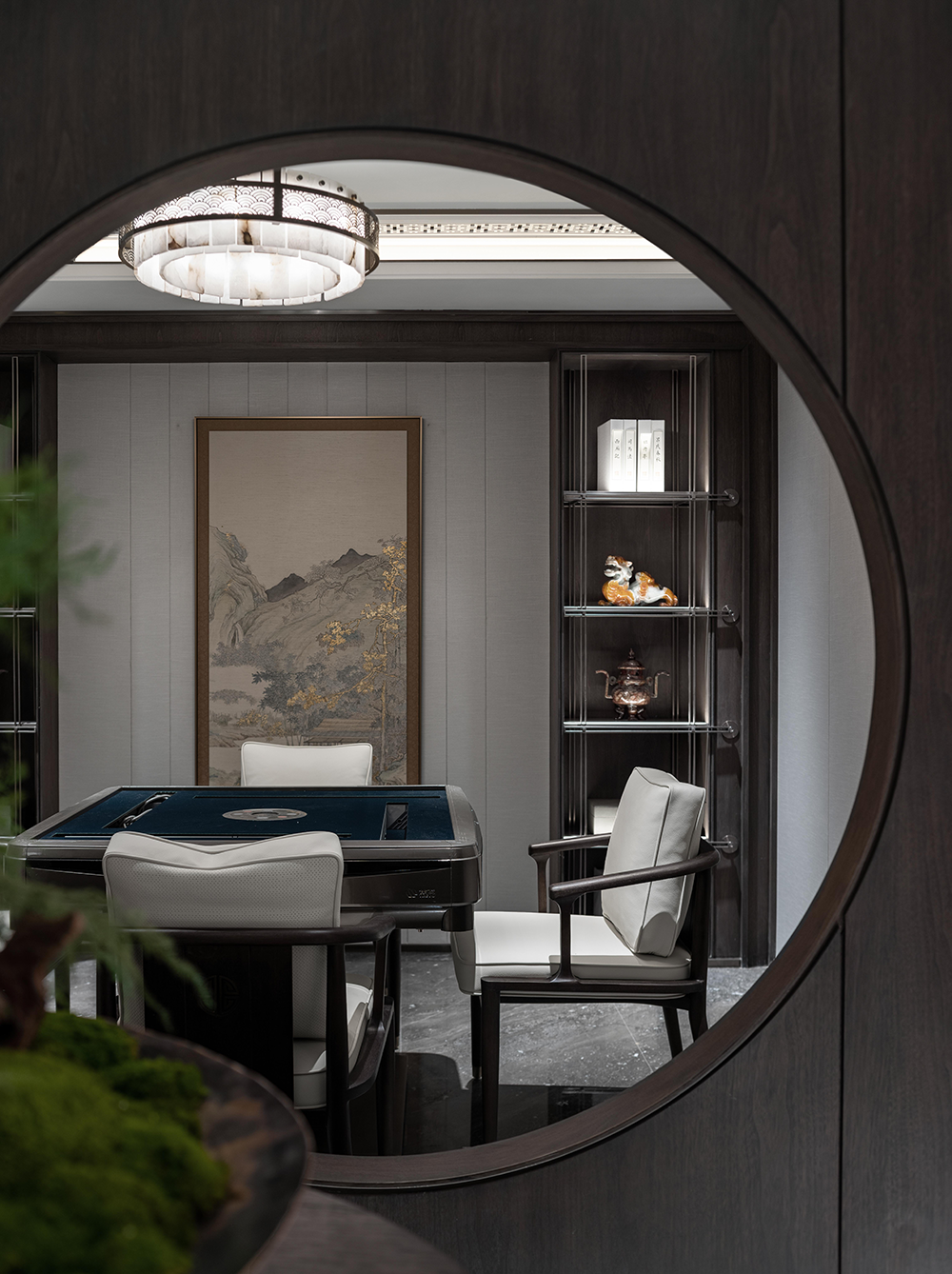大理石挑板上枯山水绵延起伏,层次叠序;盘龙纽立铜盘,壁龛凹位嵌陈艺术装置——自然同人文底蕴相和,灵韵逸趣浑成。