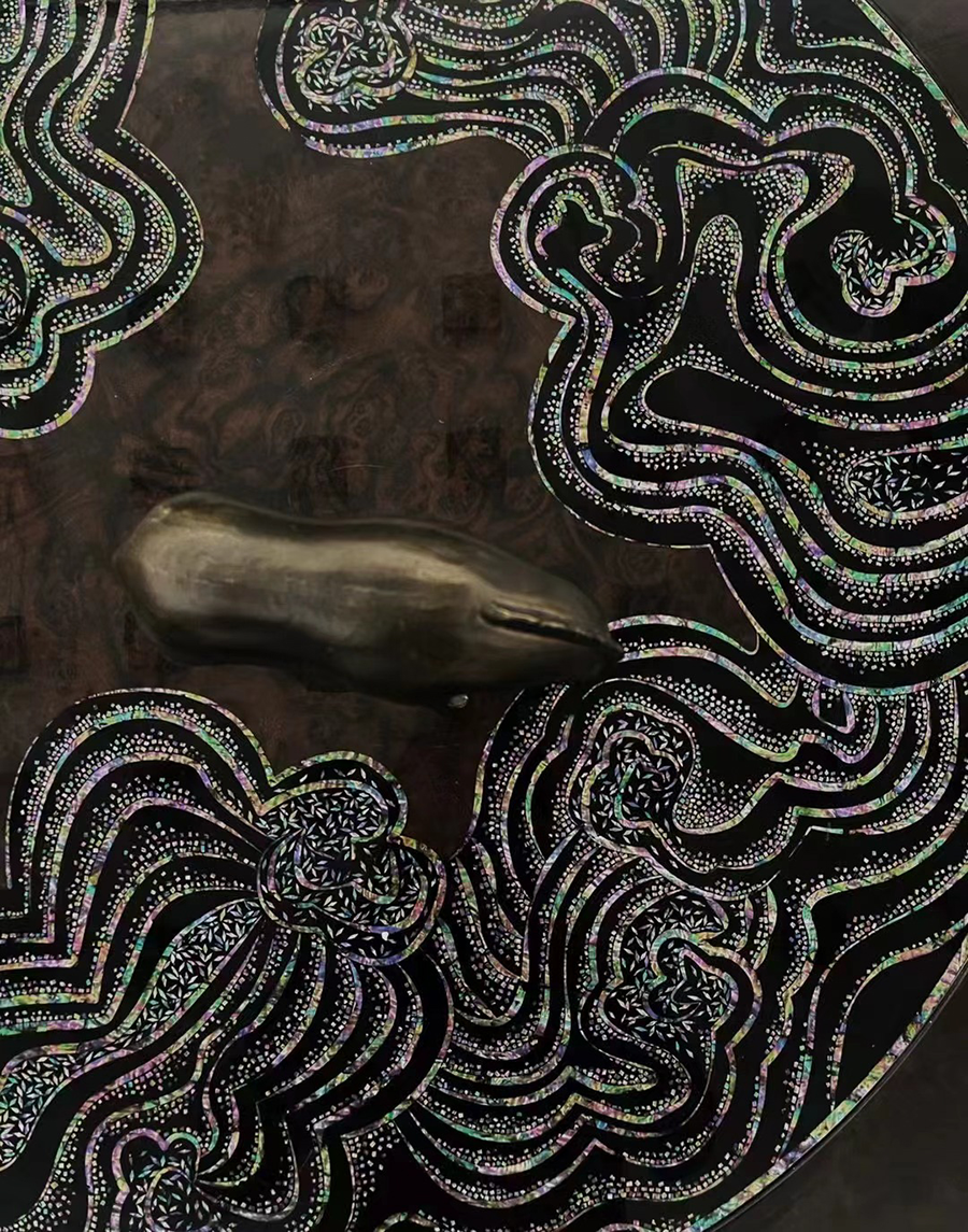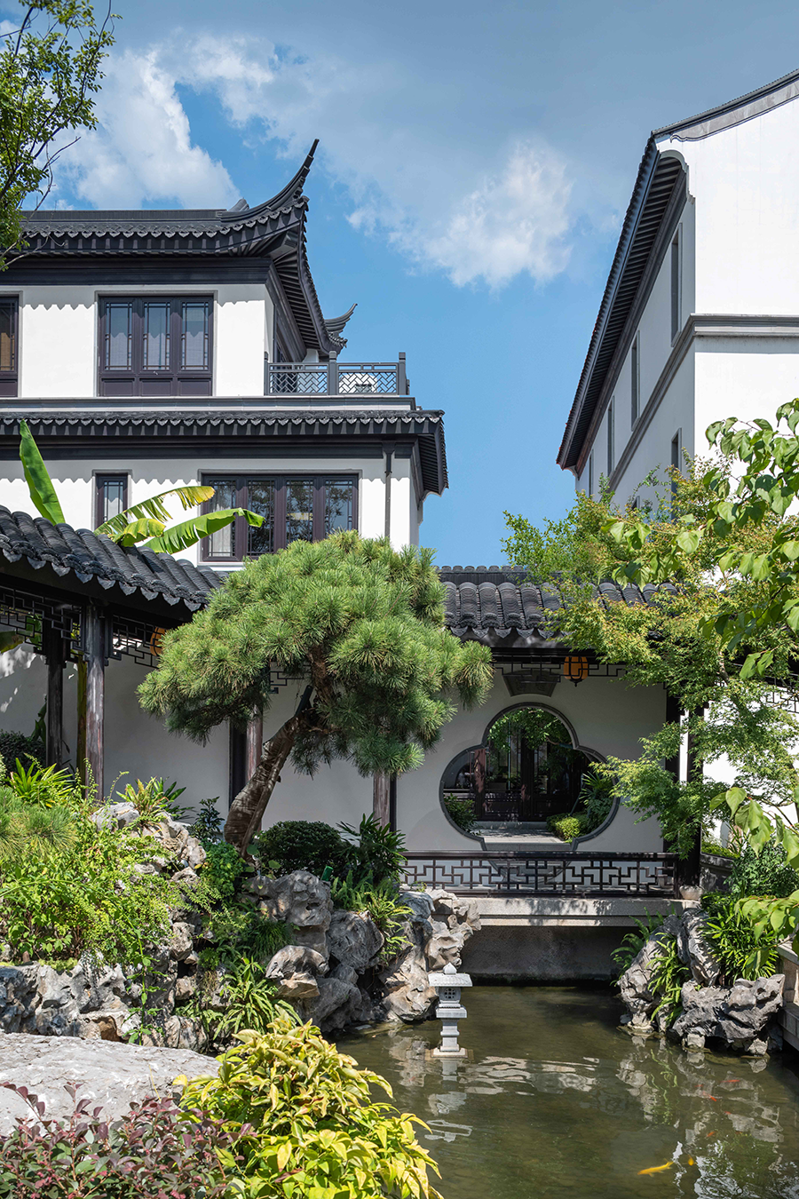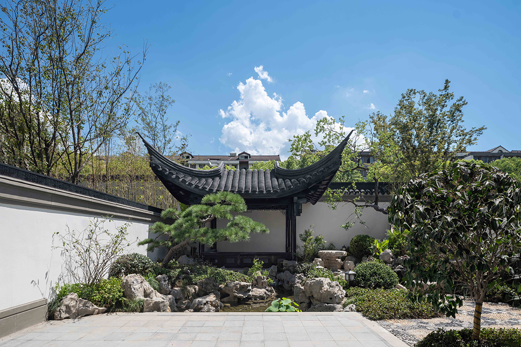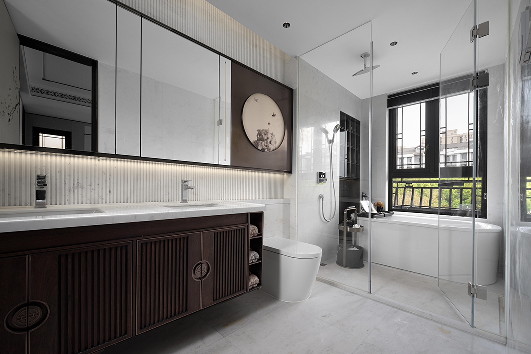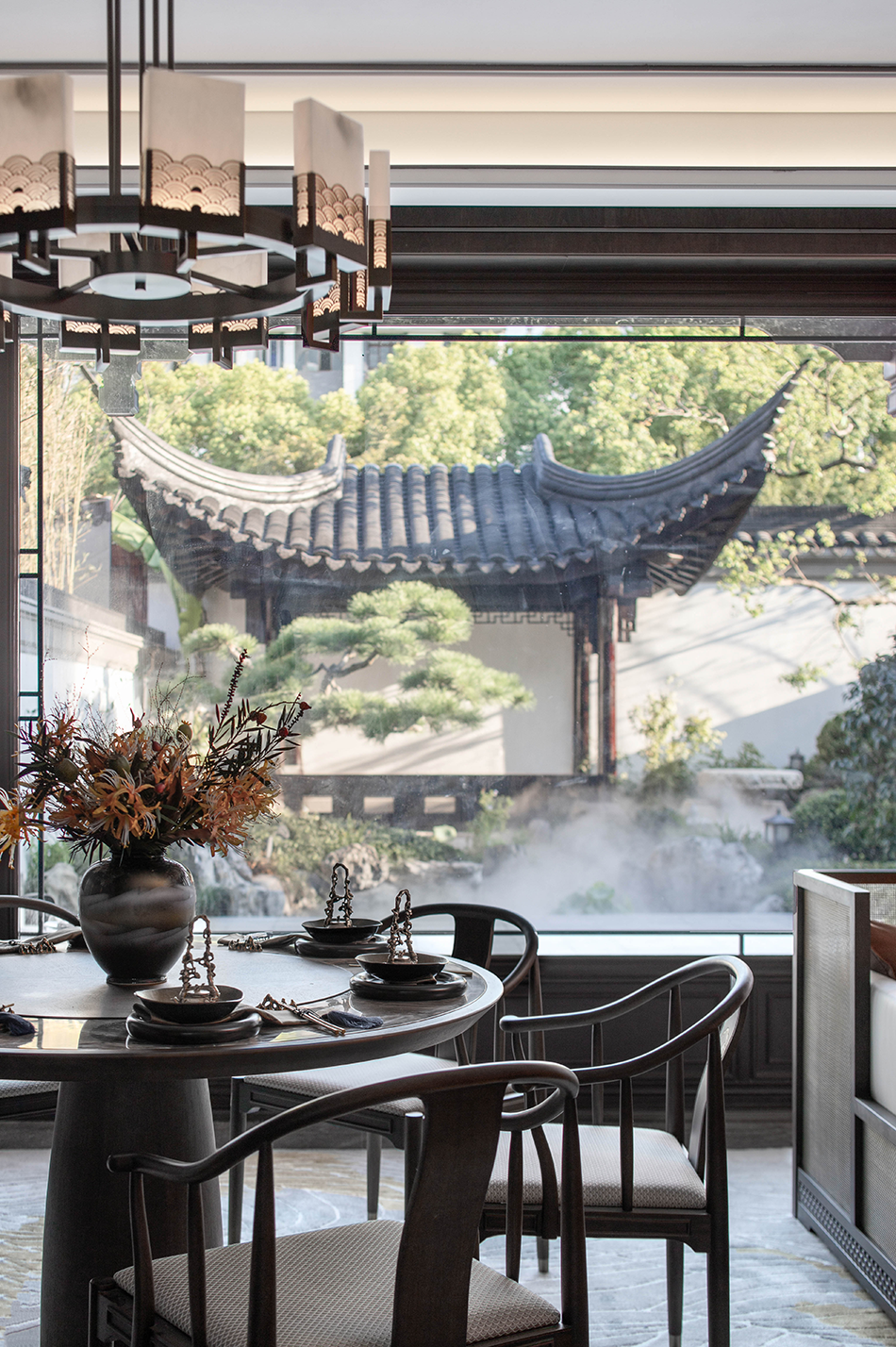 大理石挑板上枯山水绵延起伏,层次叠序;盘龙纽立铜盘,壁龛凹位嵌陈艺术装置——自然同人文底蕴相和,灵韵逸趣浑成。