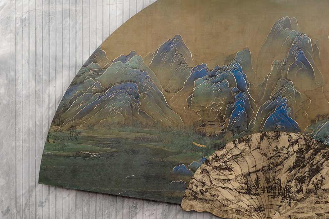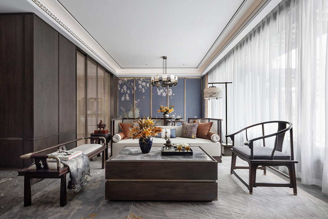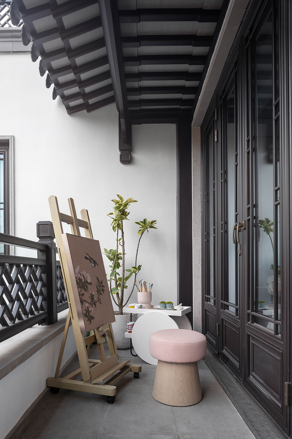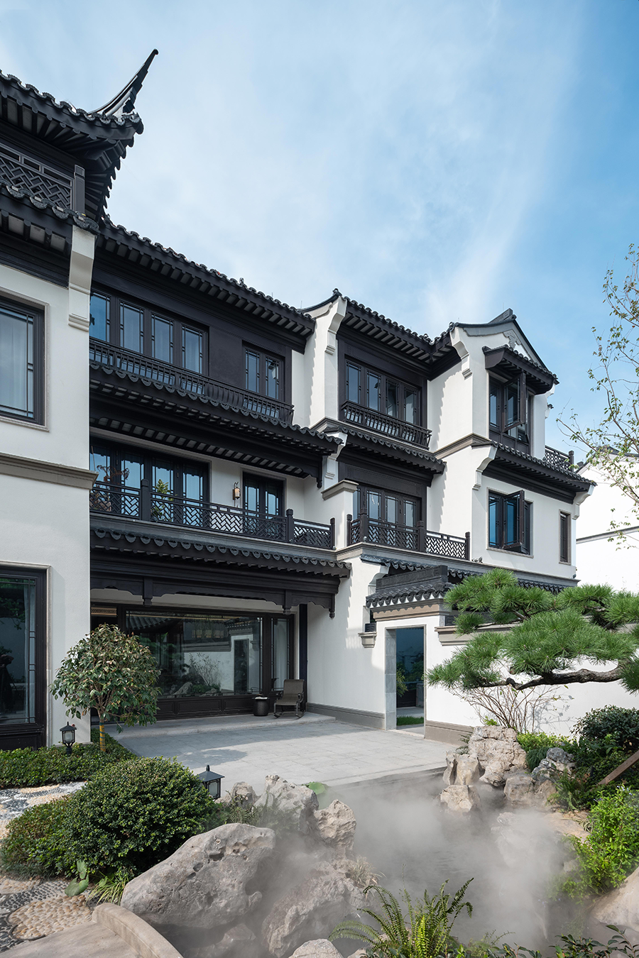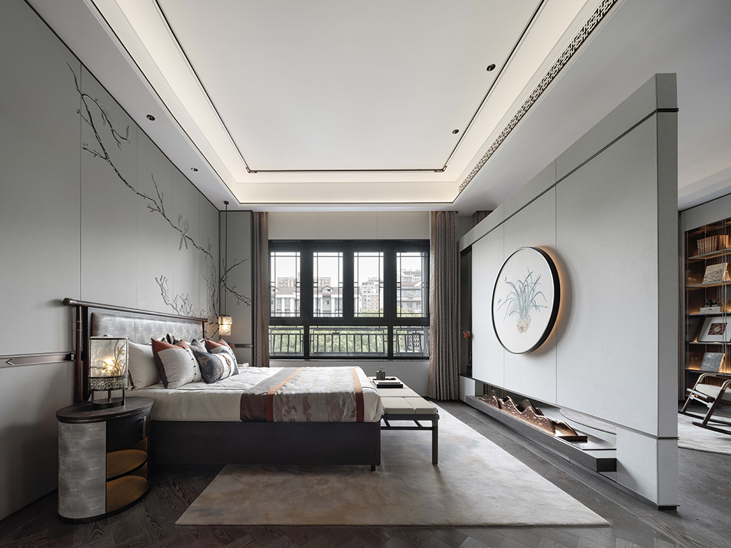 大理石挑板上枯山水绵延起伏,层次叠序;盘龙纽立铜盘,壁龛凹位嵌陈艺术装置——自然同人文底蕴相和,灵韵逸趣浑成。