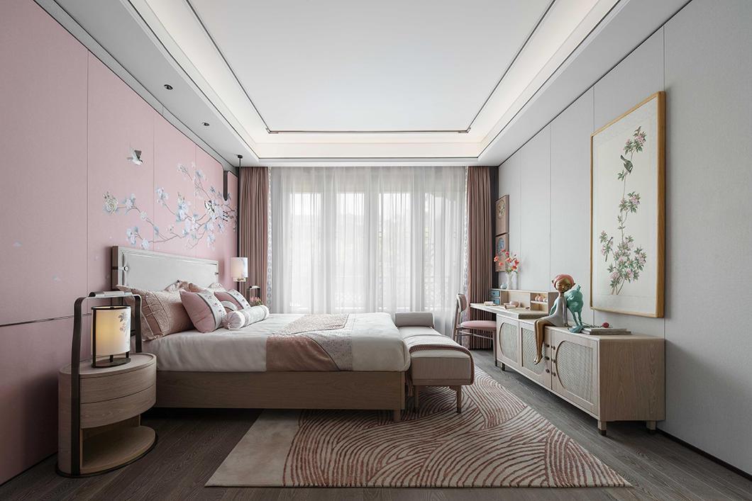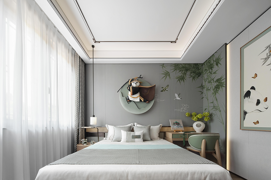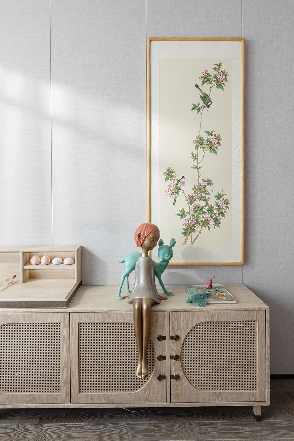 采用“递进式”进入设计,门厅右侧为阅读区,左边是睡眠区,居中设隔断做镂空处理形成空间内相互借景。