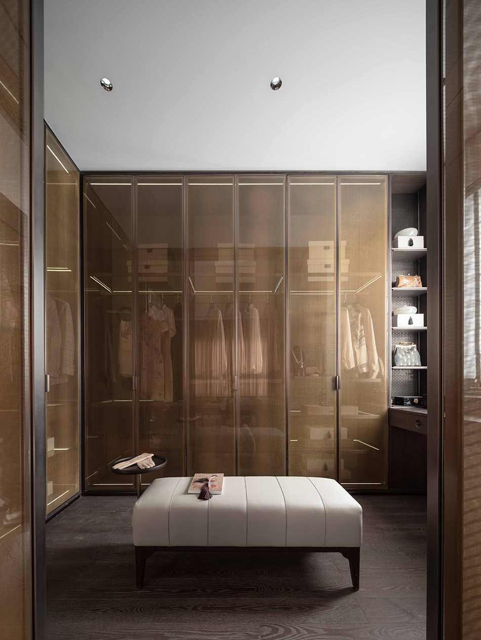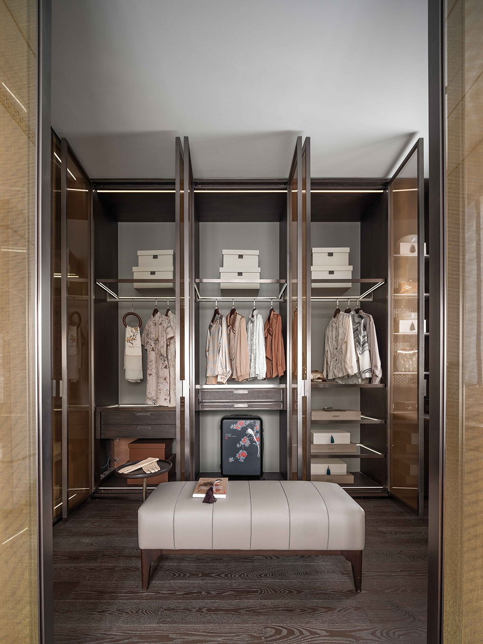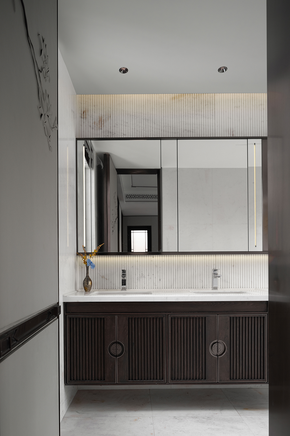 背墙曼延渐展,借山水纹奢石铺叙基调暗示“大体量”的视觉张力;精铜细嵌,沿轮廓利落游走,遥应软装灯具渲染描摹物形表象。
