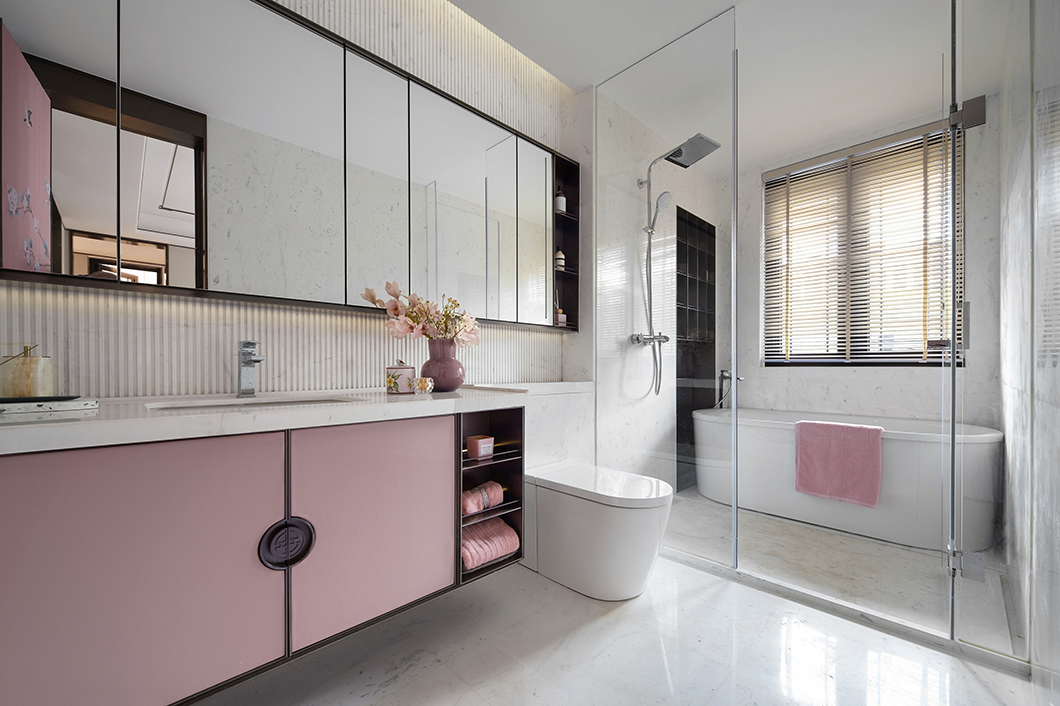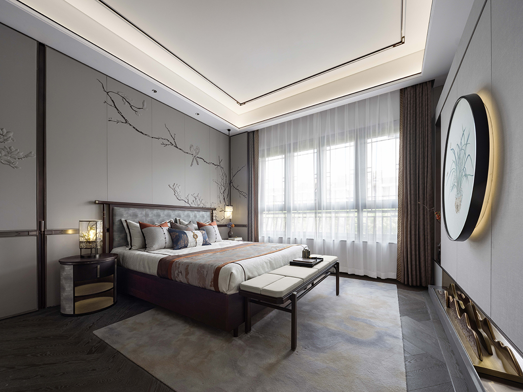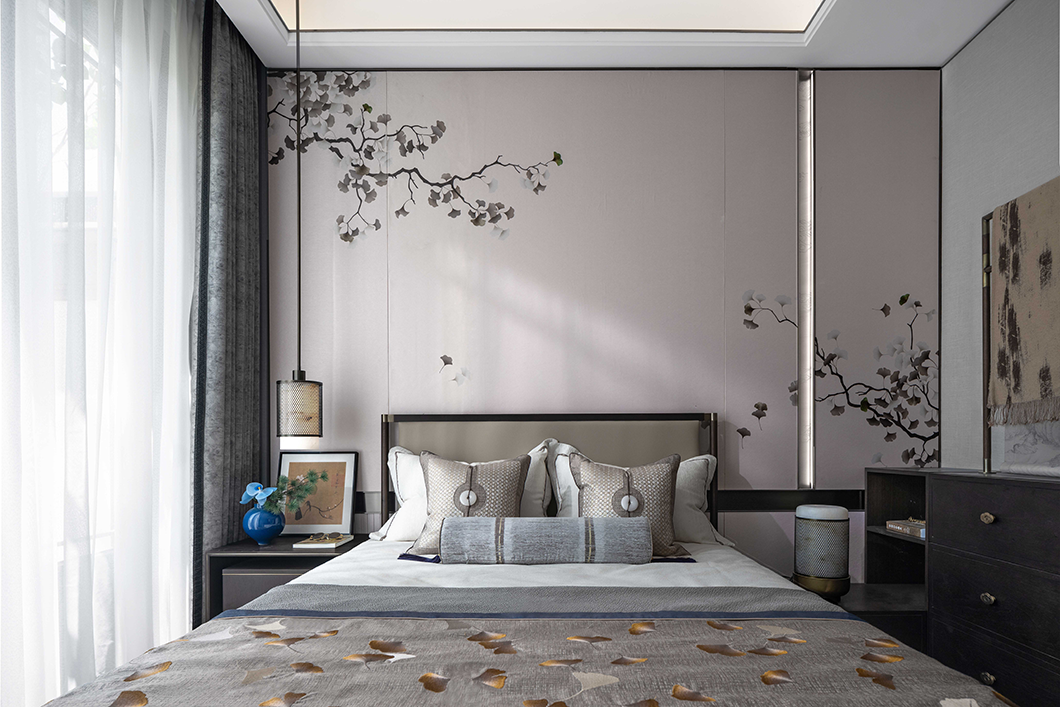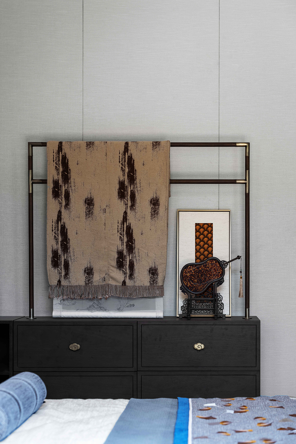 背墙曼延渐展,借山水纹奢石铺叙基调暗示“大体量”的视觉张力;精铜细嵌,沿轮廓利落游走,遥应软装灯具渲染描摹物形表象。
