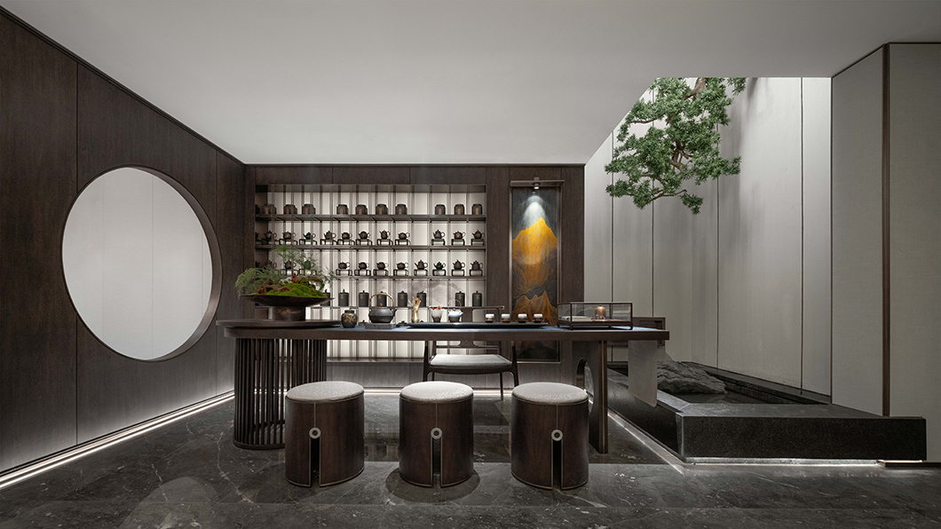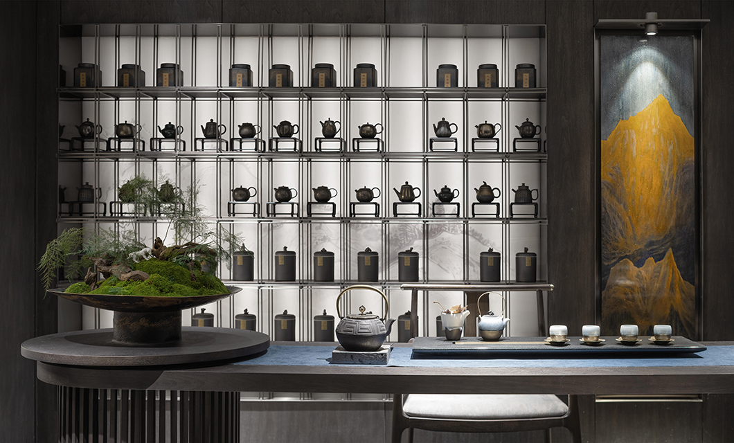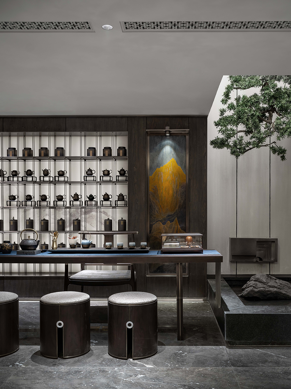 茶柜取悠山远水为画底,卯榫层架以构,展陈各式茶具于上,提炼的东方元素传递美学意识的认知和体悟。