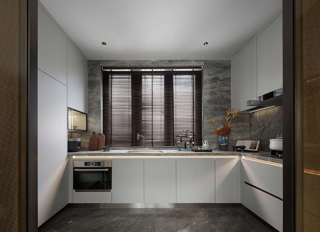 L形橱柜,操作便捷;简素的“白”同墙面石材随机纹理呼应,含蓄地呈显设计与自然交织之态。
