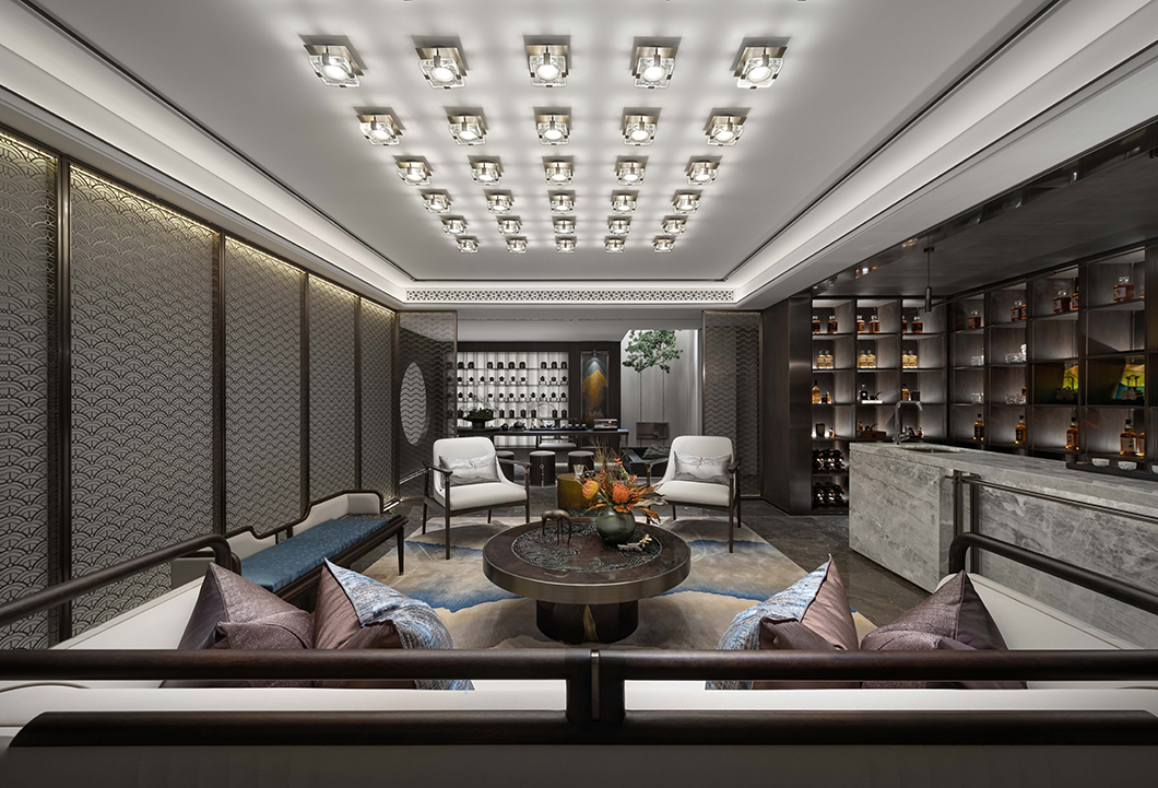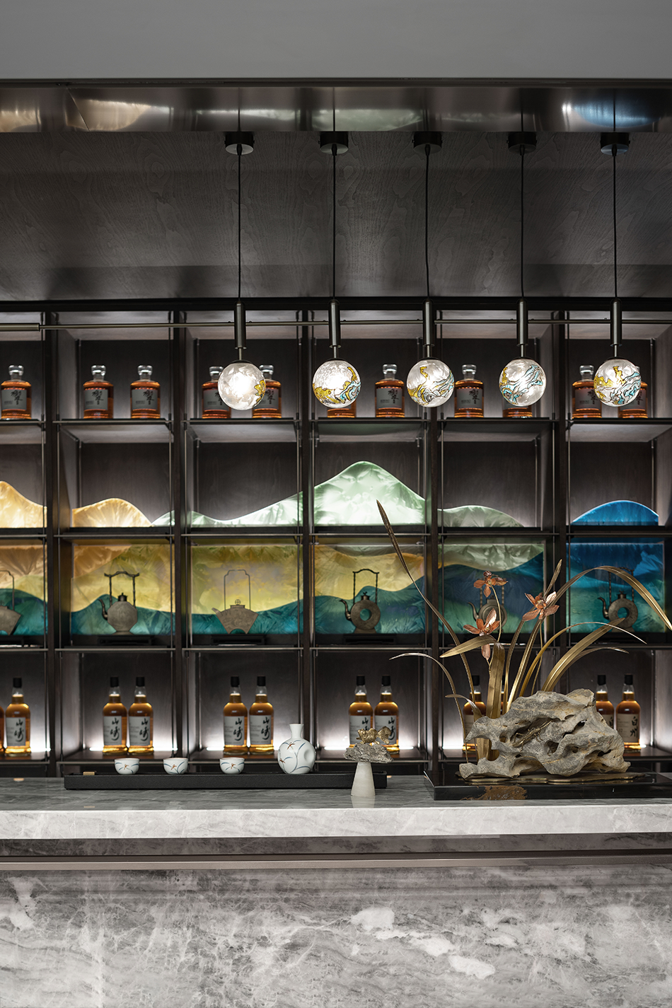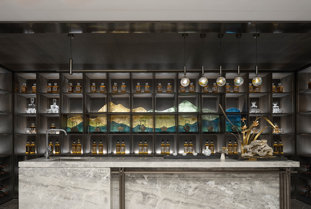 金属构件以卯榫结构紧密契合,超长尺度奢石操作台及满墙酒柜红酒区围合而相得益彰。