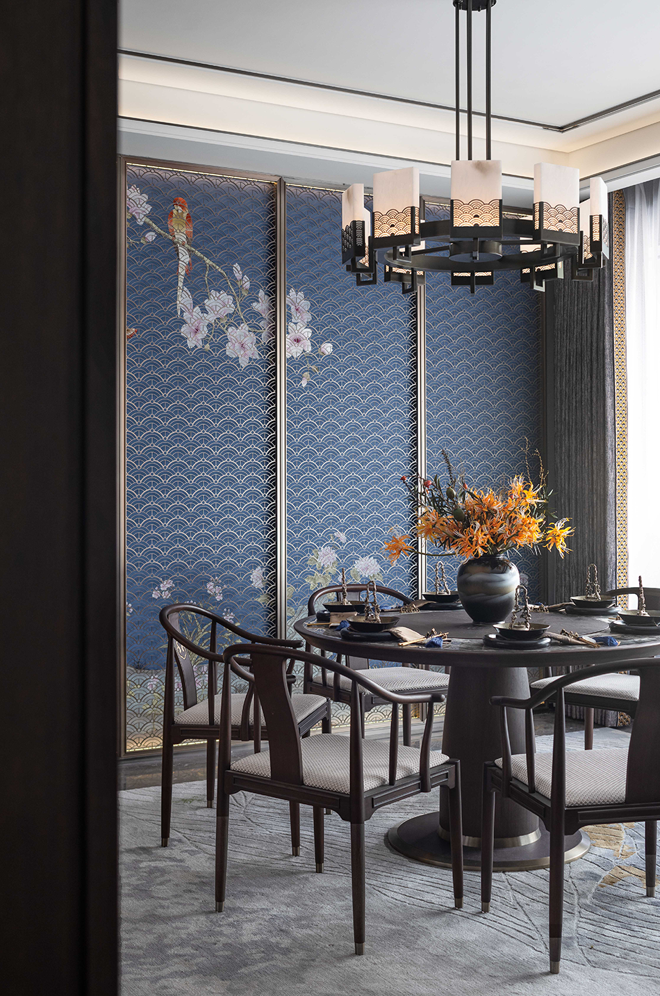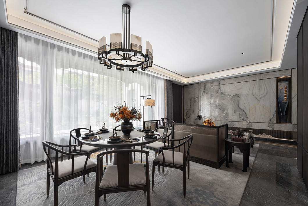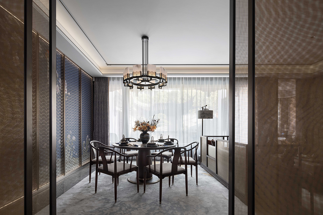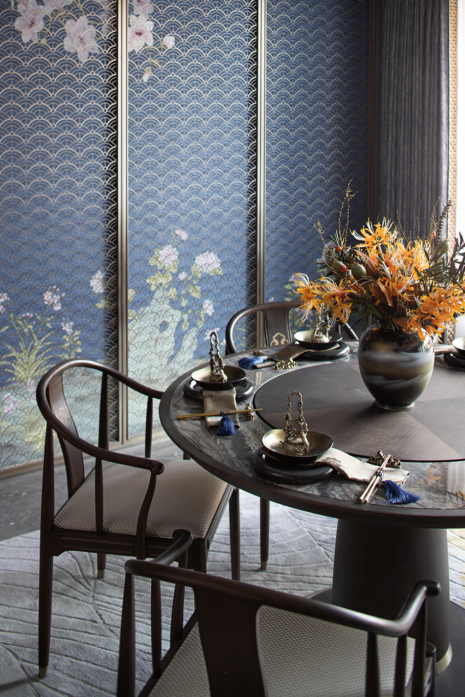 简约现代圆形餐桌同造型洗练的明式圈椅组搭,在古与今、东方和西方的兼容并蓄中寻求平衡,别开生面。