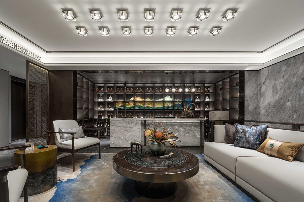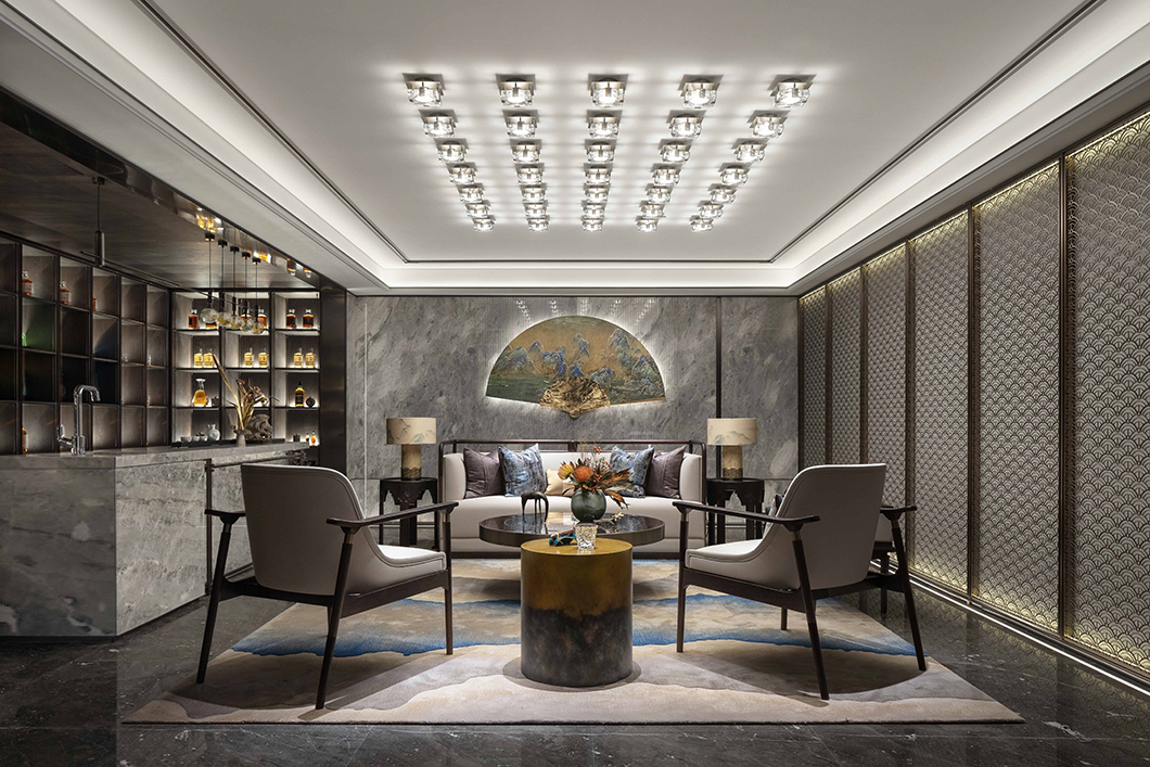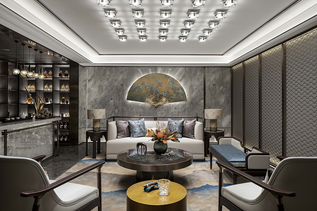 大块面奢石背墙气度浑成,青山绿水扇幅装置画展露磅礴气势;整面金属格栅以水波连续纹样显中式格调,经洗光投射一片影虚实生的波澜。