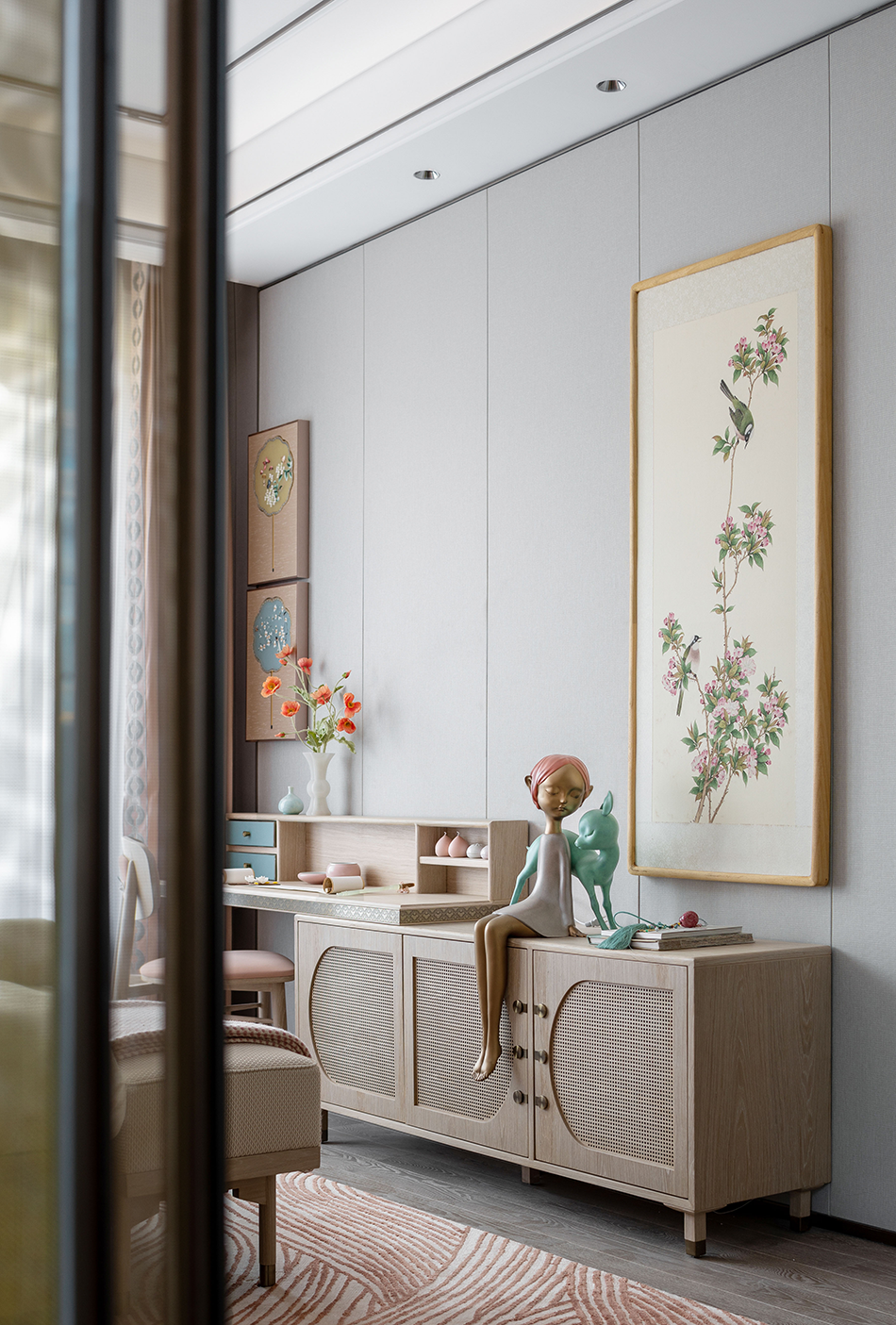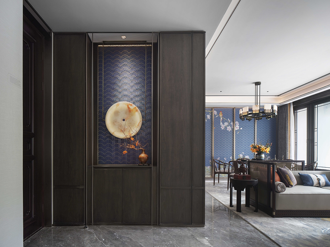 玄关两侧设柜体,中位自成端景,揉“储藏”及“展示”功能二维一体。