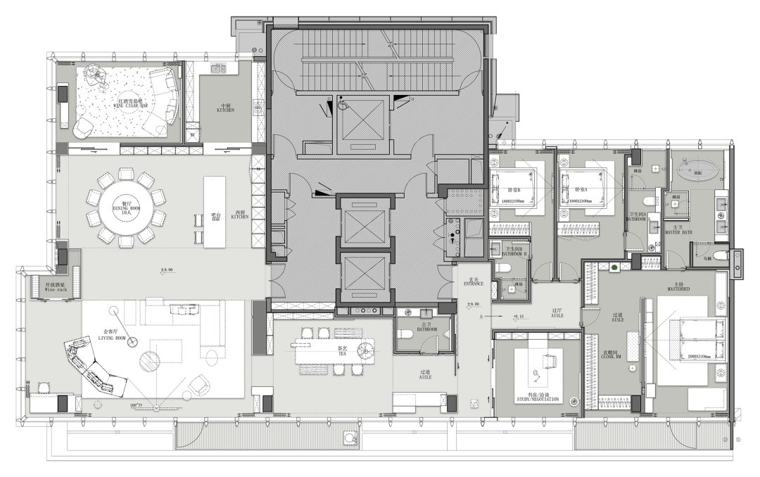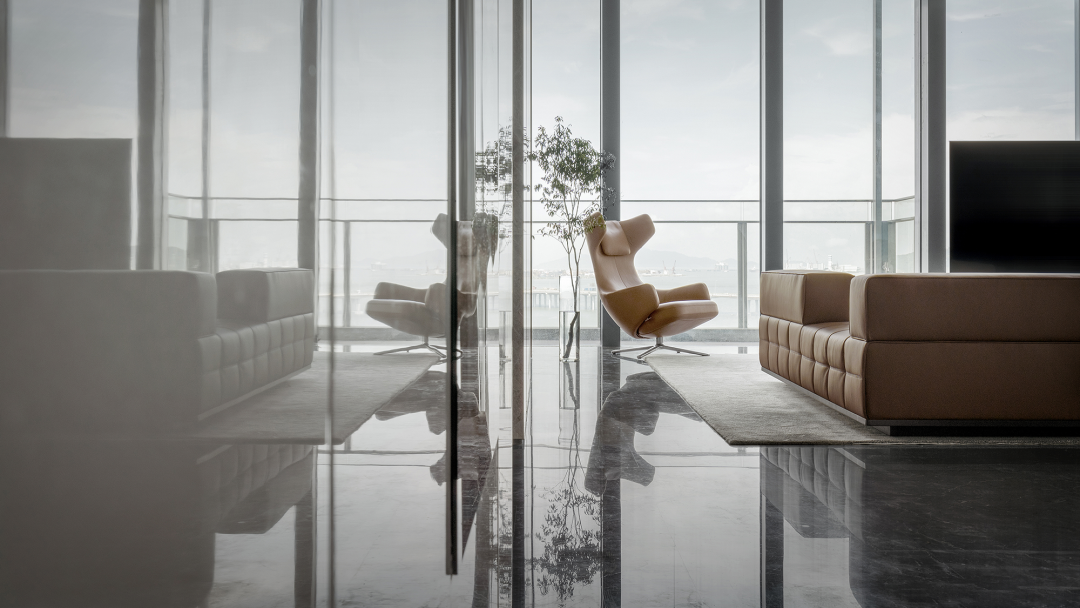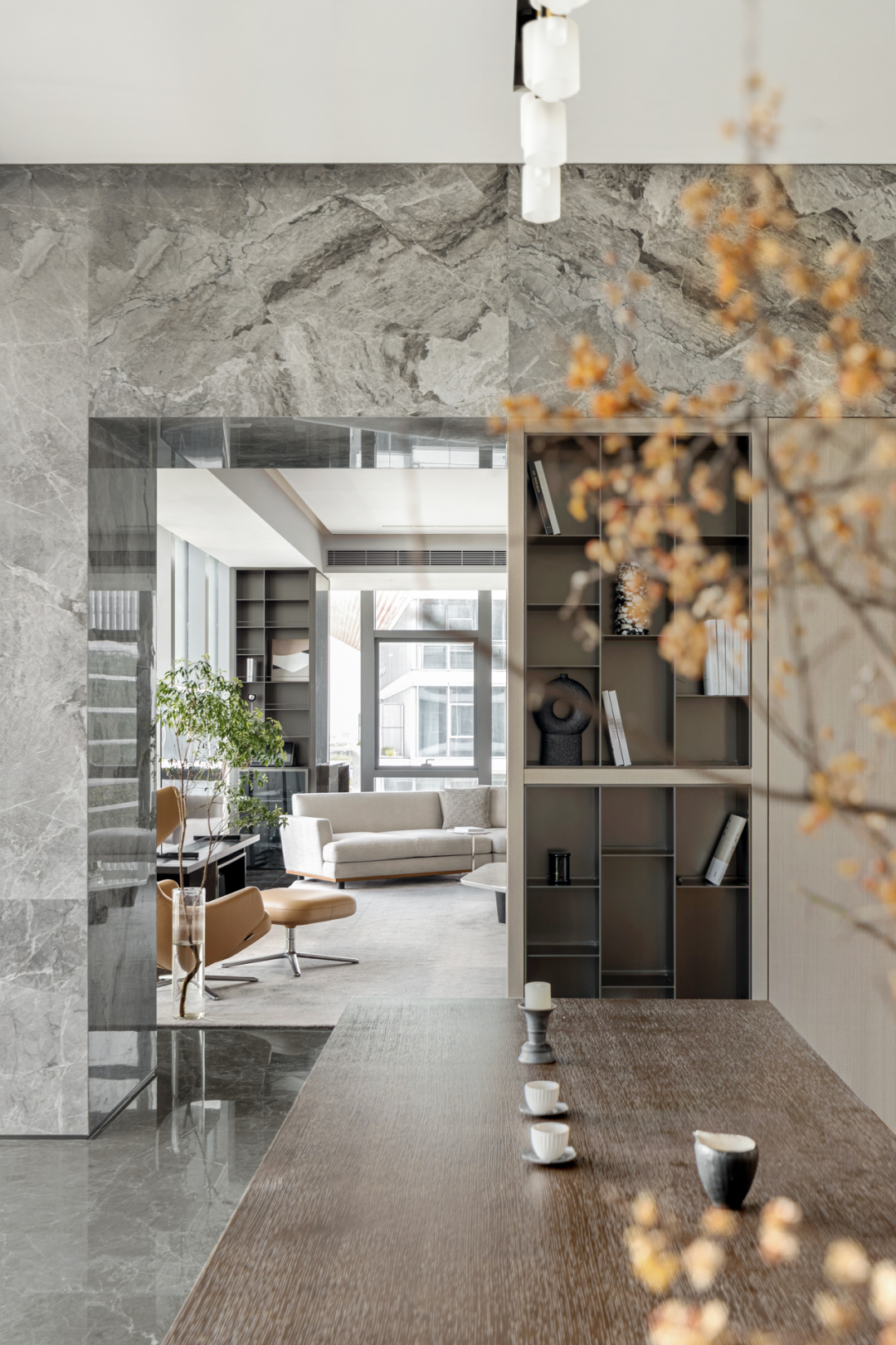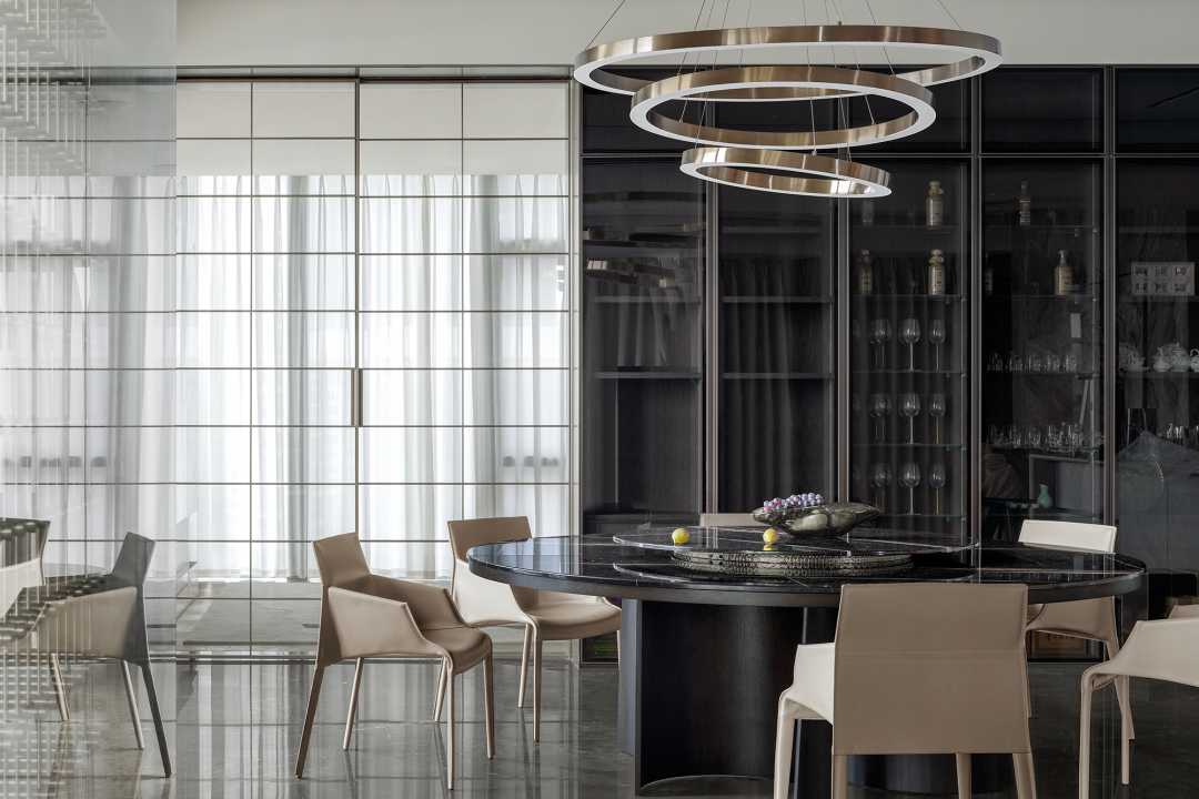在享尽欢聚时不脱离“ 家” 的归属感; 在繁华散尽后, ⼜不困顿于独处的孤寂。空间从一入眼开始便制造了神奇夺目的开阔感受,通过环绕景观的方式,将观者视线导向面朝大海,直达远方海平线,独揽置身海景C位的壮阔奢侈感。景观,成为空间中的绝对主角。聚会空间被一分为三,一方是会客厅,一方是具有私宴功能的空间,吧台区则成为二者的连接点。有别于窗外景色的丰富饱满,会客厅用不同程度色调的白、棕、灰表达着愈发沉静的内敛。私宴空间,以硬朗的黑色石材,棕色皮质,镜面,金属等材质和肌理感修饰出近乎相似的高级品格。