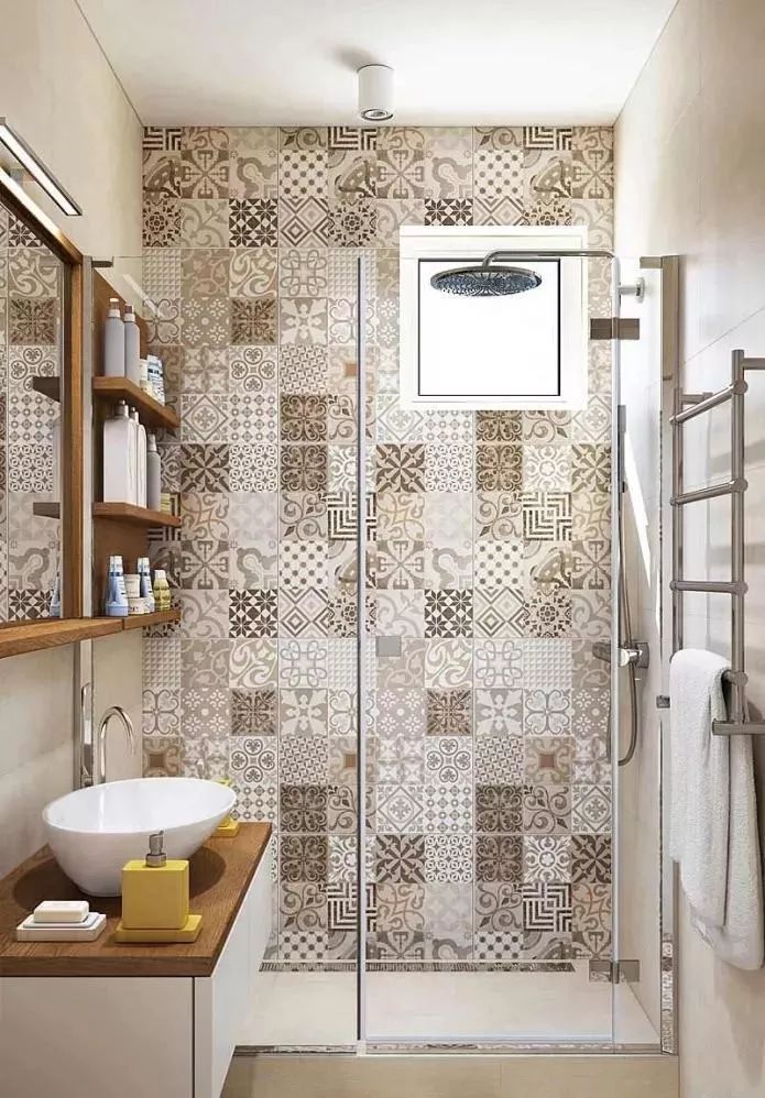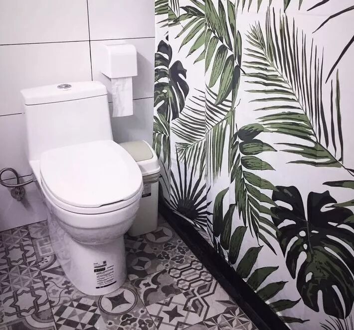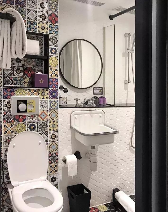 墙面地面同时铺贴花砖,相互呼应,相得映彰,可以选择全部铺满,也可以在特定的区域进行铺贴,如马桶的地面或后方的墙面。