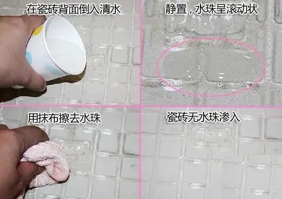 可将水滴在瓷砖背面,看水散开后浸润的快慢,一般来说,吸水越慢,说明该瓷砖密度越大;反之,吸水越快,说明密度稀疏,其内在品质以前者为优。吸水率小的瓷质砖在春季昼夜温差变化的情况下不容易出现裂纹。