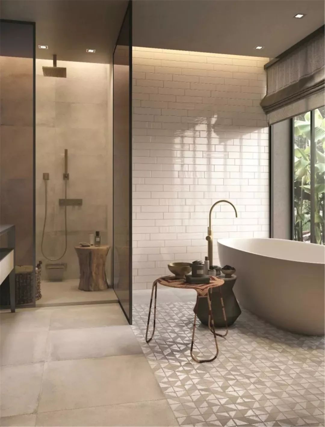 大面积铺贴的瓷砖,往往奠定了整个家的风格基调,建议选择比较简约耐看不过时的颜色,纹理也尽可能避免过于的繁复。色彩方面,墙砖和地砖可以选择同类颜色、深色地砖和浅色墙砖、冷暖对比色搭配等等方式。