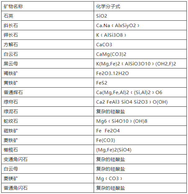 所谓矿物,就是地壳中的各种化学元素经过各种地质作用所形成相对稳定的自然产物。石材中的矿物如下表所示。