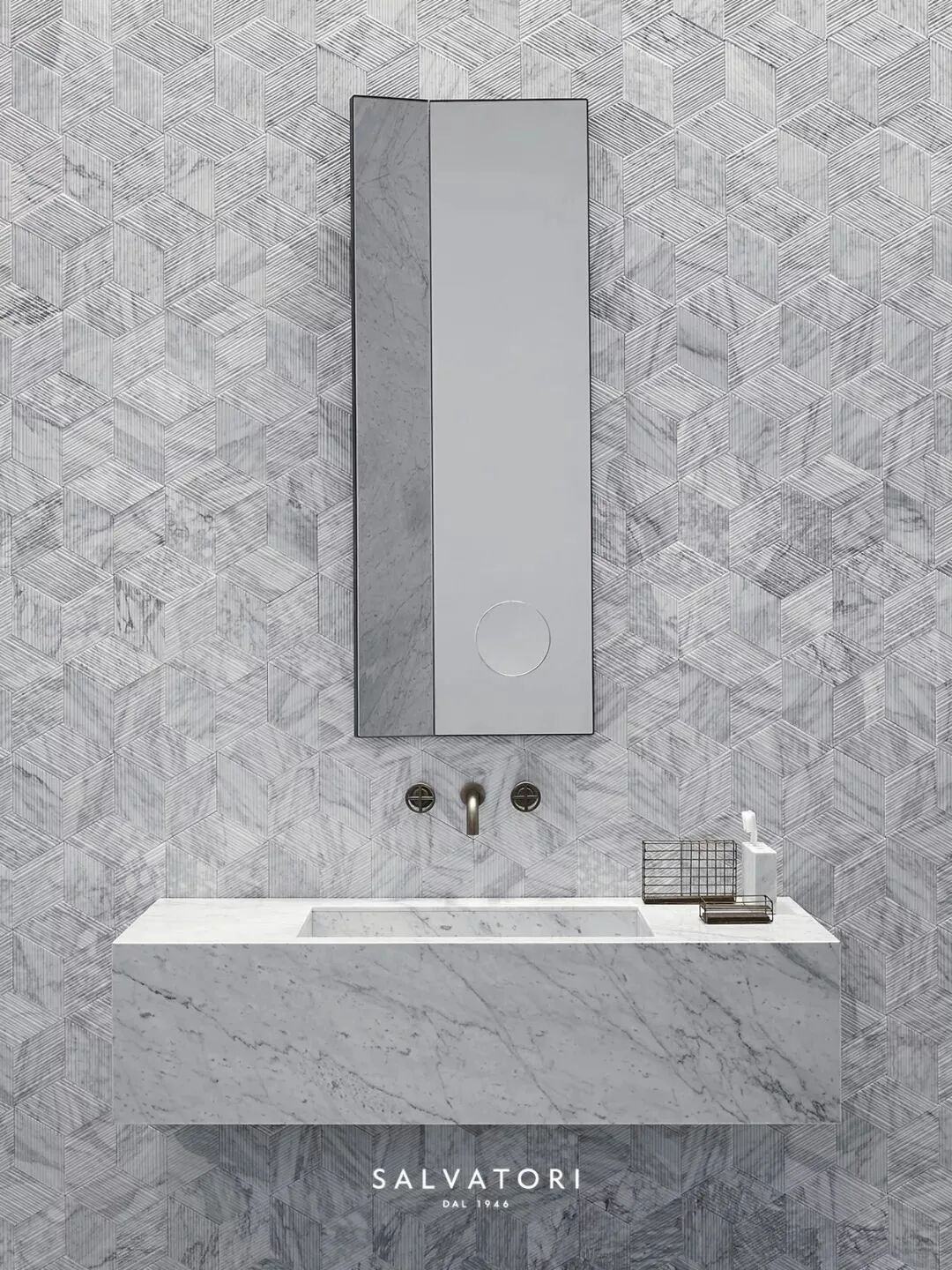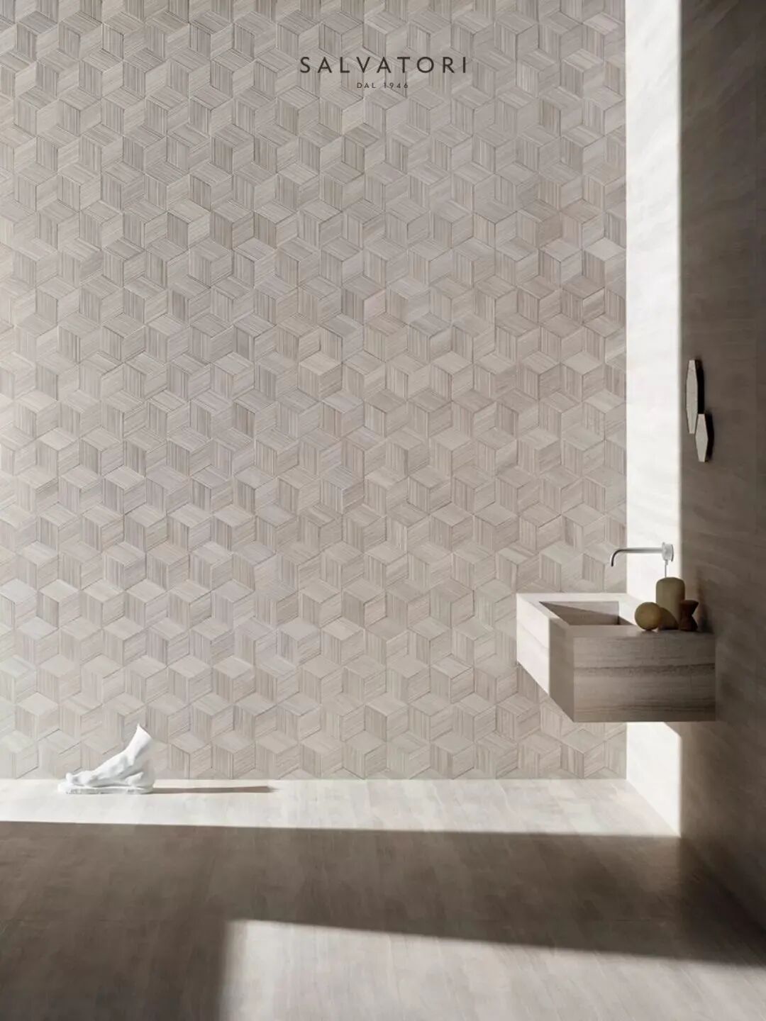 由一系列菱形瓷砖组成,放置在一起时会形成三维六边形效果,当沐浴在阳光下时,效果会非常生动。凭借其抓地力,非常适合个性化、特色墙和浴室(包括淋浴地板)。