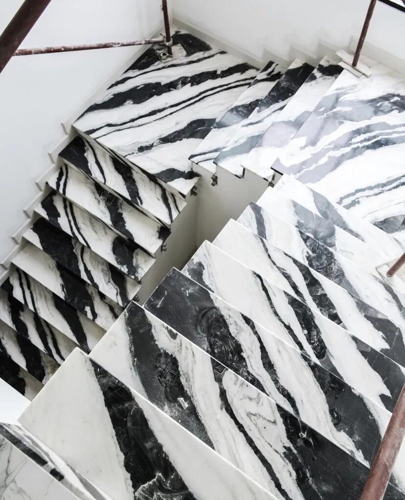 正如其名,熊猫白是一款黑白相间的大理石石材,在白色底板上,黑色的纹路随意而潇洒地流动,像是自然微醺后的无意之作。