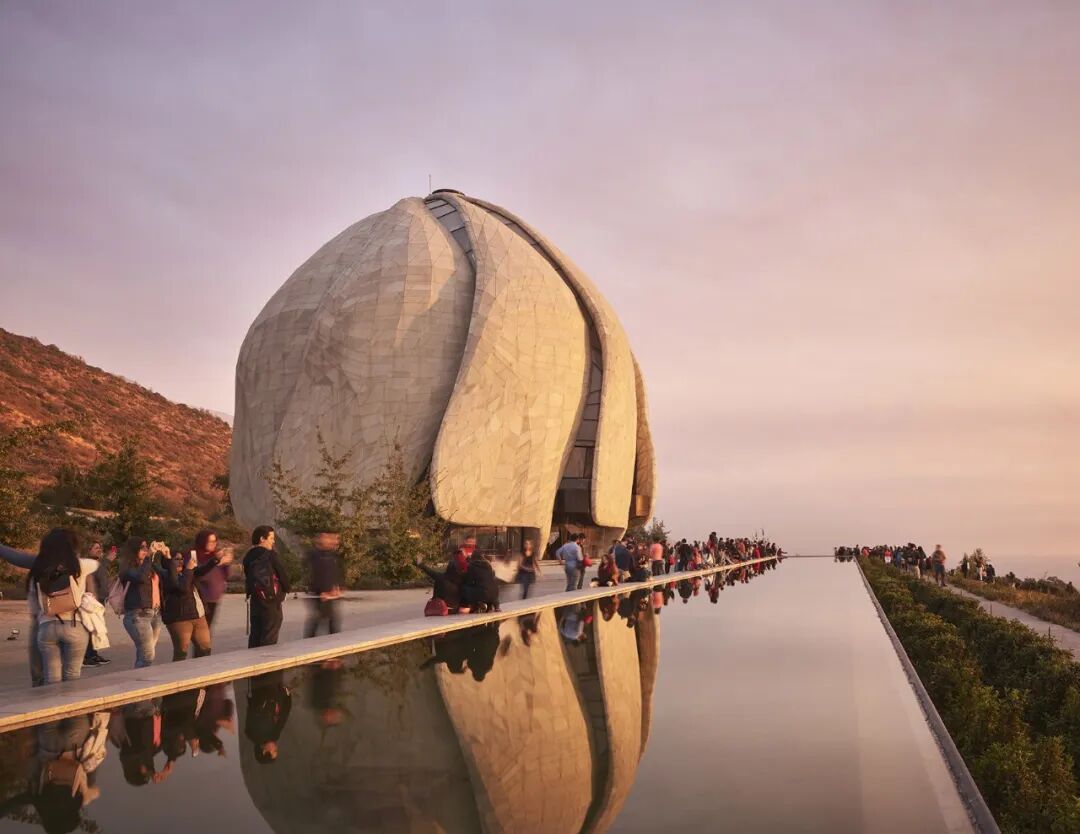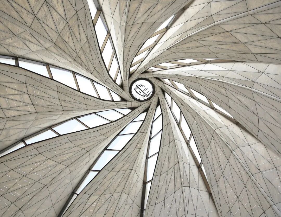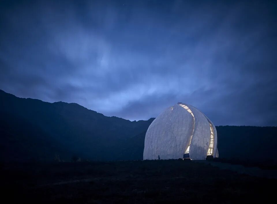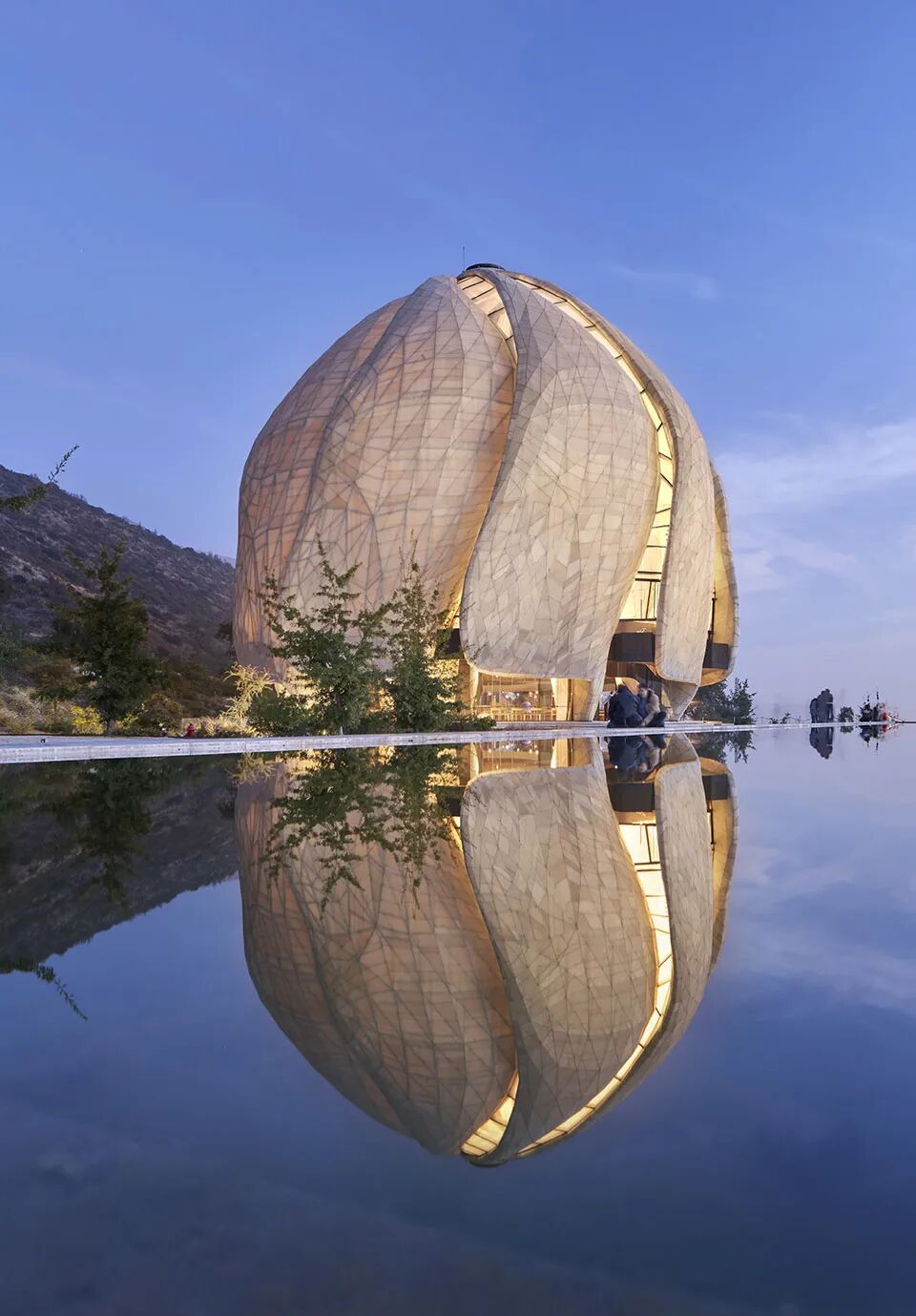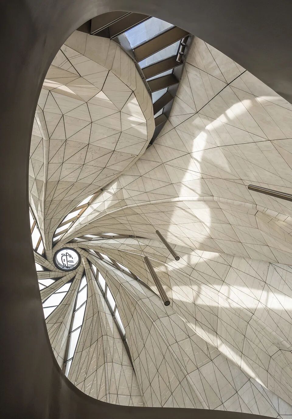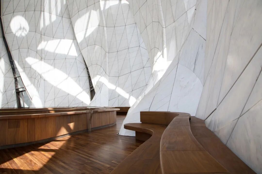 巴哈伊寺庙是一座从光线中汲取生命的建筑。九个造型独特的“翅膀”以扭转的姿态形成优雅的聚合,最终交汇于顶部的窗洞,与地面相连的中央空间周围营造出一种优美的律动。