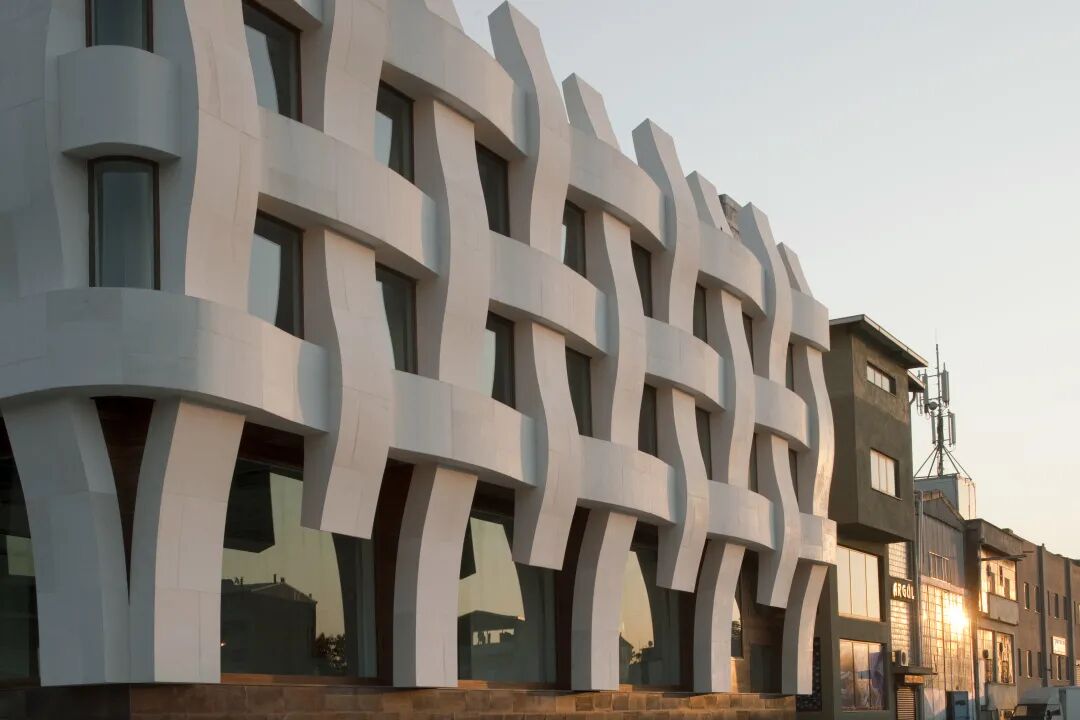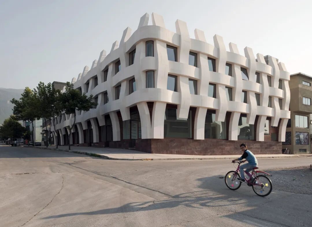 来自土耳其采石场的白色大理石被拼接成线条交织的建筑表皮,红色大理石作为建筑的基底,最终建造出了由大理石“编织”的令人惊叹的Argul纺织中心。建筑占地4500平方米,分为三层建筑,首层是零售店,第二和第三层都有办公室,建筑还设置了屋顶餐厅。