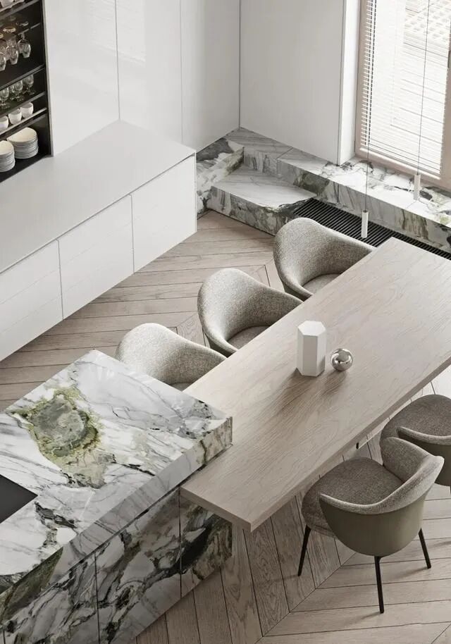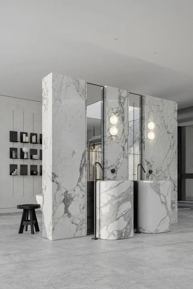 也正是基于设计思路的走向和设计语言的表达,伴随着传统材料的回潮和设计理念的发展,石材在表面建造方式上也出现了创新。不同的表皮效果,也带来了不同的设计视觉感受。