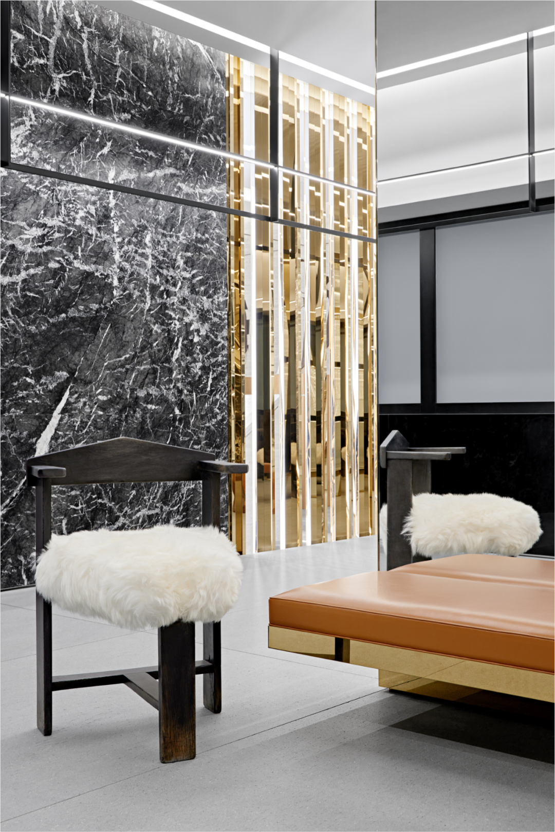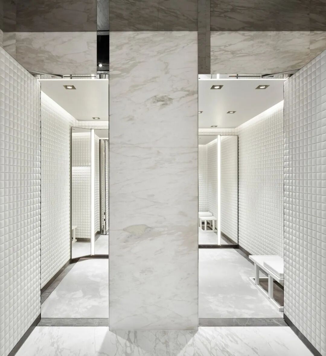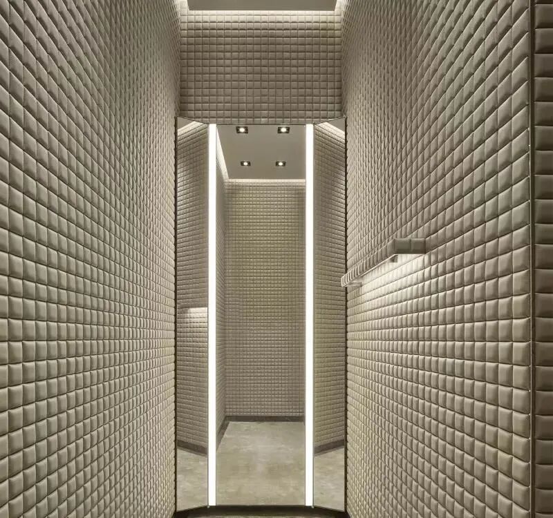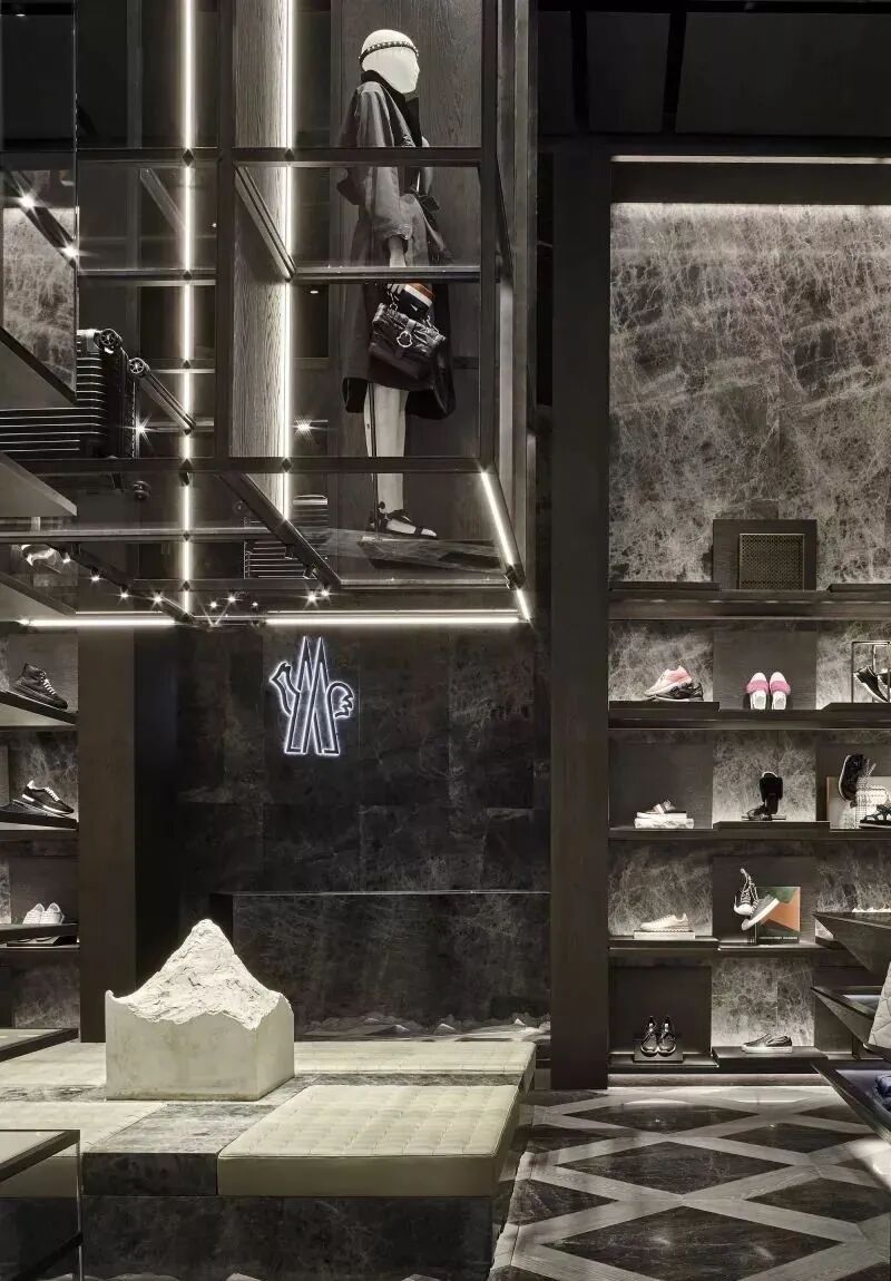 自然的力量也用深色木材和灰色宝石中精心挑选的调色板表达。它们的质地同时体现了精致和优雅,为所有品牌系列创造了永恒的舞台。与黑暗的商店区域相反,试衣间覆盖着绗缝白色皮革,表现出Moncler羽绒服的内衬。