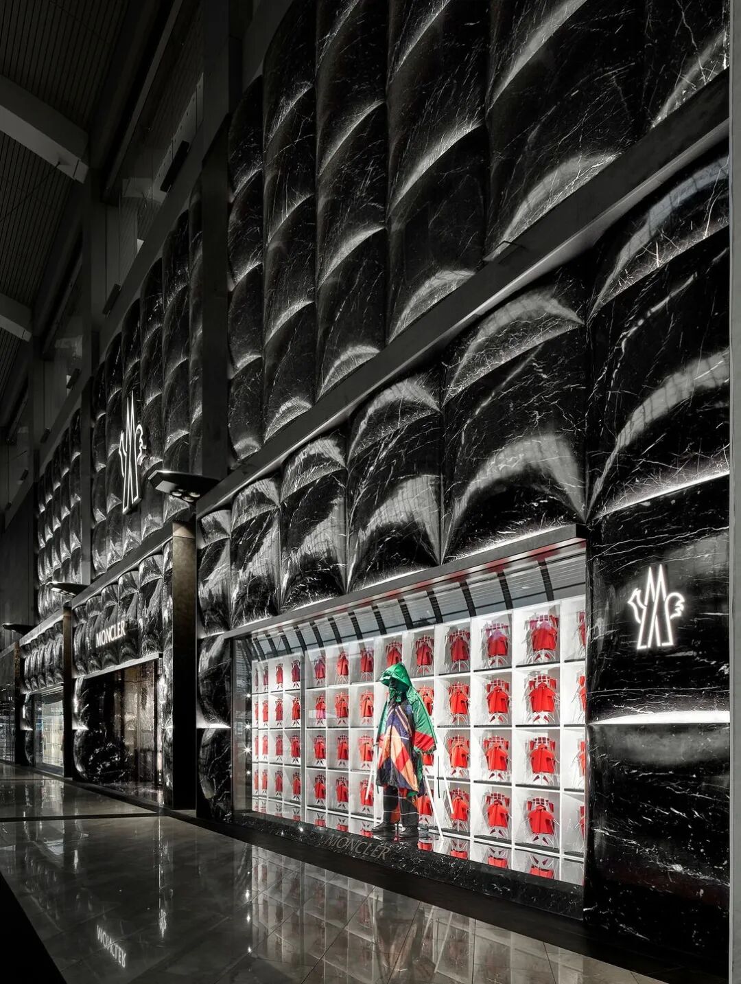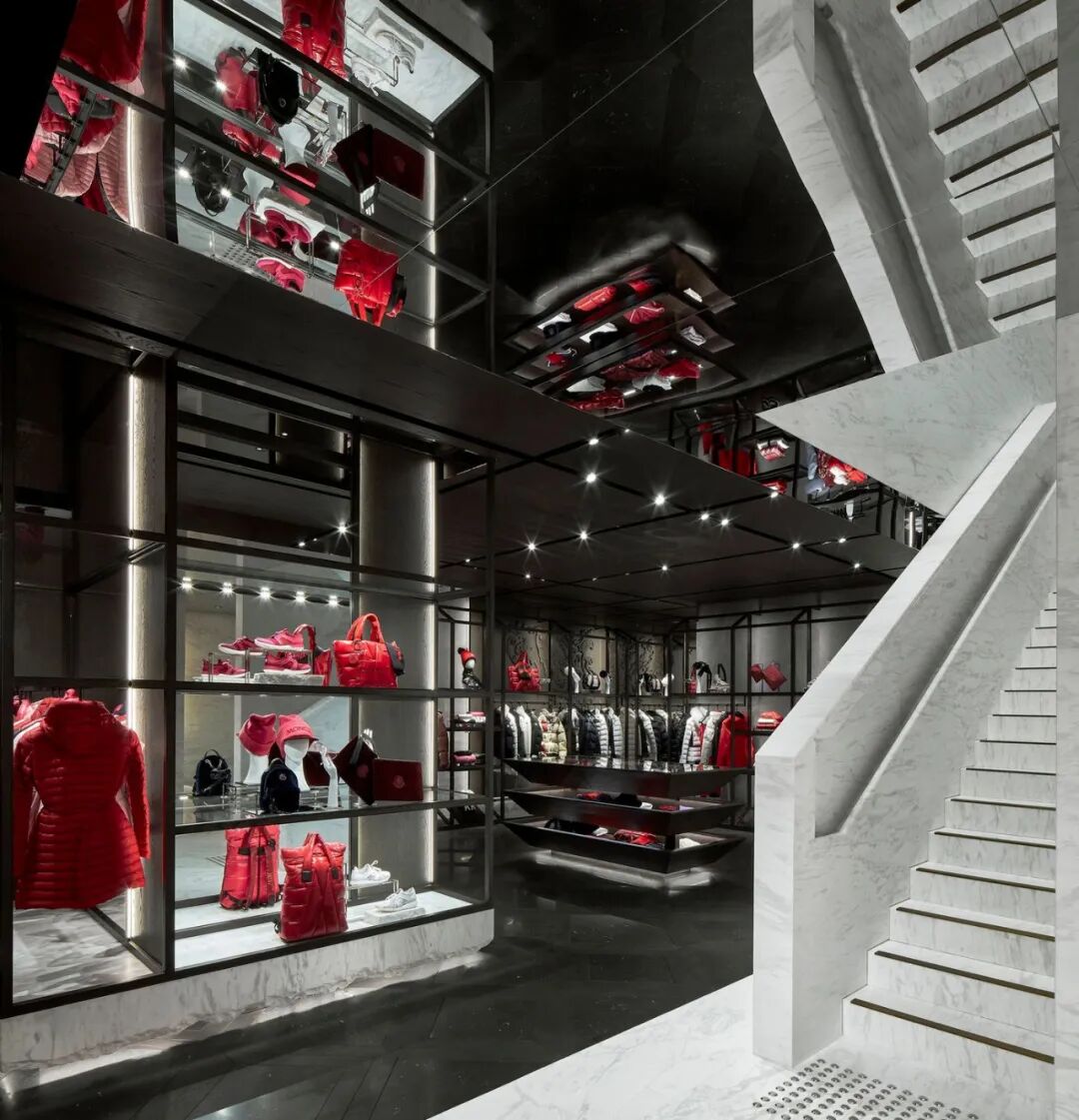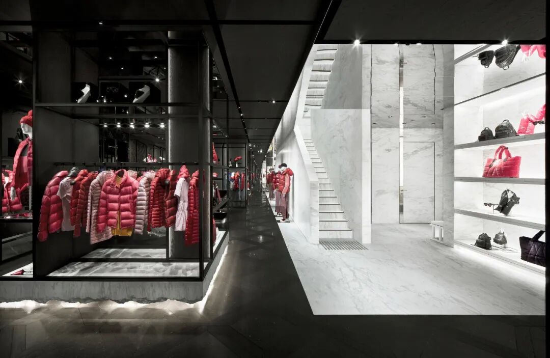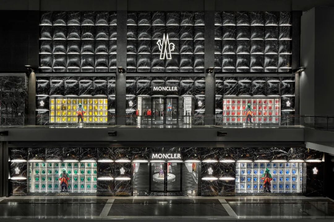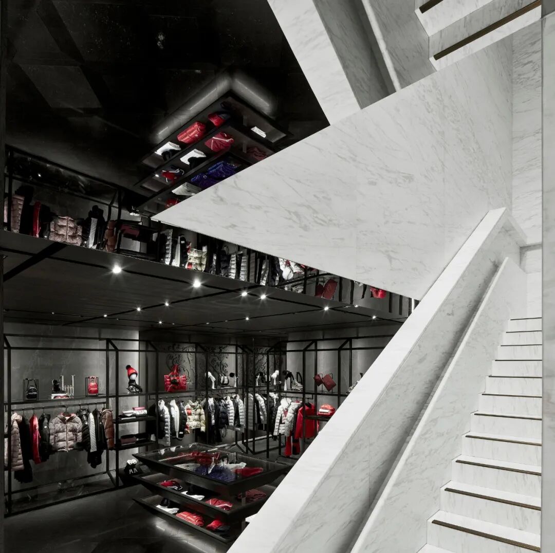 门面是Moncler标志性外形的纯粹表现,132块黑白根大理石看起来像是从里面膨胀的,像是一块软石头,巨大的门面贯穿三层楼,呈标志性设计的连续图案。