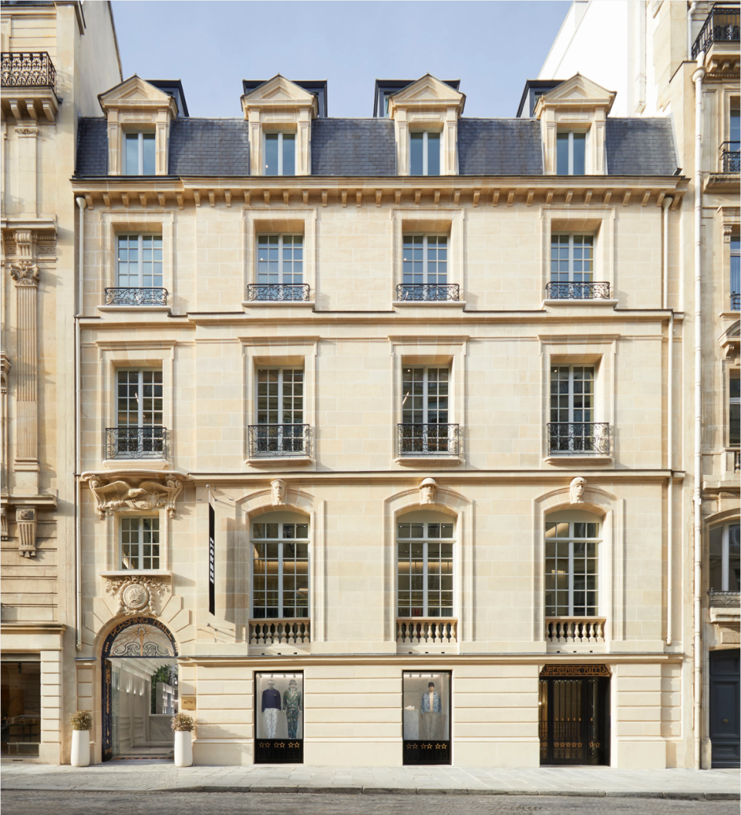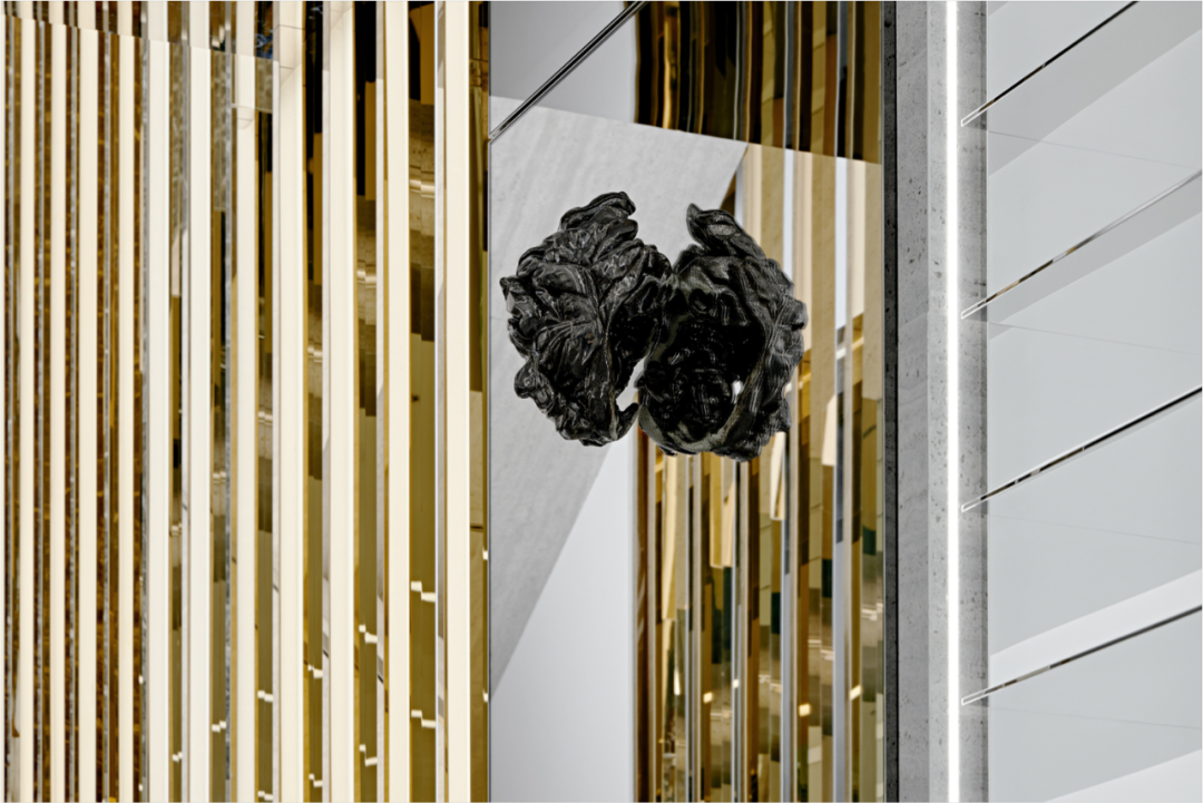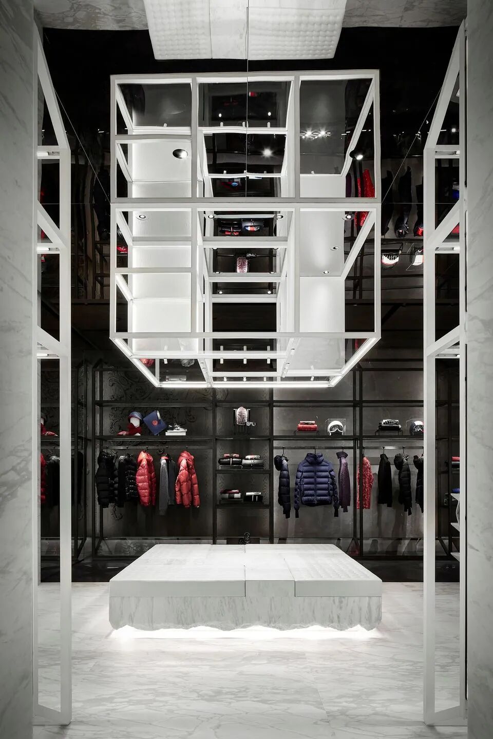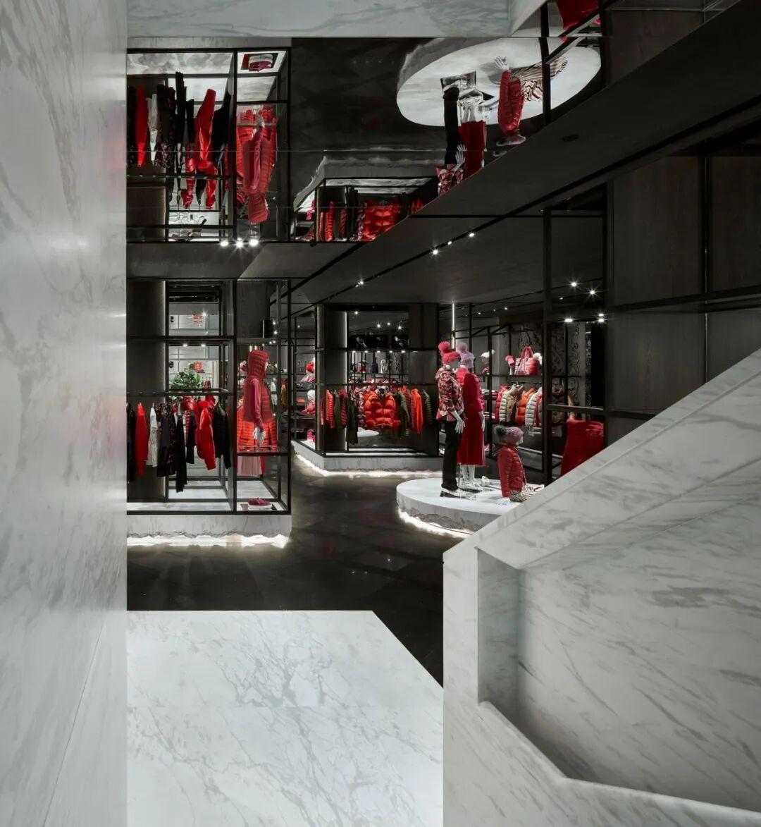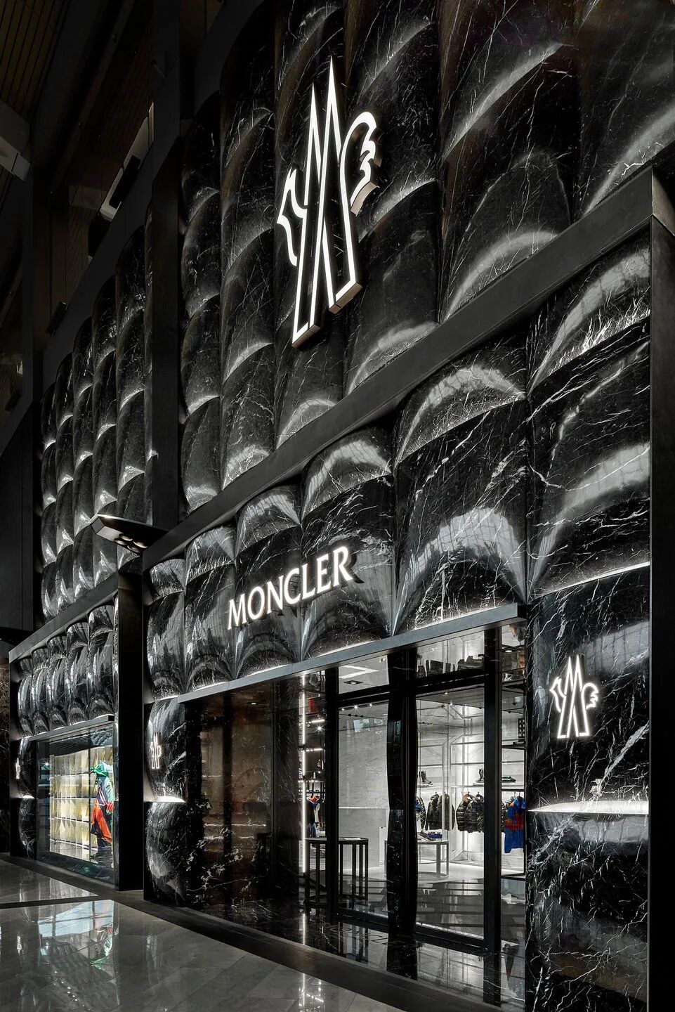 门面是Moncler标志性外形的纯粹表现,132块黑白根大理石看起来像是从里面膨胀的,像是一块软石头,巨大的门面贯穿三层楼,呈标志性设计的连续图案。