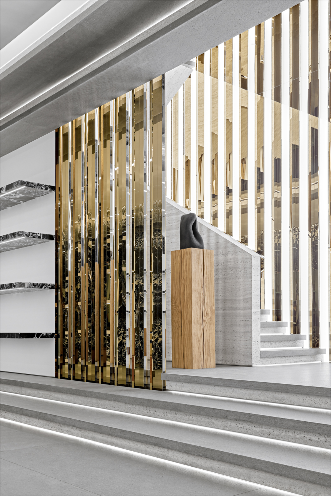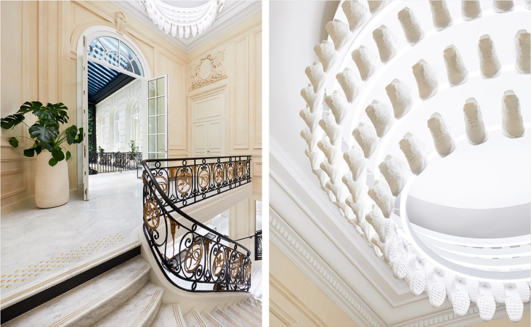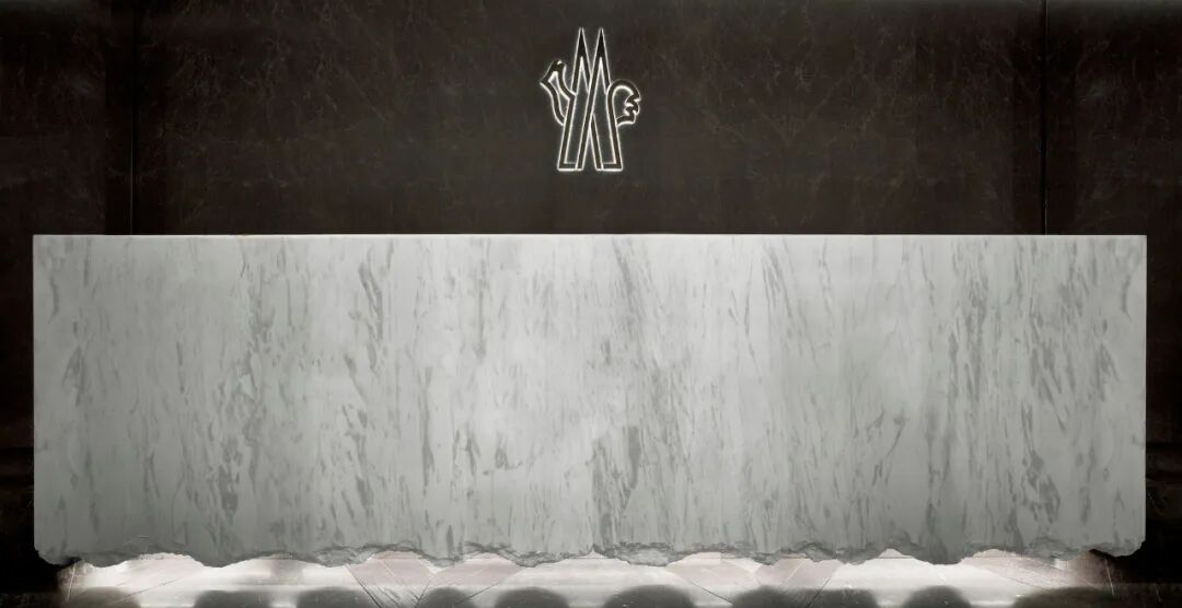 门面以巨大的白色爵士白大理石欢迎游客,就像是巨大的浮动的冰山,向观众展示了品牌的精髓。精致的石材切割描绘了破碎的冰块表面,表达了自然的美丽和力量。