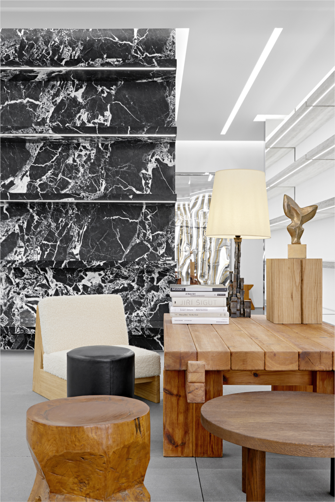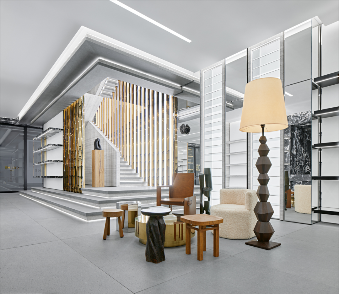 该店铺位于购物中心北部的一栋建筑中,占据了两层楼,其特色是由Celine以难以捉摸著称的创意总监Hedi Slimane制定的当代奢华设计规范。纯净的白色墙壁、落地镜子、大块的黑白大理石和大块的石板瓷砖地板构成了背景,严格挑选的主要是木质家具、大理石覆盖的展示柜,以及Slimane从Celine艺术项目中精心挑选的艺术品。女装和男装系列的产品都摆放在光滑的悬浮金属衣架上,还有玻璃或大理石和金属衬里的架子上。一个主要的焦点是由闪亮的粗条包围的大理石楼梯。