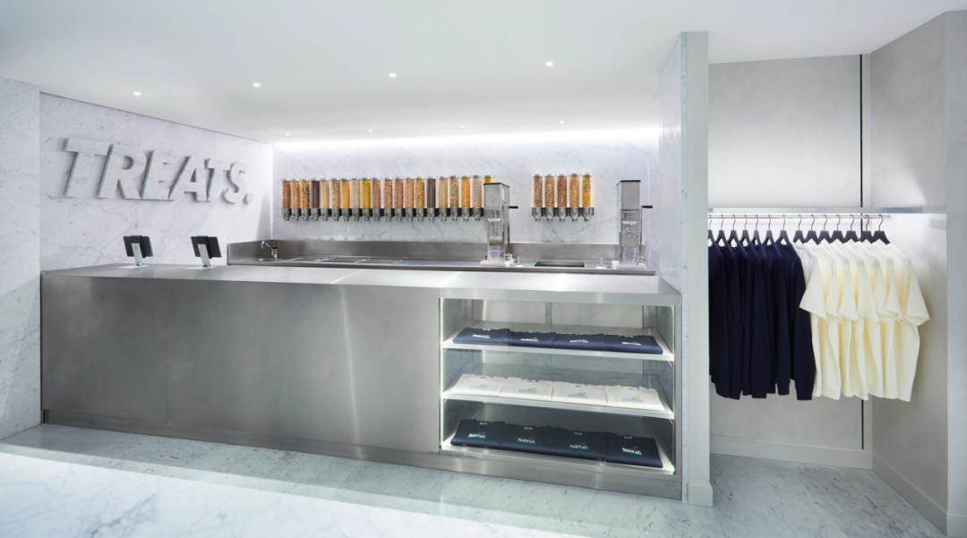 一楼还有一个Kith Treats的柜台,用大理石和钢材做成,供应冰淇淋和麦片,除了自有的服装外,还包括该品牌的知名朋友圈里的标志性品种和特殊调制品。