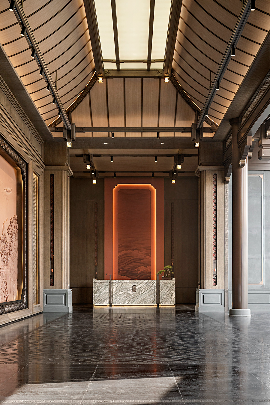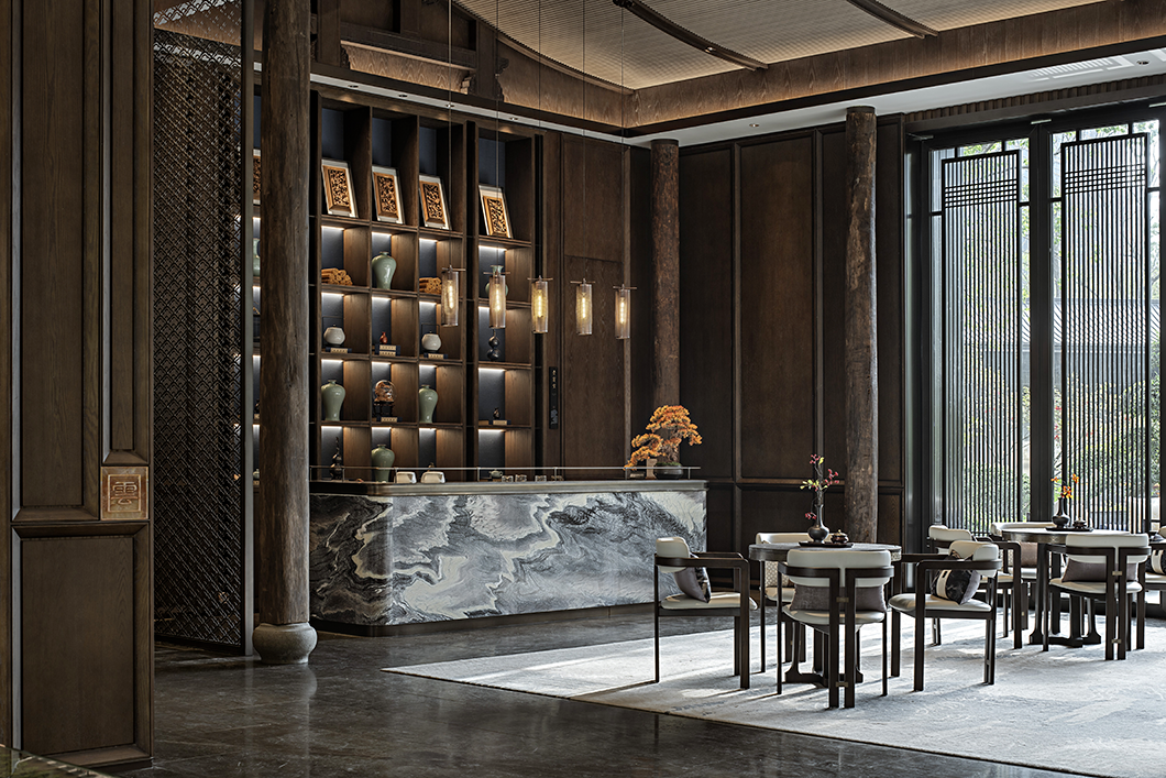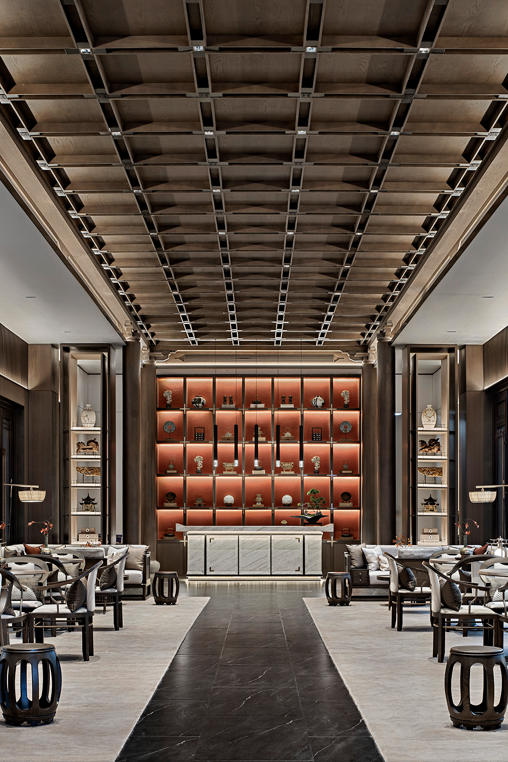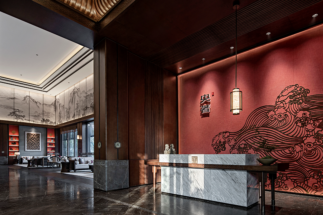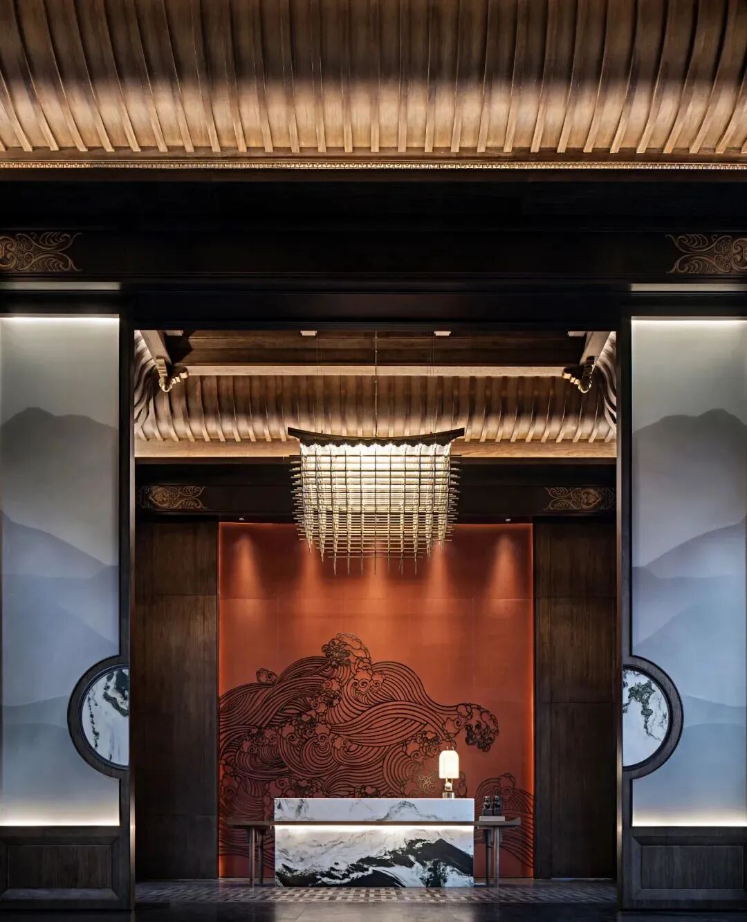 中国风元素集中体现在各种传统造型、饰物跟天然大理石的纹理搭配让整个大堂空间更高雅贵气,通过石材与灯光、木材、金属的协调,可以更好的提升整个装饰的档次,带来超乎想象的效果,一起来欣赏吧!