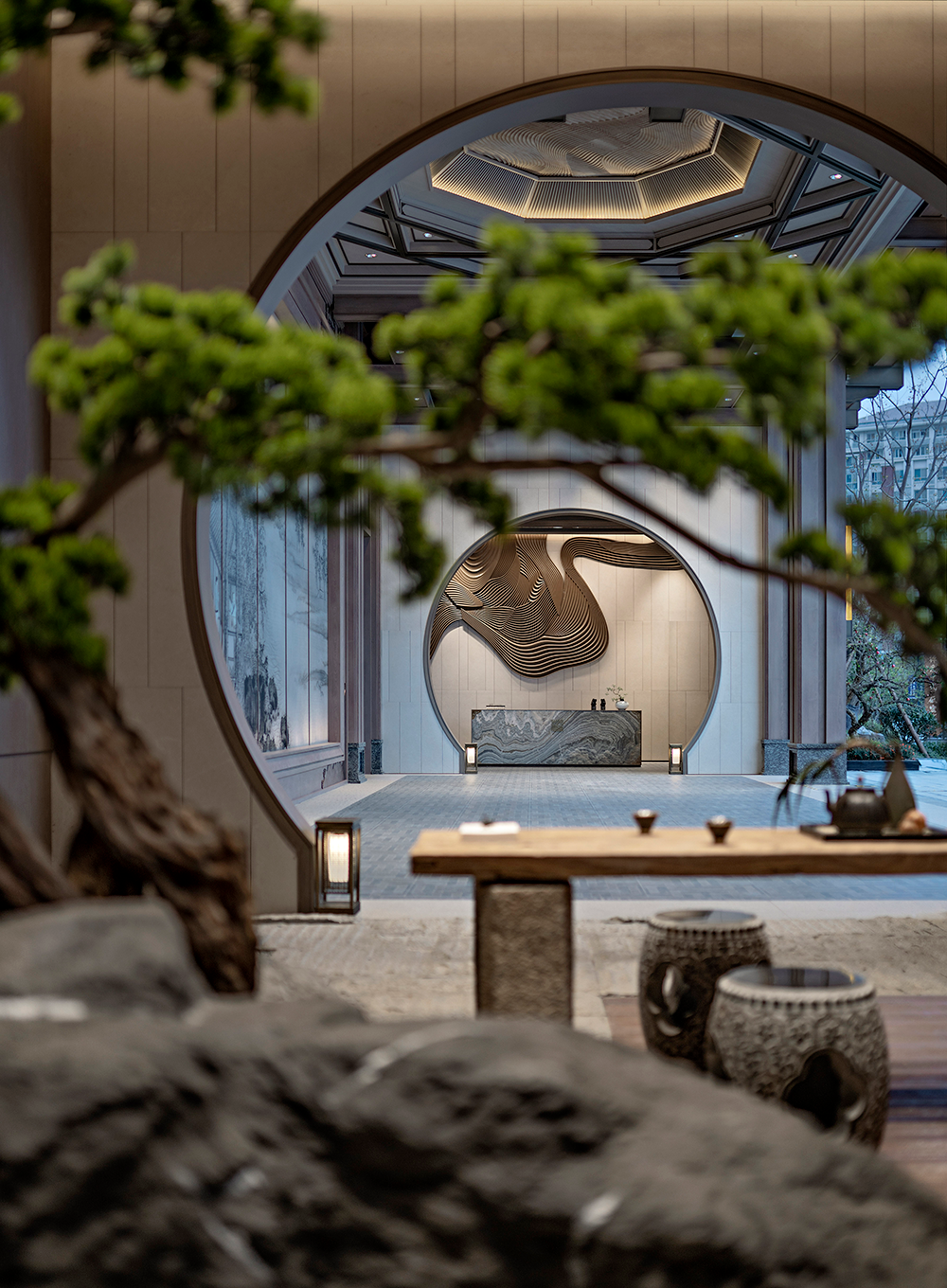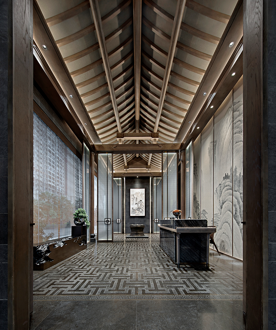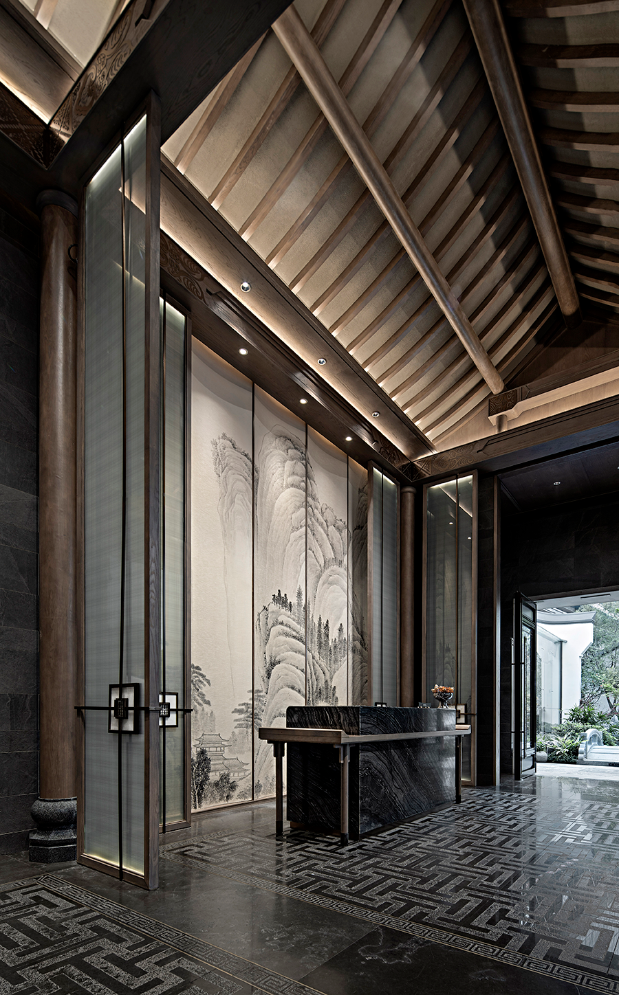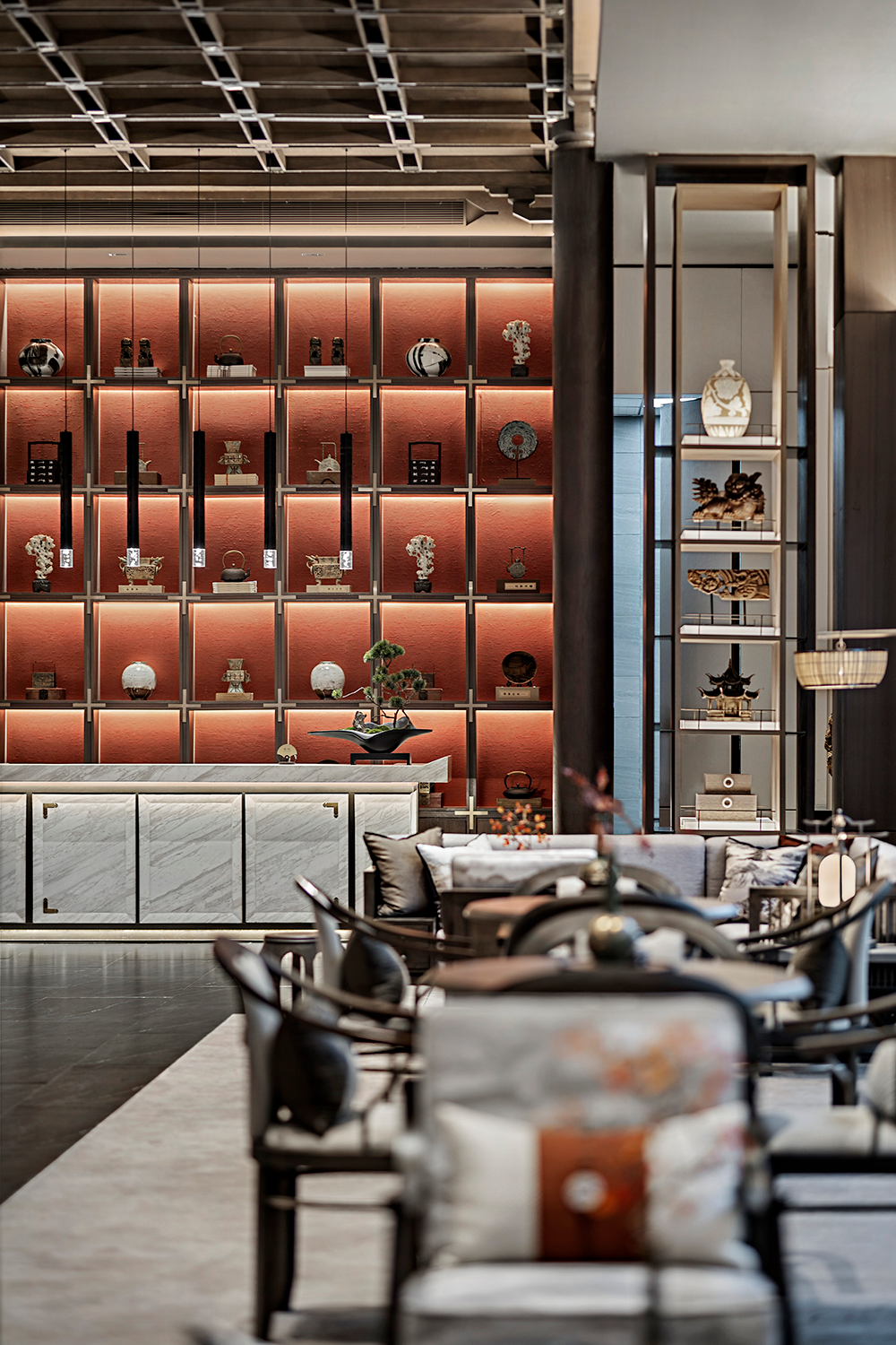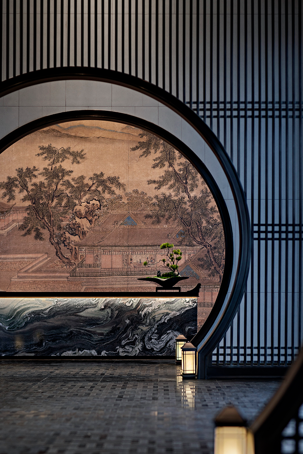 中国风元素集中体现在各种传统造型、饰物跟天然大理石的纹理搭配让整个大堂空间更高雅贵气,通过石材与灯光、木材、金属的协调,可以更好的提升整个装饰的档次,带来超乎想象的效果,一起来欣赏吧!