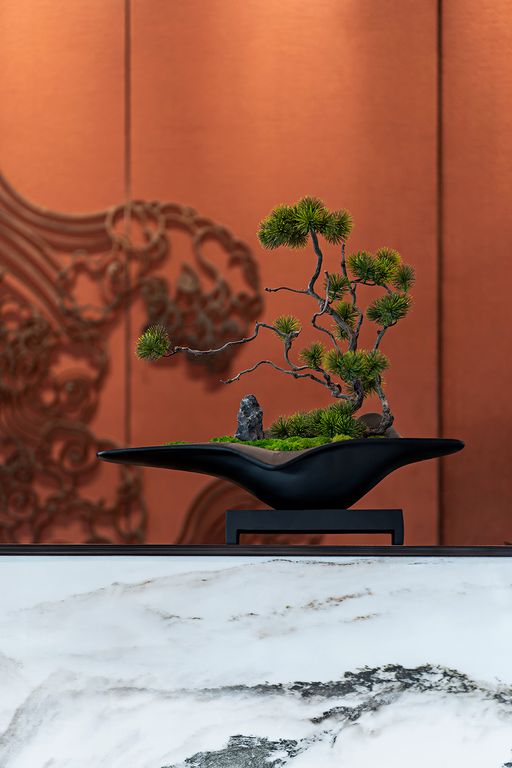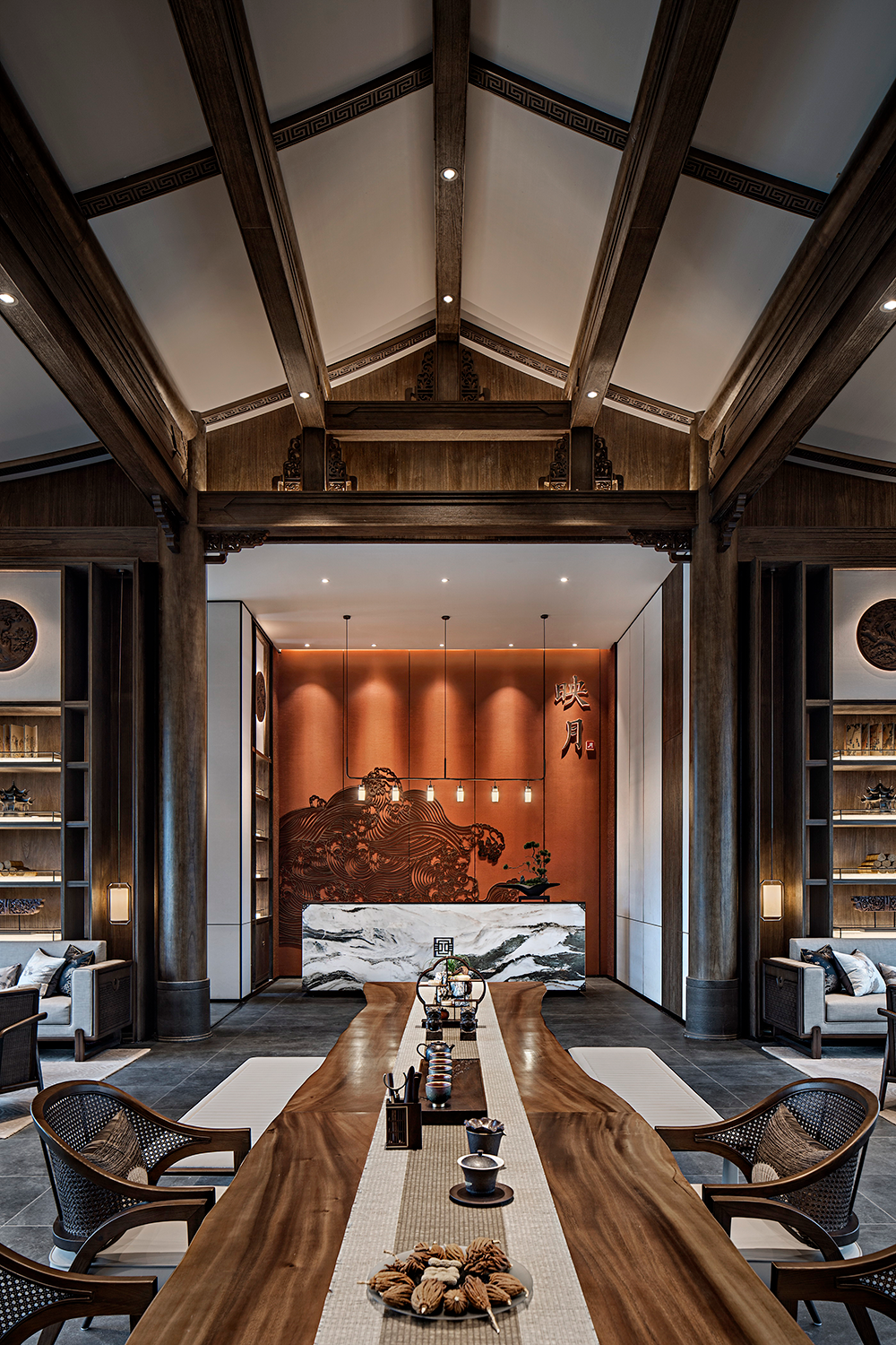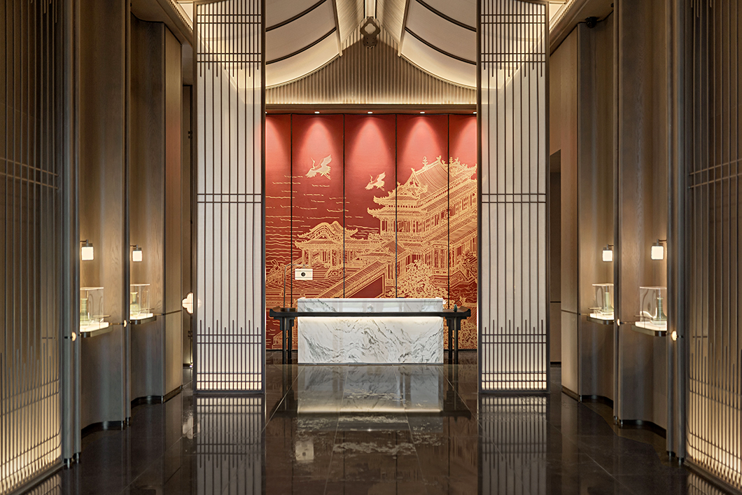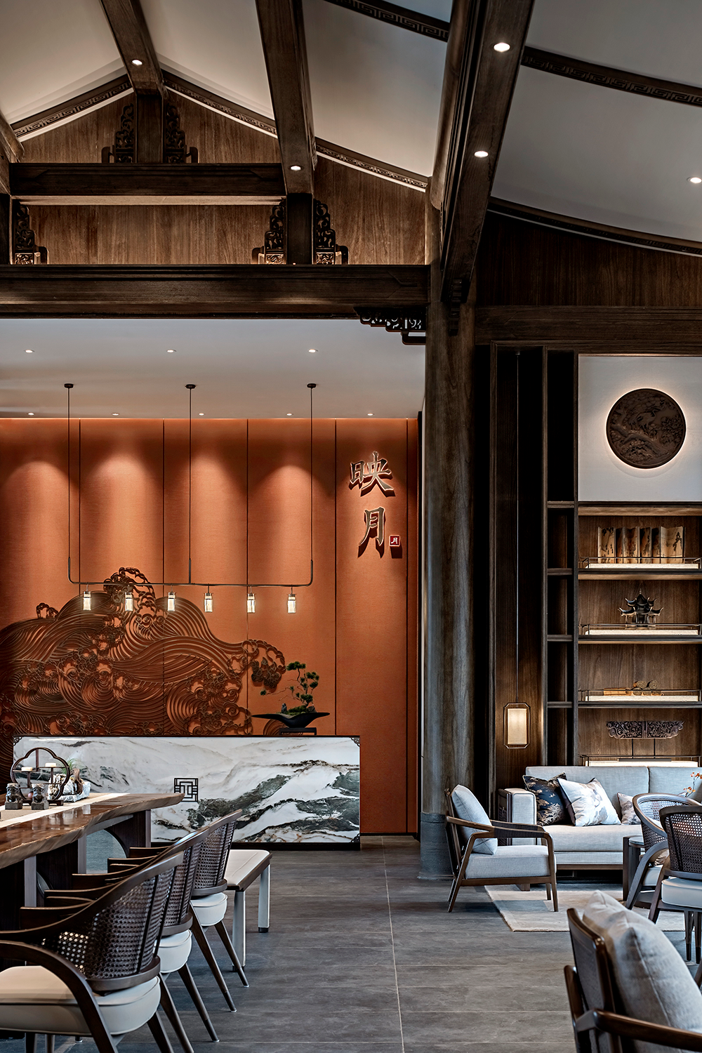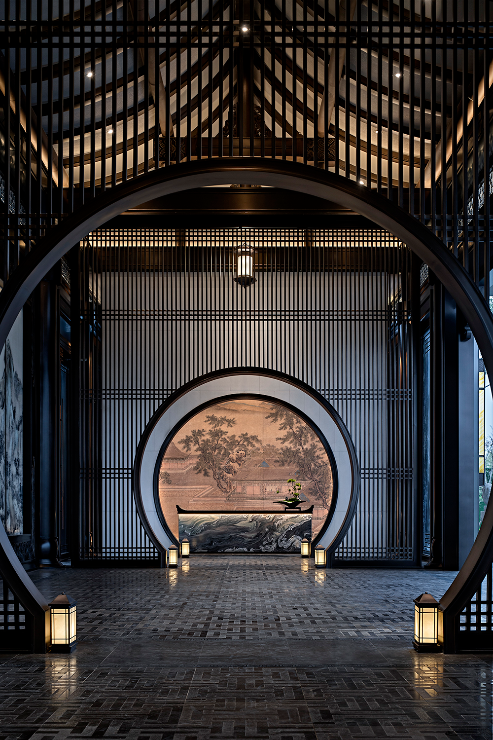 中国风元素集中体现在各种传统造型、饰物跟天然大理石的纹理搭配让整个大堂空间更高雅贵气,通过石材与灯光、木材、金属的协调,可以更好的提升整个装饰的档次,带来超乎想象的效果,一起来欣赏吧!