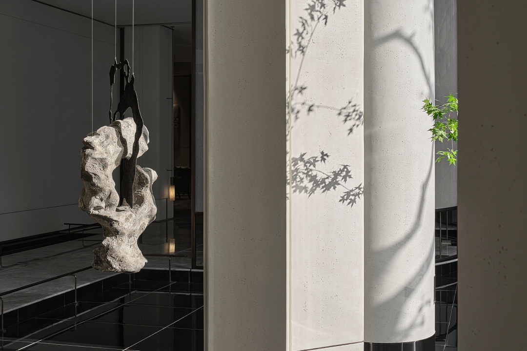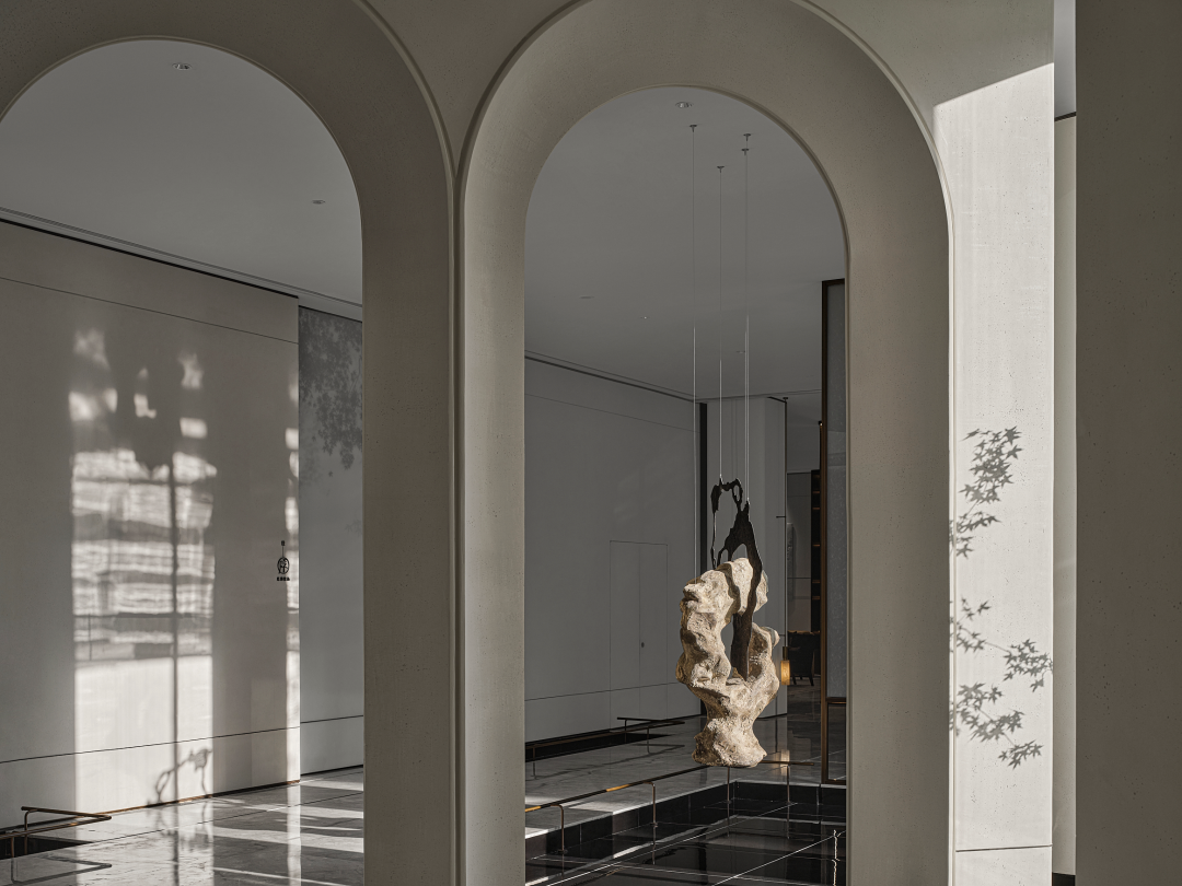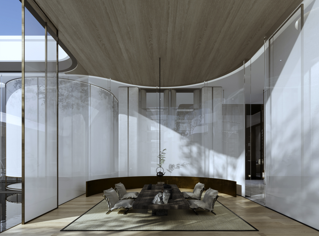 点石引渡,岸二水三,连洞接壑,伫水如州。将庭院之水引至屋檐之下,用水景的迂回曲折,创造自然生趣的漫步连廊,寻着汀步前行,整个空间豁然开朗,似拨开云雾见青天,呈现“月下寂静水庭”的平静与安稳,带来游居于自然的意趣。