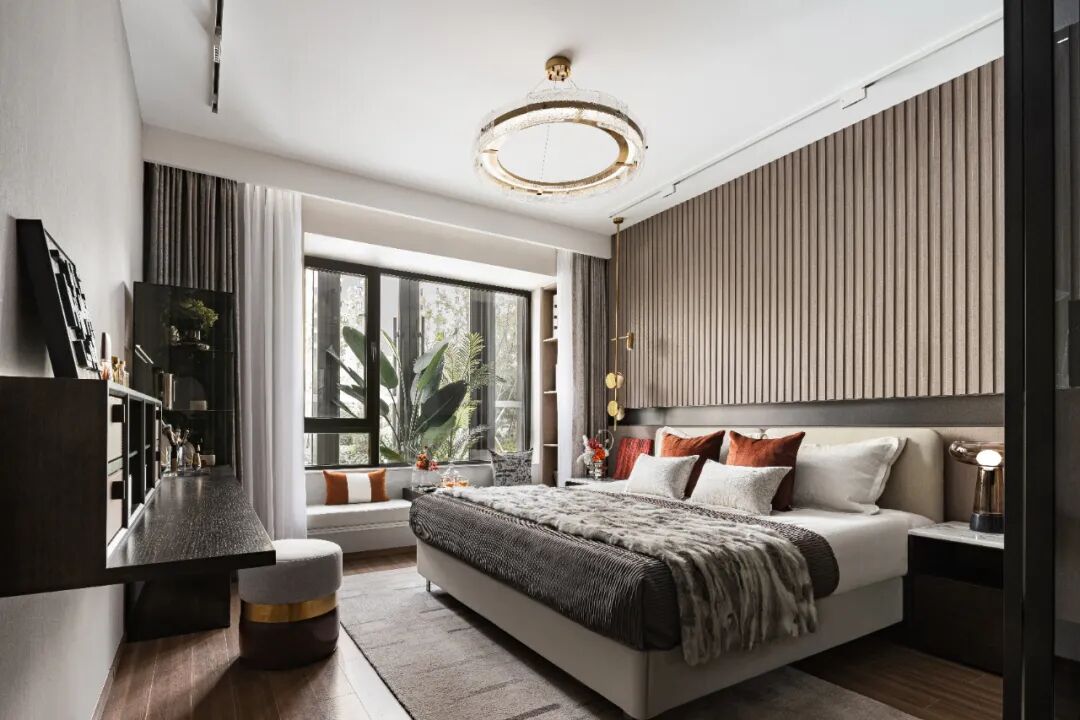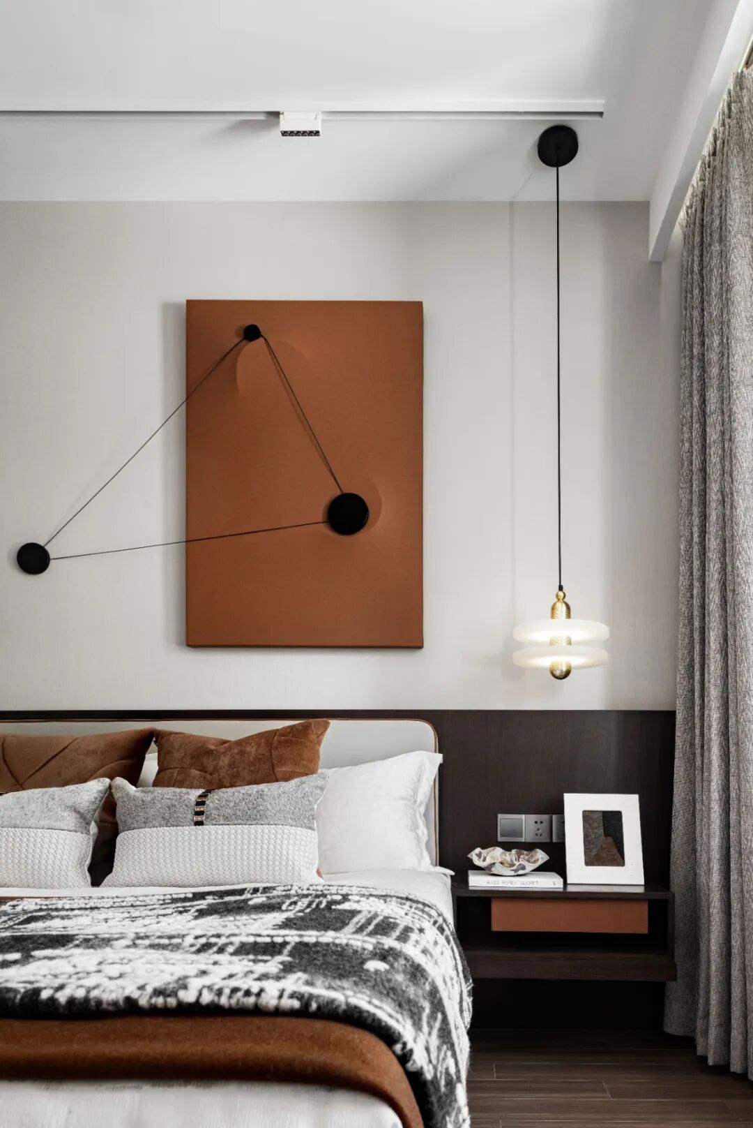 主卧没有繁复的装饰,设计以棕色调赋予空间宁静、深沉的舒适感,午后的阳光透过薄纱映入空间,温暖而不耀眼,在保障了私密性的同时感受四季的变化。