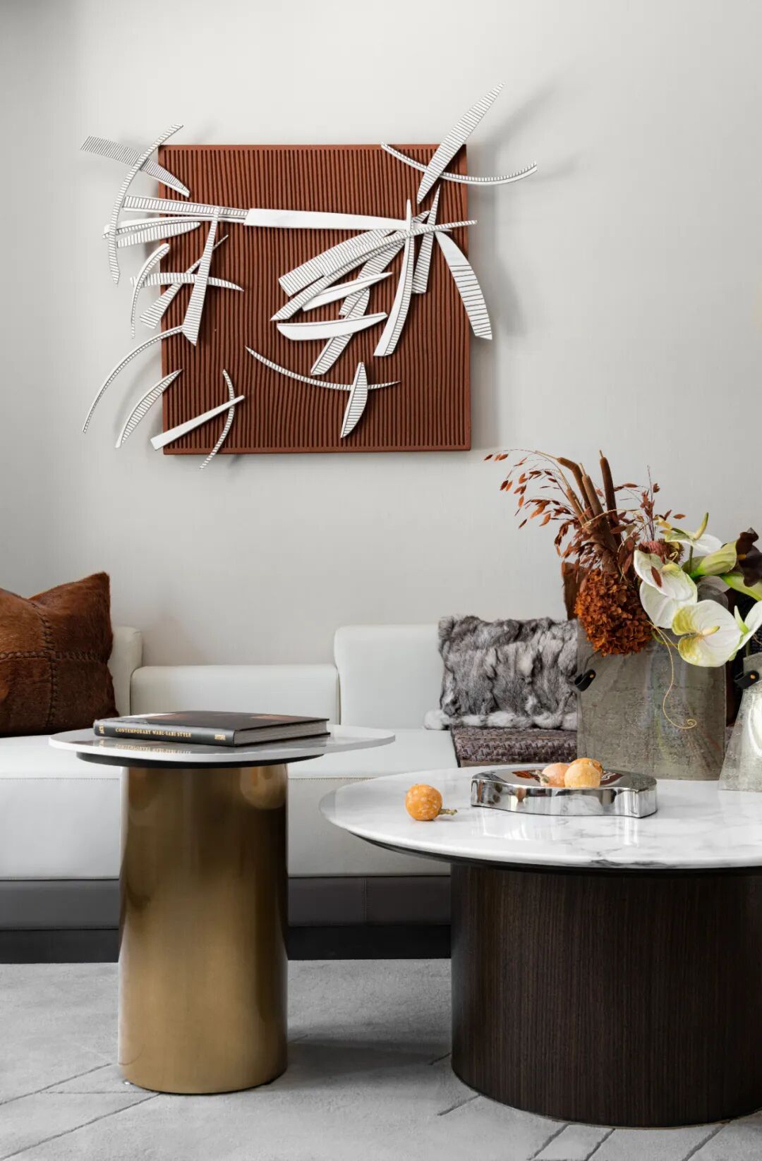 客餐厅软装设计选用造型现代且极具品质感的款型,以浅灰色为主色调,搭配高级时尚的暖咖色,辅以简雅的大理石、精致奢华的金属细节,柔软的皮毛,多种材质肌理之间的碰撞,让空间的时尚节拍悄然奏响。