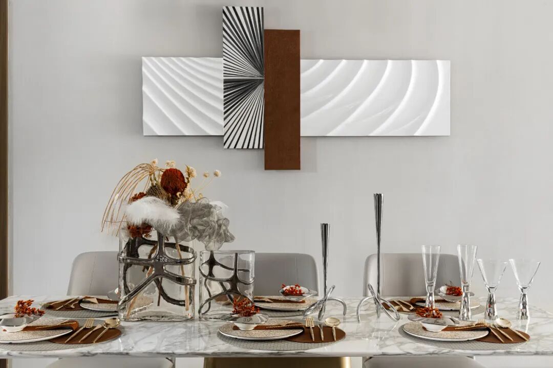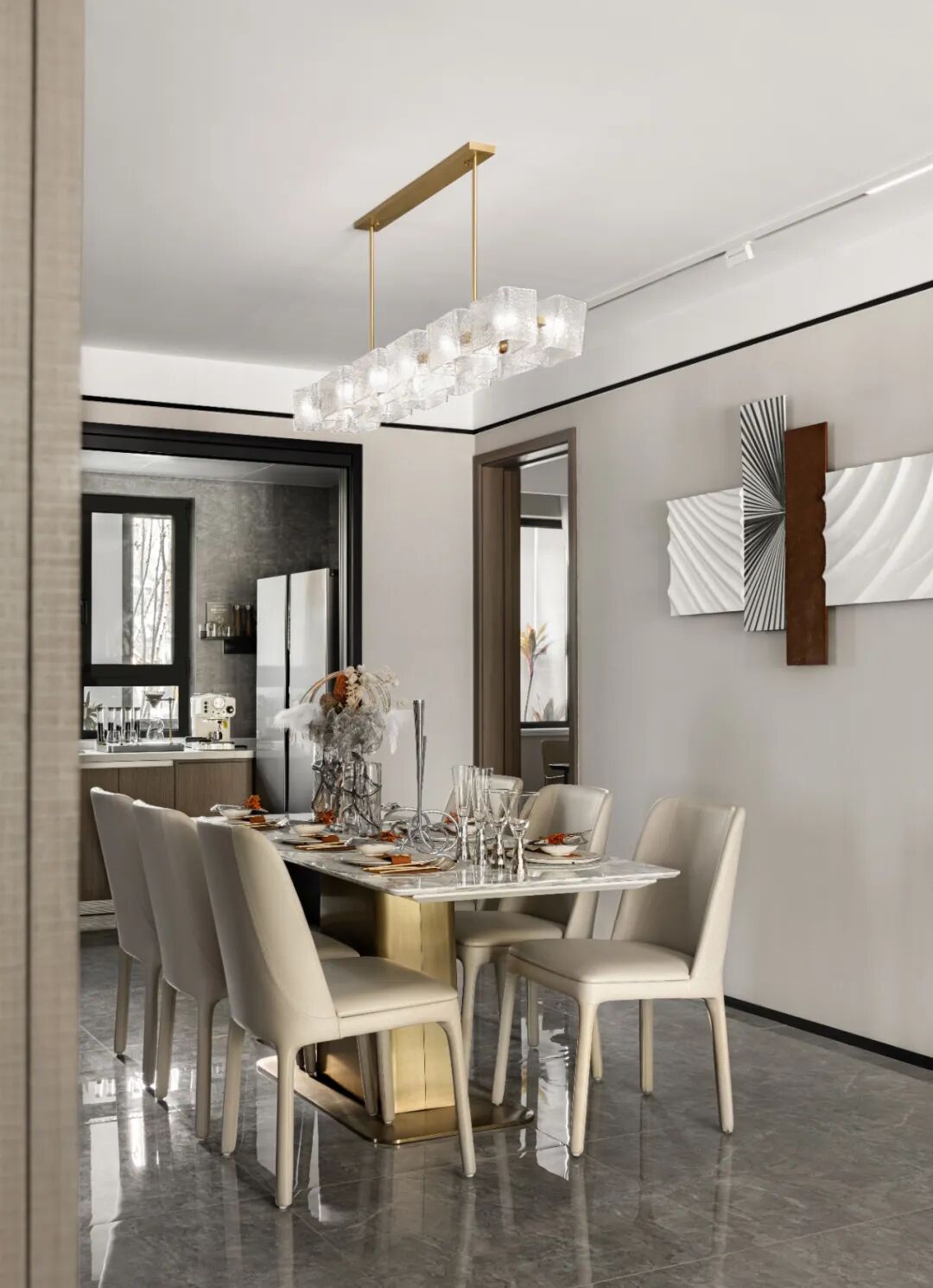 餐厅以奢雅、高级的空间氛围,打造精致的用餐环境,浅灰色的皮质餐椅,赋予视觉上的温润感受,与硬朗的大理石金属餐桌形成对比,在克制中尽显优雅,在光影之间感受居家的温暖。