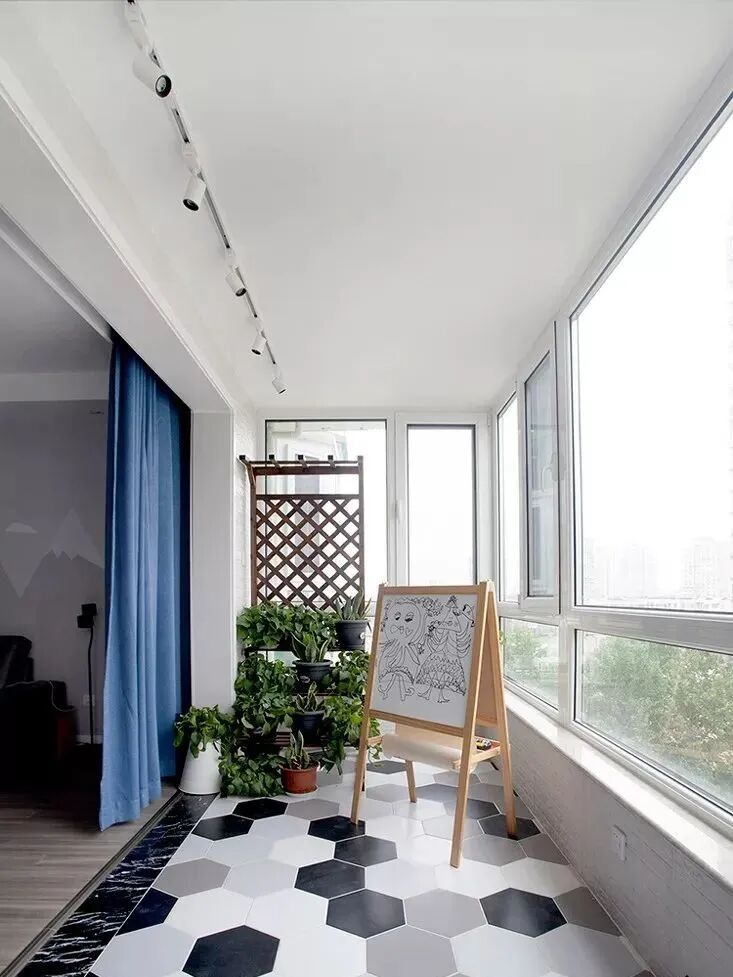 4.六角砖六角砖造价贵,在阳台这样小面积的地方使用可节省成本,也非常美观。六角砖黑白灰是最常见的,还有一些其他彩色的,这要看你自己的喜好,以及与阳台的搭配。