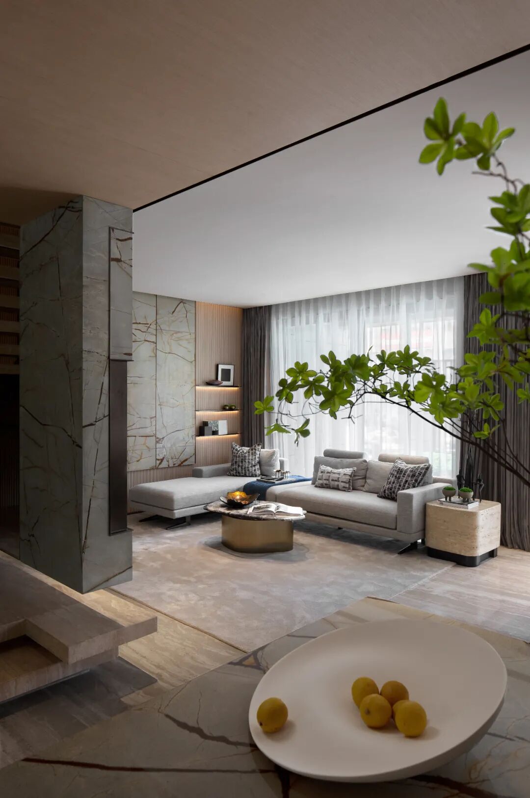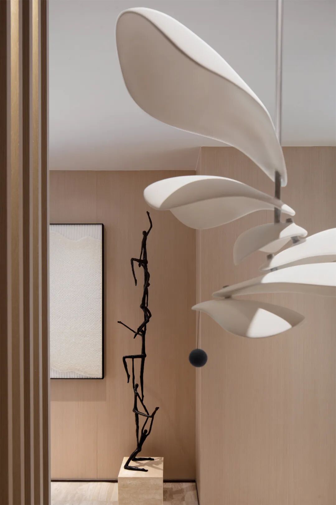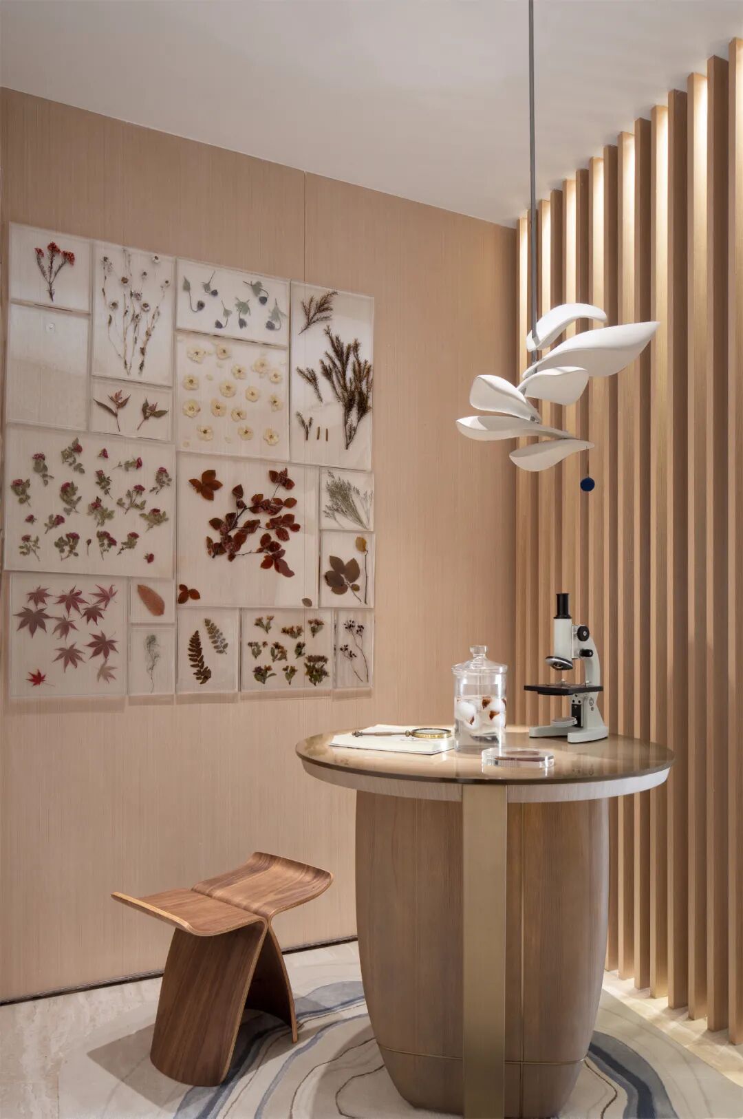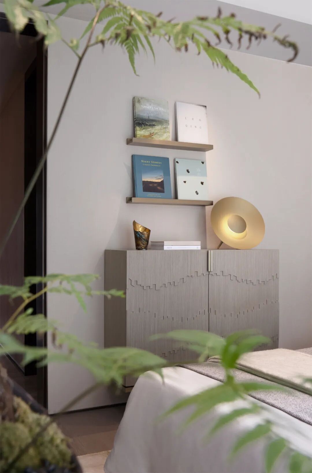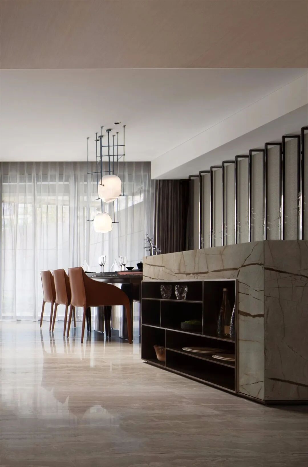 大理石的天然纹理所带来的质朴气息,中和木的轻盈,材质的柔软贯穿客厅、餐厅和厨房,灵动非常,且随着光影深浅和“人”自行的生活规律、时间习惯,衍生细微差别的氛围感。以自然为基点的糅合,通过知觉、感官和情绪,突破空间框架限制,达到一种平衡,力量和细腻,可能与不可能,都在其中,并借助理性逻辑塑造出一个有趣多变的意向空间。借助大自然的丰富形态,将人与自然、自然与空间合二为一,试图在引导人们在自然中寻找自我。
