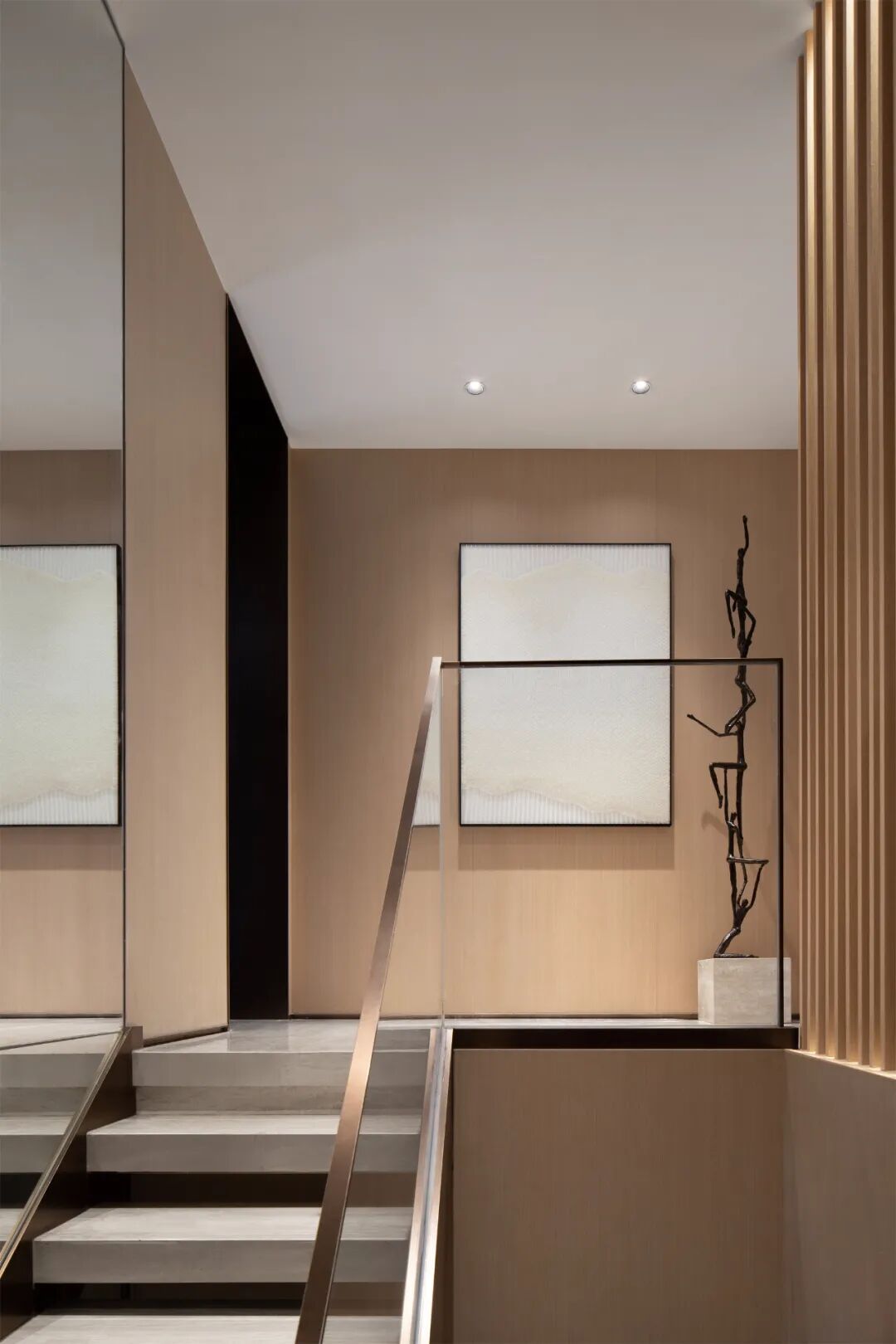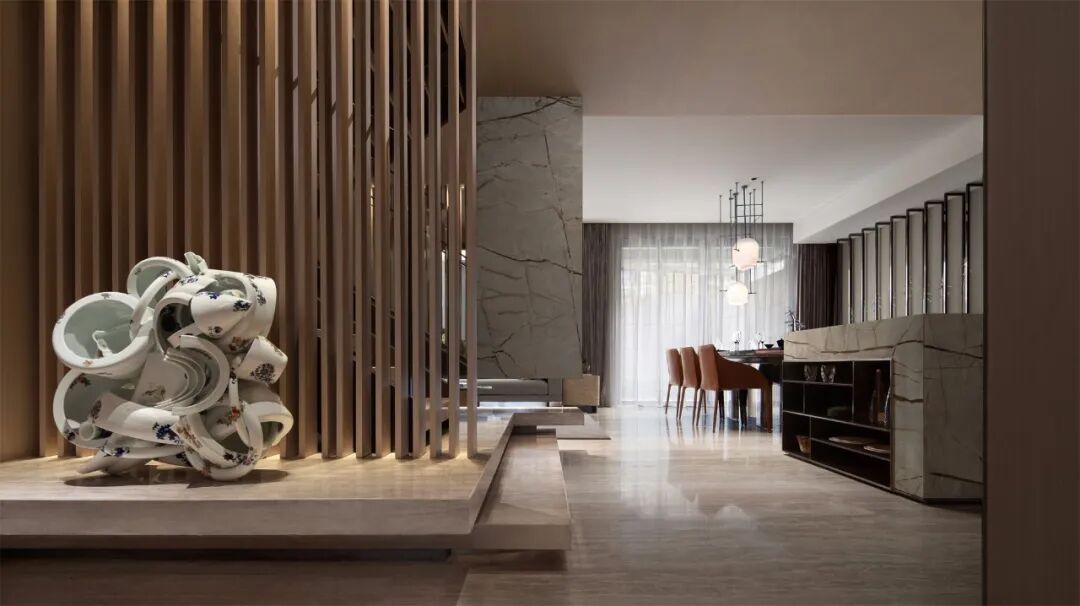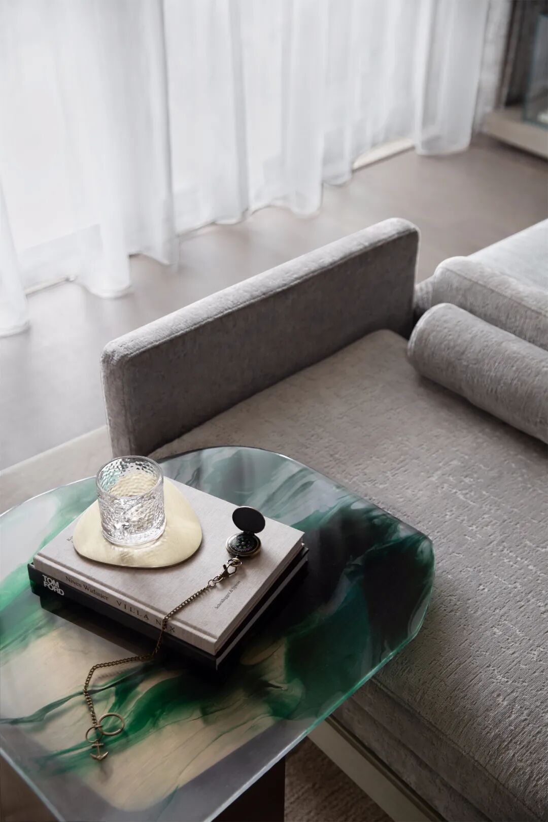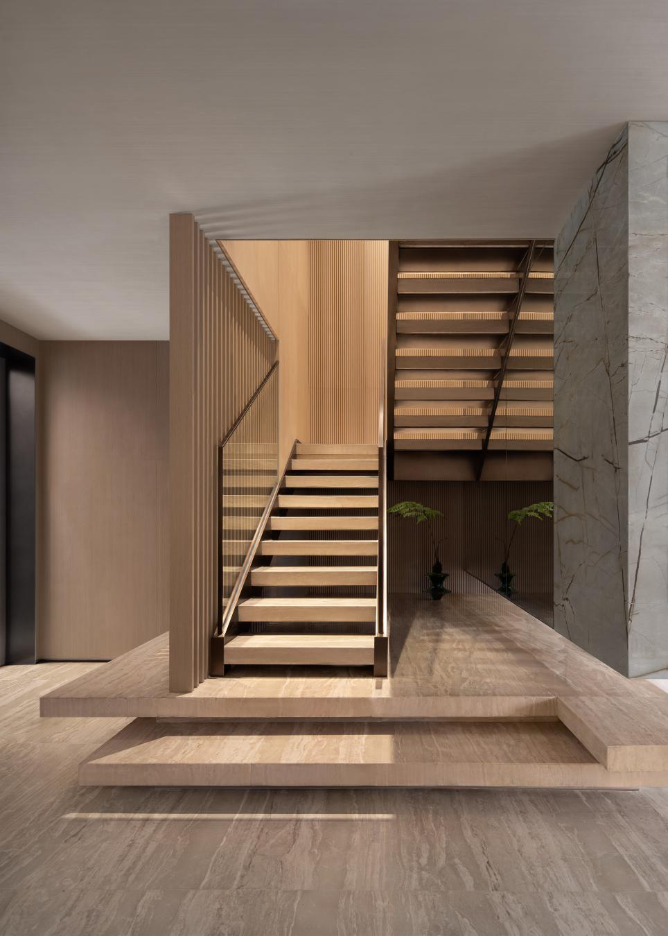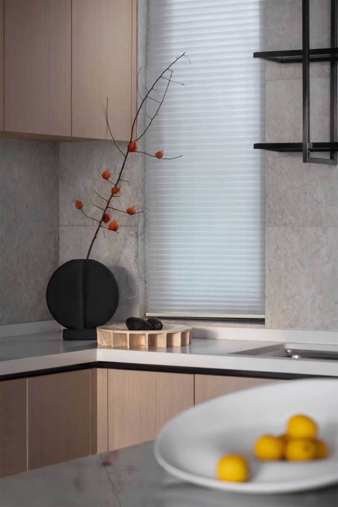 大理石的天然纹理所带来的质朴气息,中和木的轻盈,材质的柔软贯穿客厅、餐厅和厨房,灵动非常,且随着光影深浅和“人”自行的生活规律、时间习惯,衍生细微差别的氛围感。以自然为基点的糅合,通过知觉、感官和情绪,突破空间框架限制,达到一种平衡,力量和细腻,可能与不可能,都在其中,并借助理性逻辑塑造出一个有趣多变的意向空间。借助大自然的丰富形态,将人与自然、自然与空间合二为一,试图在引导人们在自然中寻找自我。
