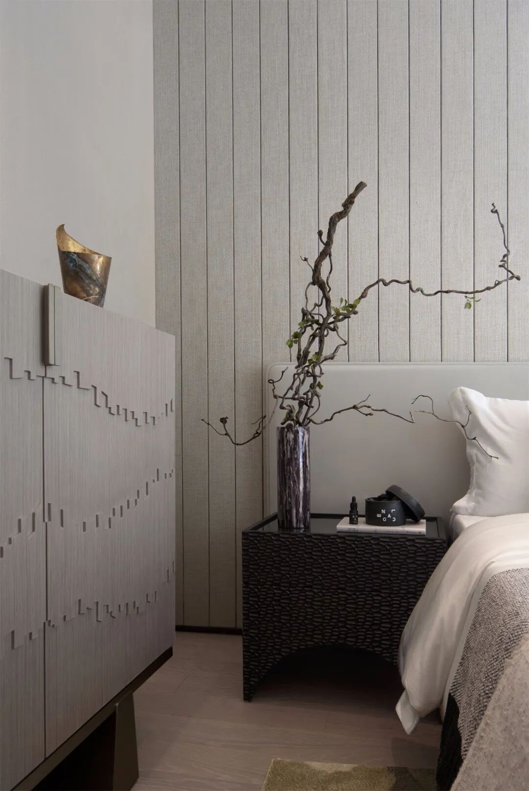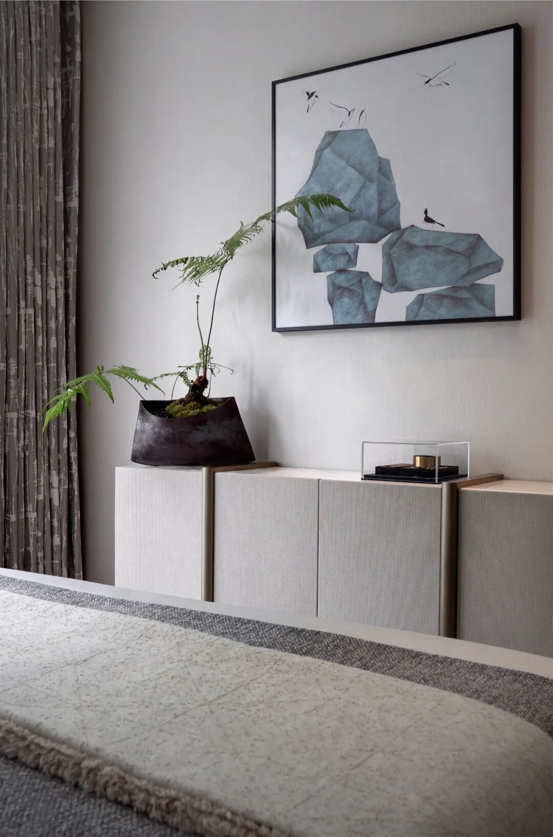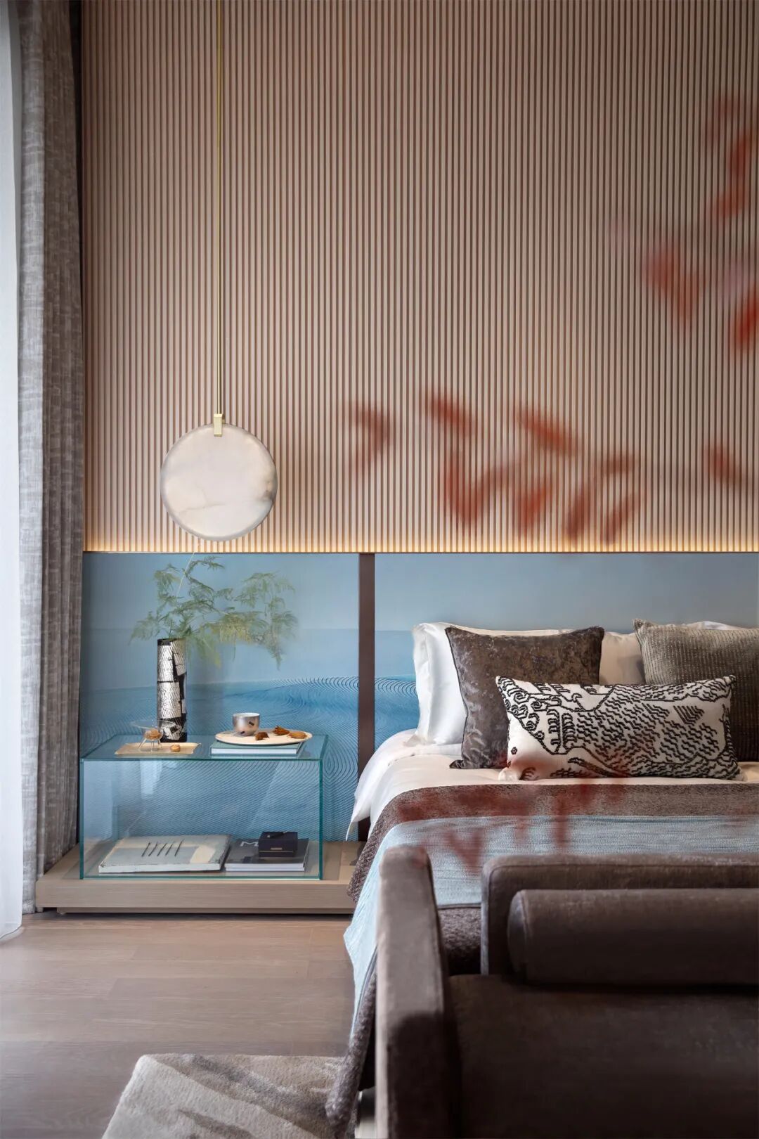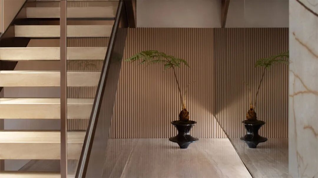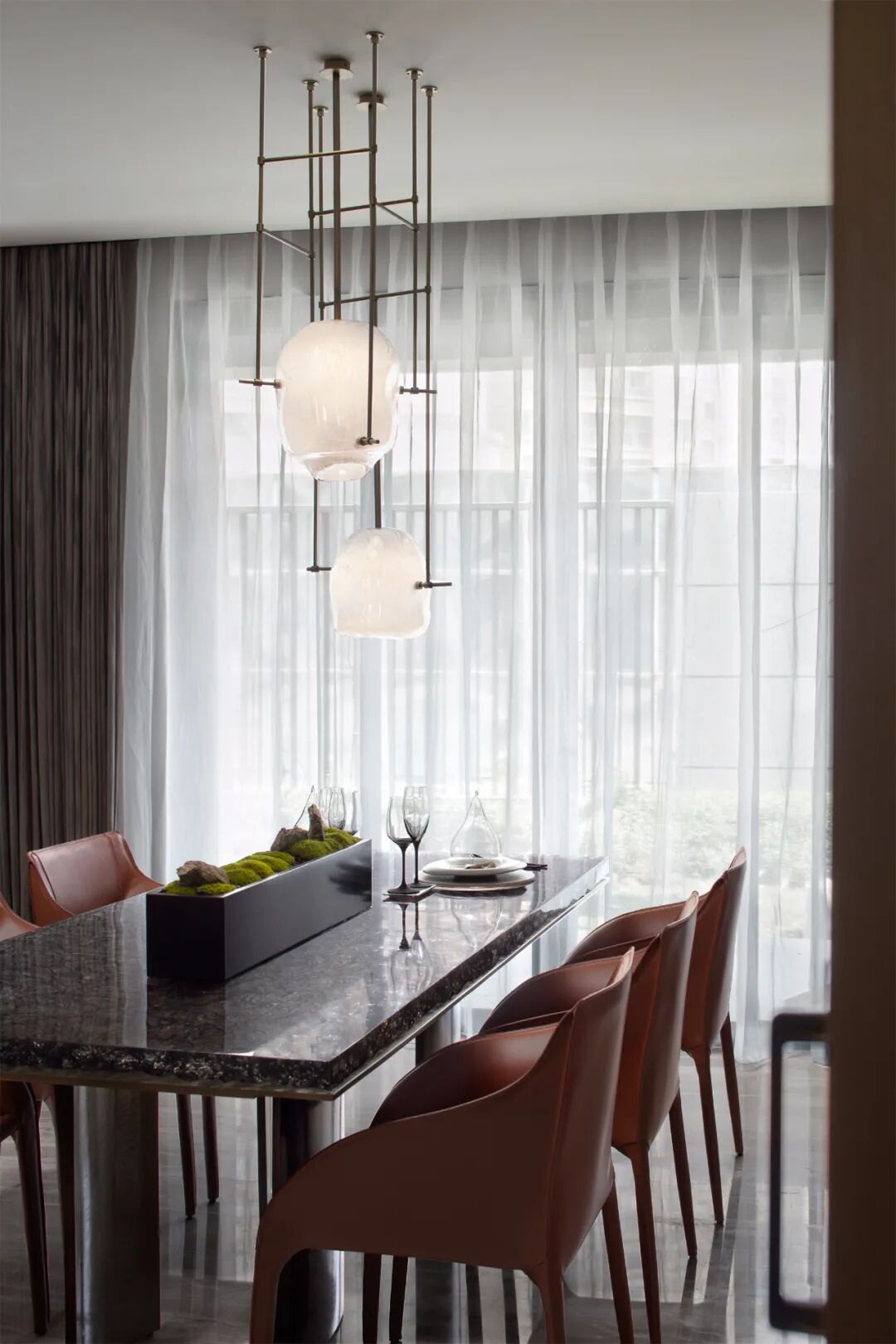 大理石的天然纹理所带来的质朴气息,中和木的轻盈,材质的柔软贯穿客厅、餐厅和厨房,灵动非常,且随着光影深浅和“人”自行的生活规律、时间习惯,衍生细微差别的氛围感。以自然为基点的糅合,通过知觉、感官和情绪,突破空间框架限制,达到一种平衡,力量和细腻,可能与不可能,都在其中,并借助理性逻辑塑造出一个有趣多变的意向空间。借助大自然的丰富形态,将人与自然、自然与空间合二为一,试图在引导人们在自然中寻找自我。