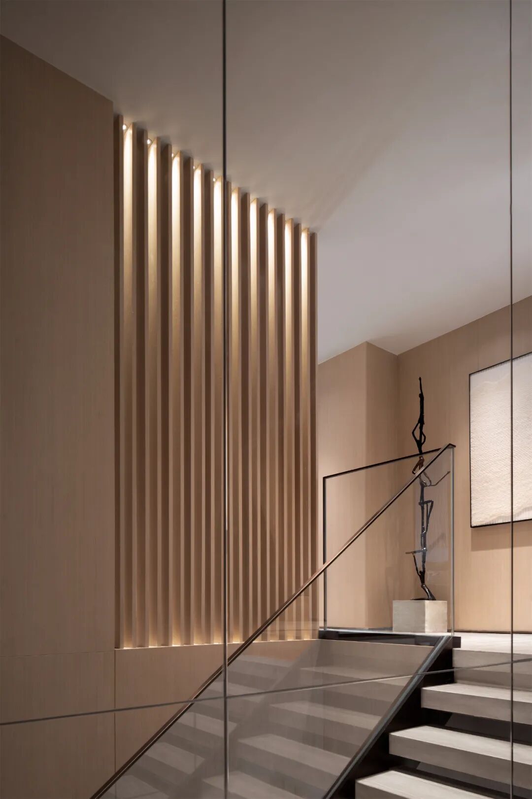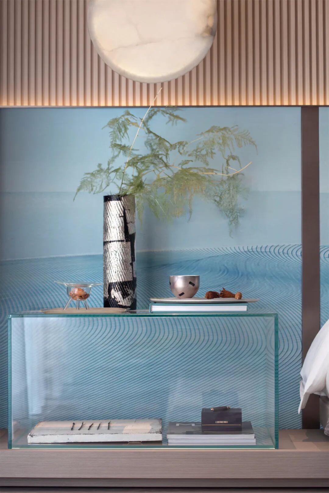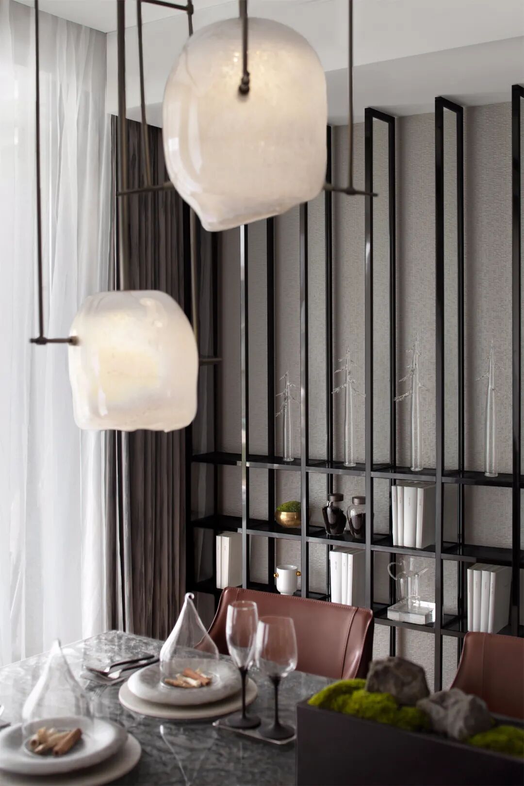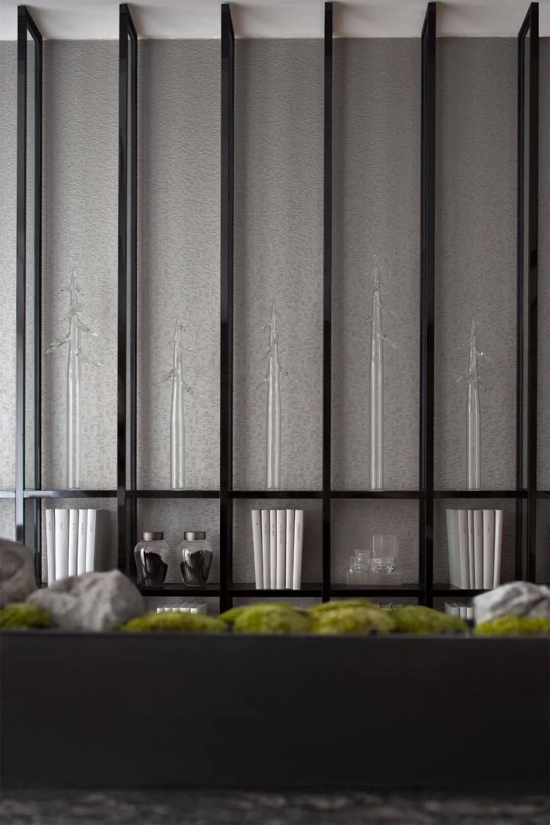 大理石的天然纹理所带来的质朴气息,中和木的轻盈,材质的柔软贯穿客厅、餐厅和厨房,灵动非常,且随着光影深浅和“人”自行的生活规律、时间习惯,衍生细微差别的氛围感。以自然为基点的糅合,通过知觉、感官和情绪,突破空间框架限制,达到一种平衡,力量和细腻,可能与不可能,都在其中,并借助理性逻辑塑造出一个有趣多变的意向空间。借助大自然的丰富形态,将人与自然、自然与空间合二为一,试图在引导人们在自然中寻找自我。