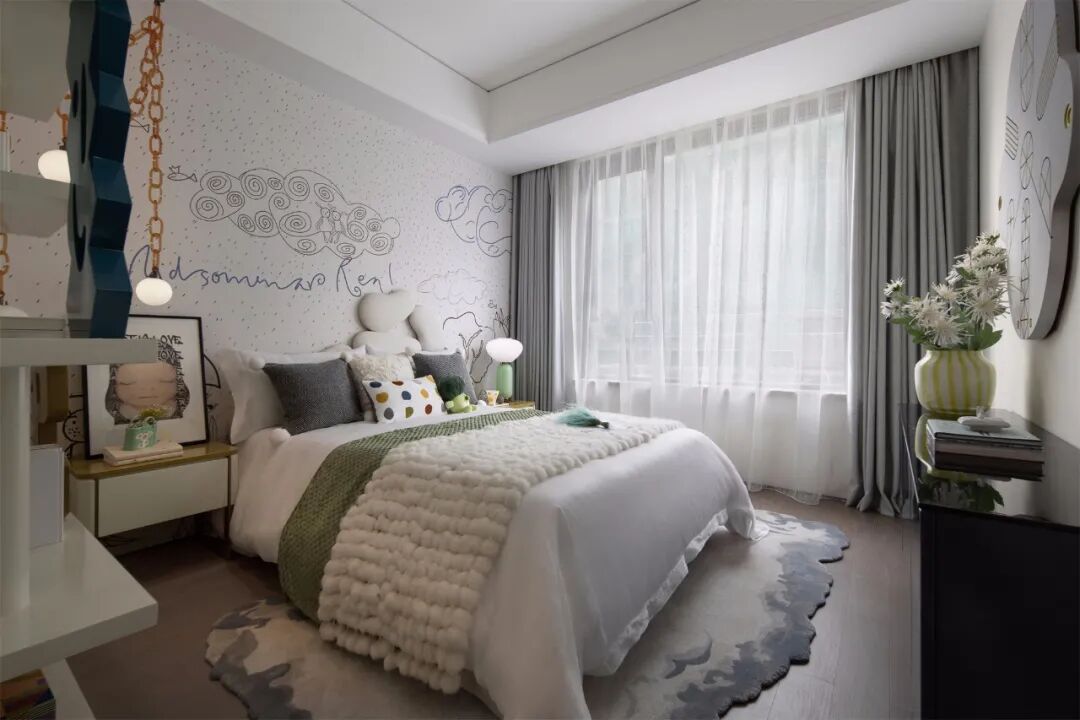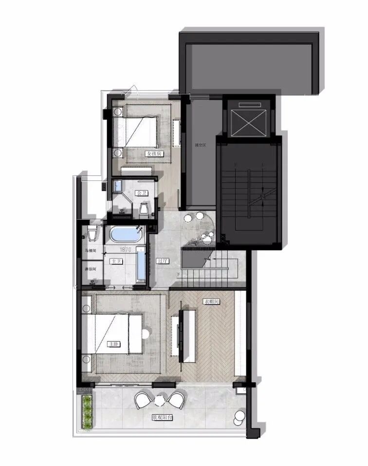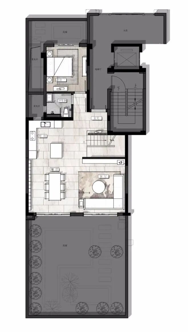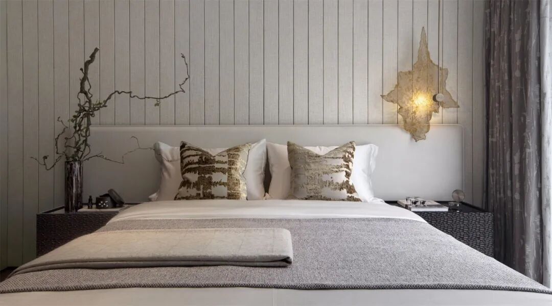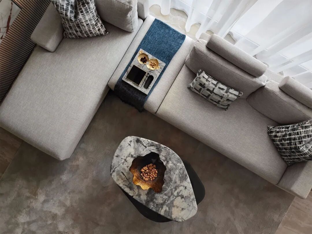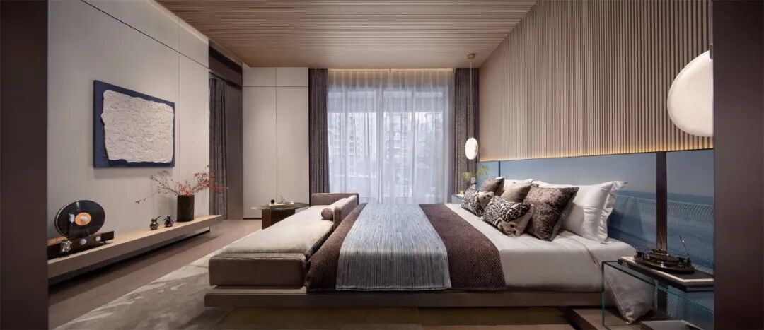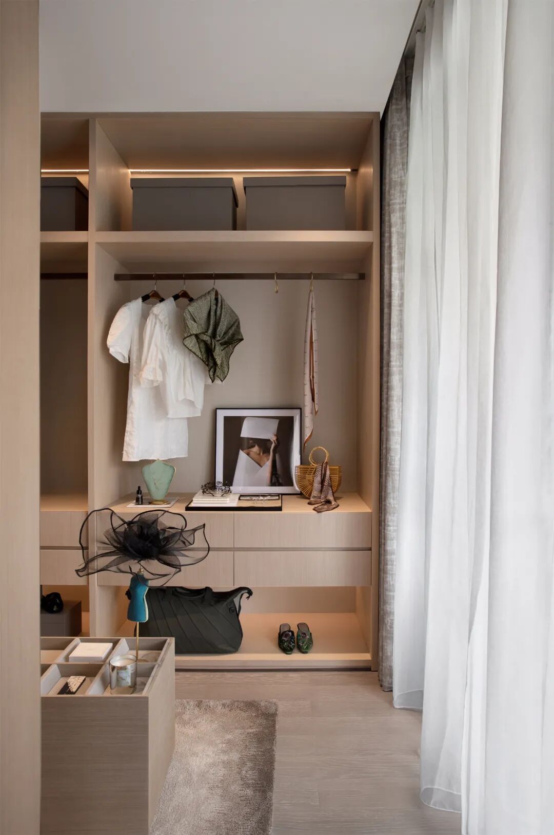 大理石的天然纹理所带来的质朴气息,中和木的轻盈,材质的柔软贯穿客厅、餐厅和厨房,灵动非常,且随着光影深浅和“人”自行的生活规律、时间习惯,衍生细微差别的氛围感。以自然为基点的糅合,通过知觉、感官和情绪,突破空间框架限制,达到一种平衡,力量和细腻,可能与不可能,都在其中,并借助理性逻辑塑造出一个有趣多变的意向空间。借助大自然的丰富形态,将人与自然、自然与空间合二为一,试图在引导人们在自然中寻找自我。